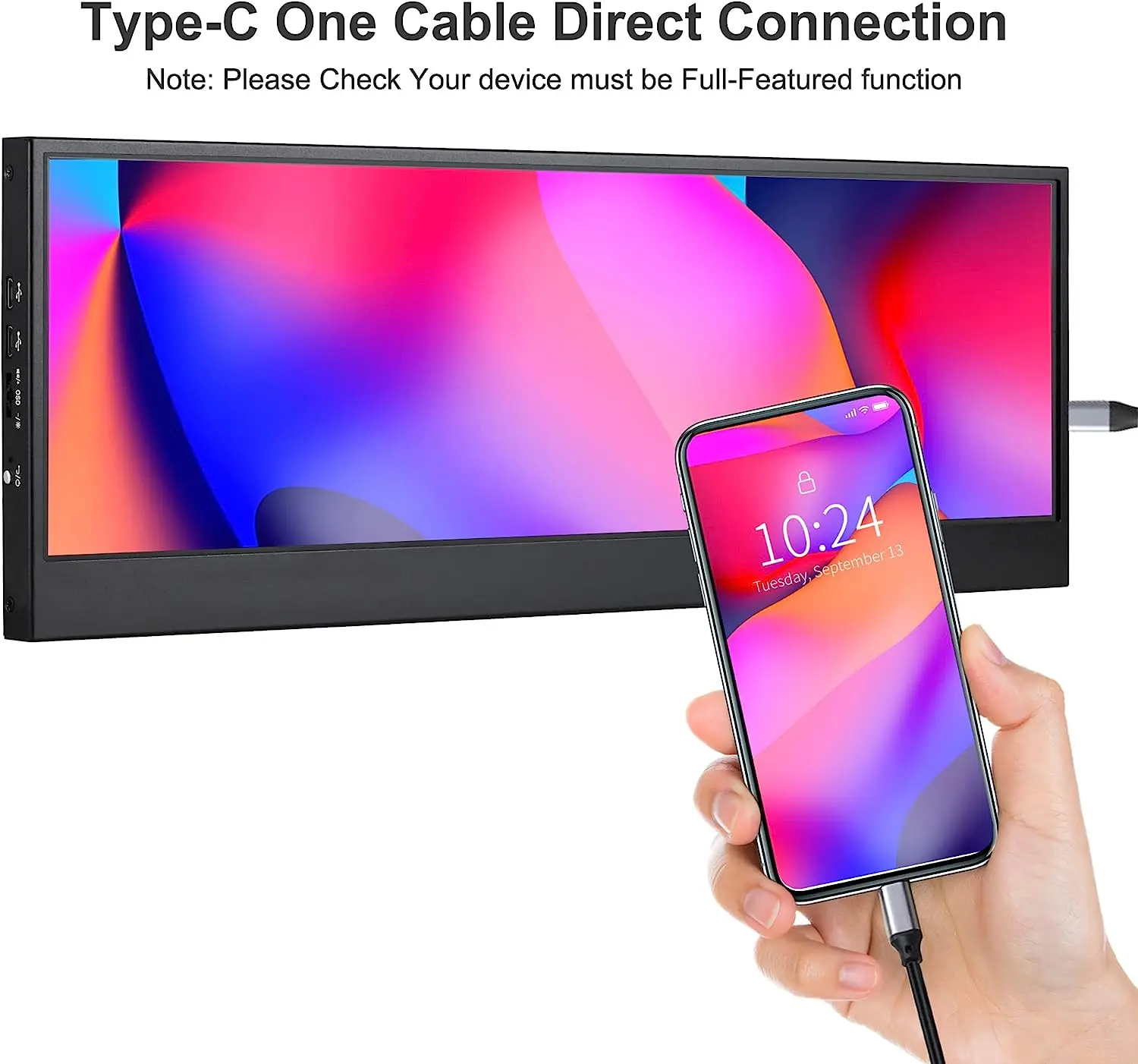 Ультрапортативный компактный дизайн Наш монитор представляет собой простой в использовании дизайн и оснащен интерфейсом USB/HDMI/Type-C.Легко настройте яркость, громкость, настройки дисплея и ориентацию экрана по своему вкусу.Подходит для профессионалов, программистов, студентов и т. д. Прежде чем использовать Type-C в качестве входного сигнала, убедитесь, что ваш телефон или устройство имеет интерфейс Type-C и поддерживает передачу аудио и видео (USB 3.1).*(Несовместимо с Thunderbolt, Mac, ios)