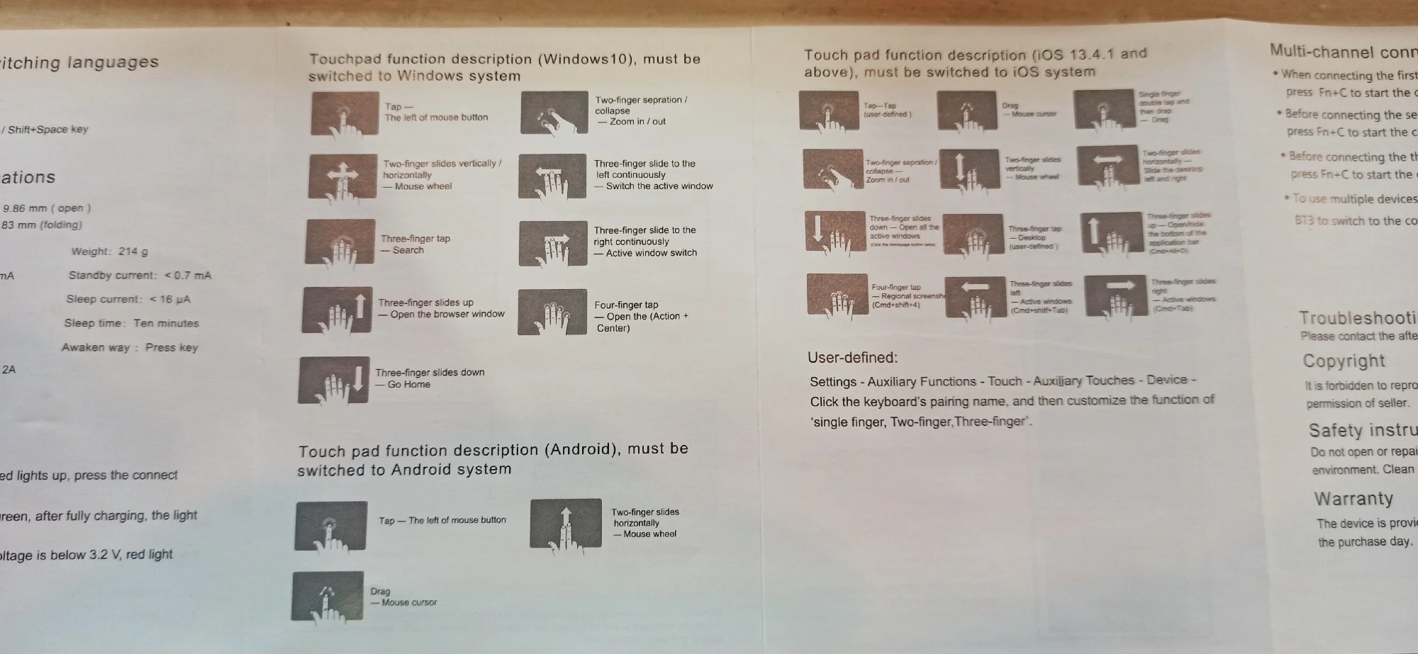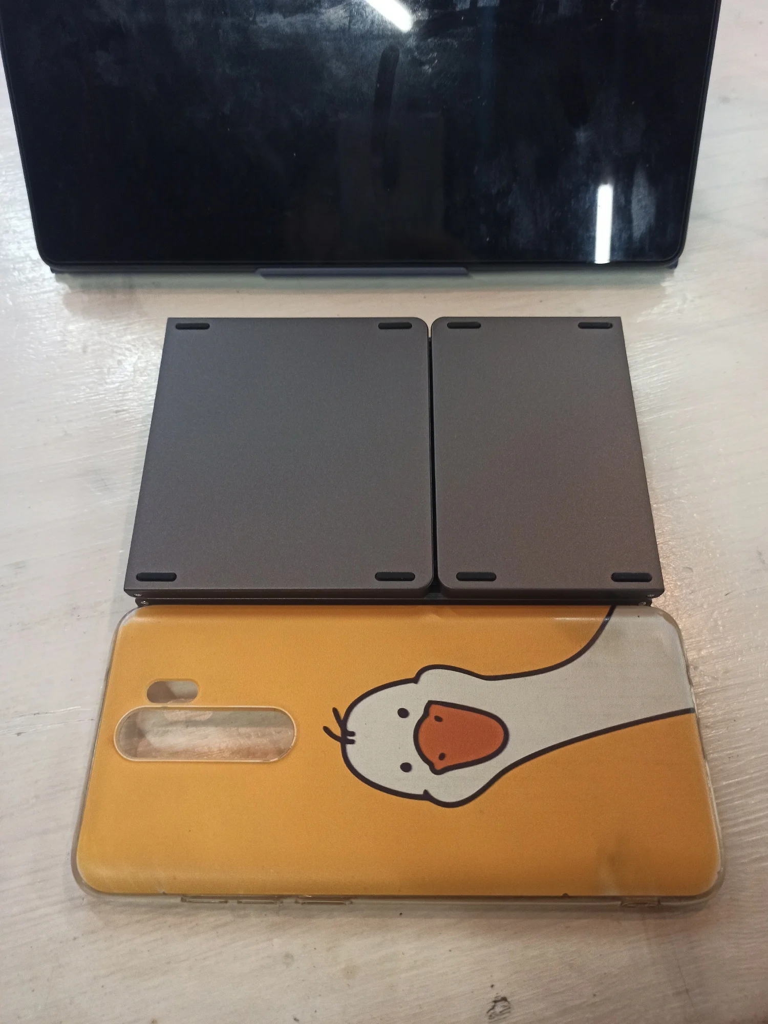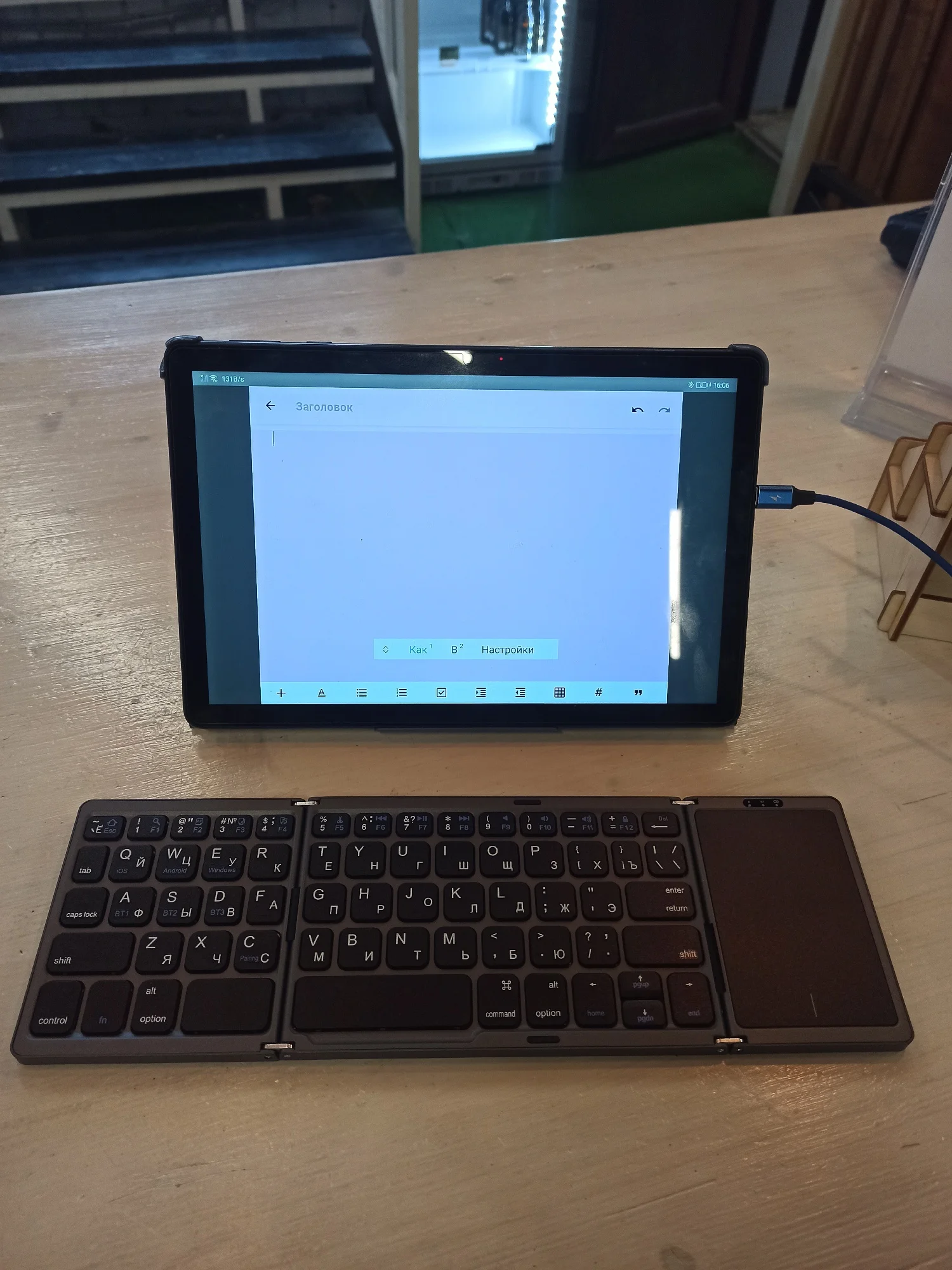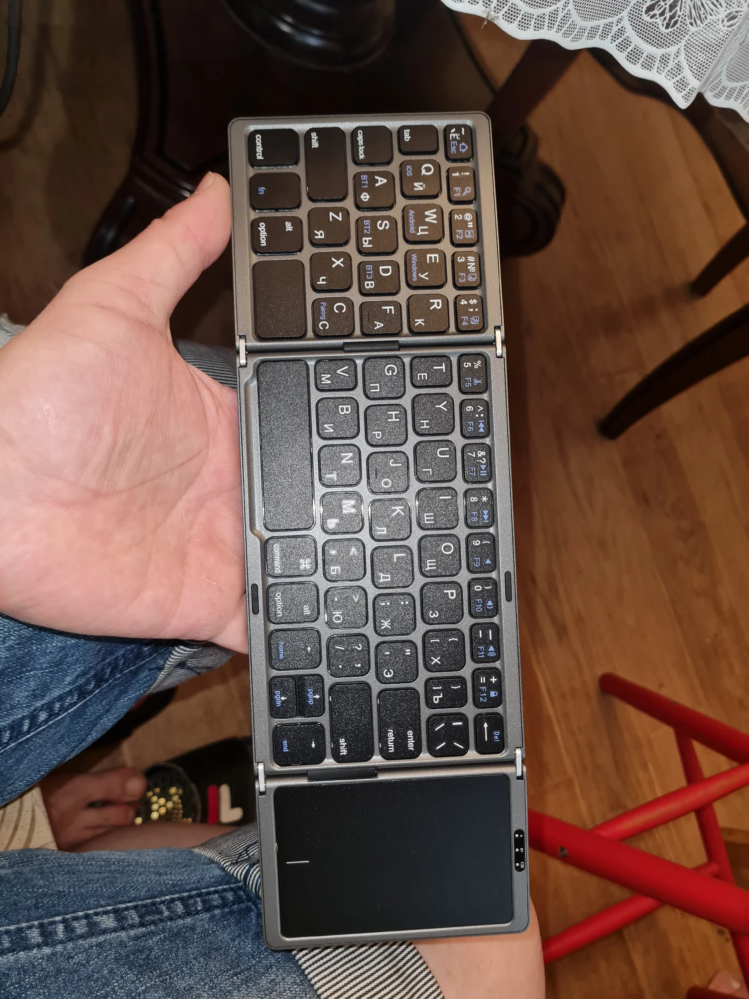 первые впечатления - положительные. клавиатура компактная, размером с Redmi note 8 pro. половинки удерживаются закрытыми с помощью магнитов. зарядка type-C. с планшетом Huawei и телефоном Xiaomi соединяется без проблем, только надо настроить раскладки в настройках андроида. тачпад поддерживает мультитач и жесты, очень удобно работать. хороший вариант если нужен "офис на бегу". к раскладке надо привыкать, из-за сгиба кнопки чуть смещены, два пробела... но оно того стоит.