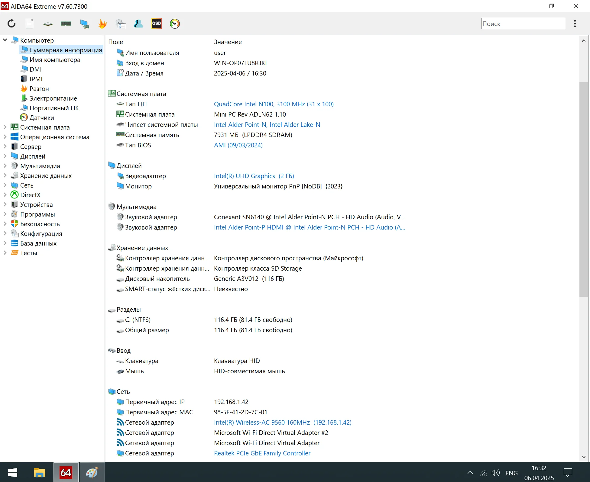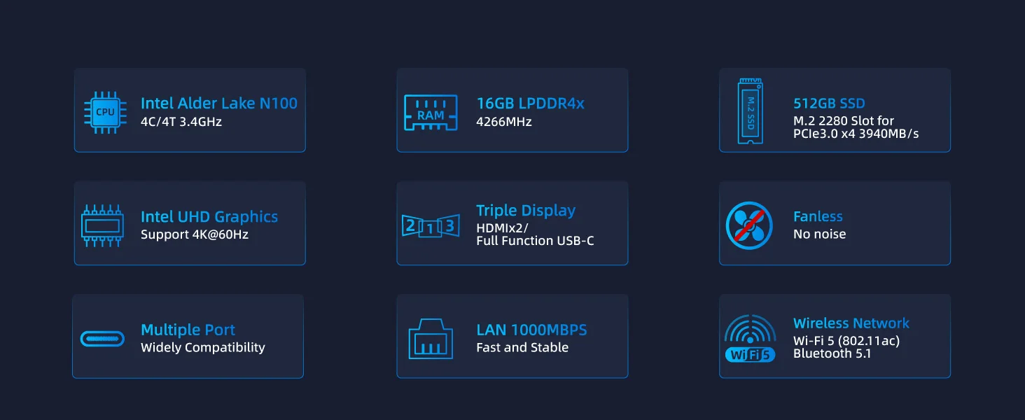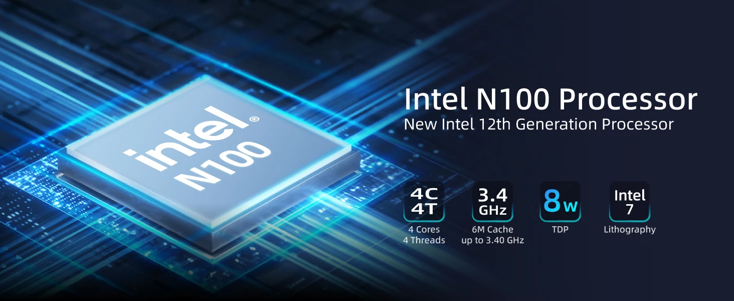 - Intel Alder Lake N100, 4 ядра, 4 потока, максимальная частота до 3,4 ГГц.Технология процесса 7 нм.