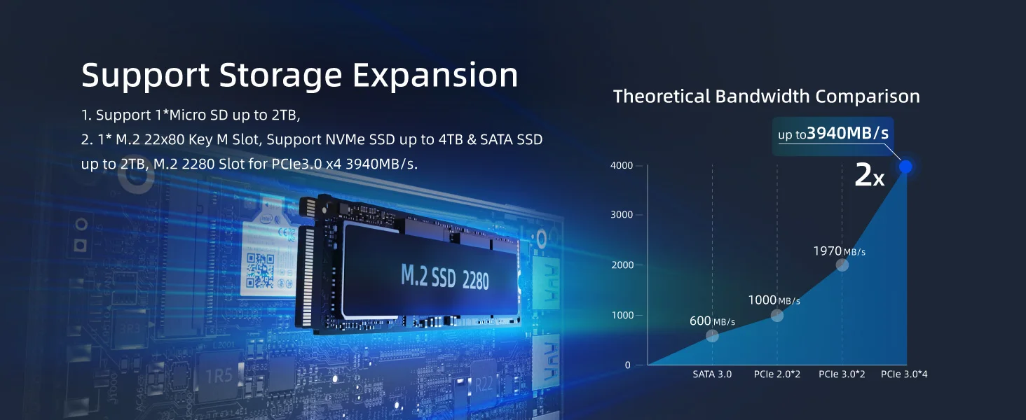 - Storage Expansion:1x Micro SD card Slot, 1x M.2 SSD Slot