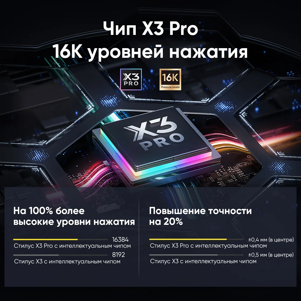 Представляем X3 Pro Smart Chip Stylus, который впервые в отрасли имеет Уровни давления 16K, что на 100% выше, чем у его аналогов, для более точных и плавных линий, чем когда-либо прежде,-превосходное создание с гипернюансами и не только.