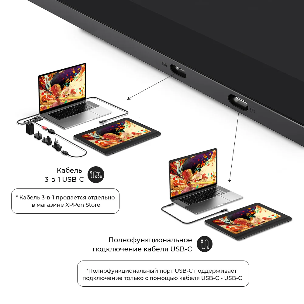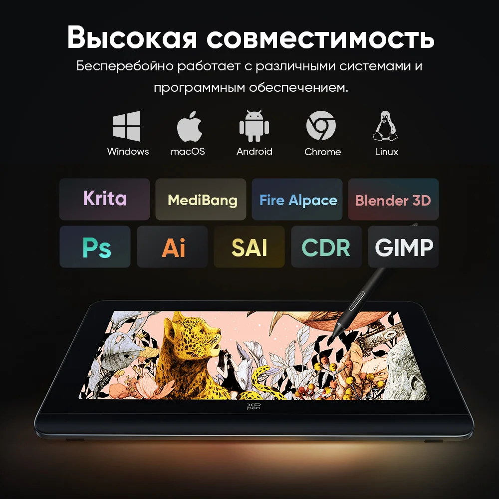 Совместимость с Windows 7 (или новее), macOS 10,10 (или новее), Android (USB3.1 DP1.2), Chrome OS 88 (или новее) и Linux. Поддержка популярного программного обеспечения для цифрового искусства, такого как Adobe Photoshop, Illustrator, SAI, CDR, GIMP, Krita, MediBang, FireAlpaca, Toonboom, Maya, Blender3D и т. Д.