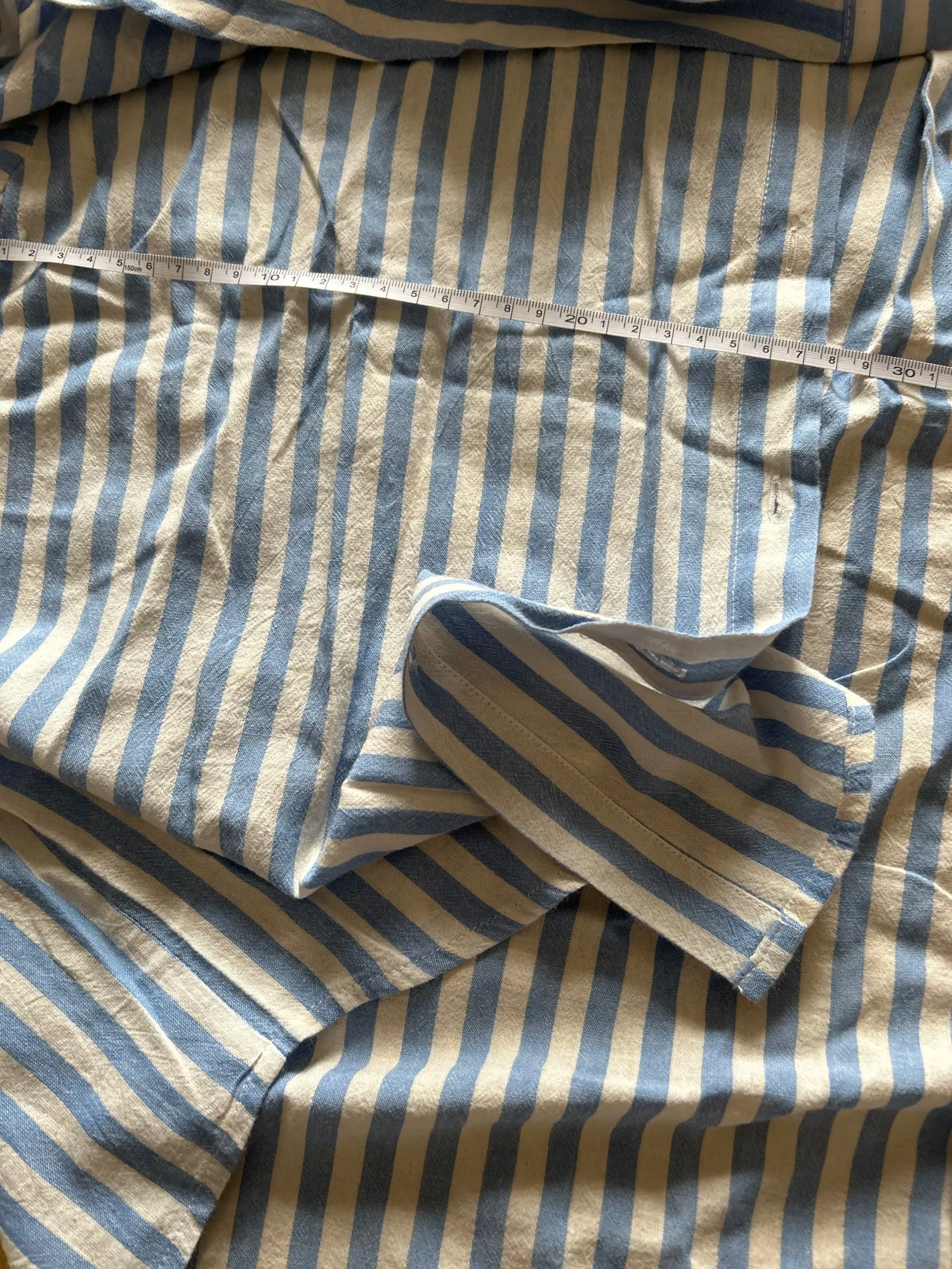 Суперская рубашка на лето! Лёгкая, дышащая, отлично гладится. На российский размер 46-48 рост 170 сидит свободно. Рукав и длина самой рубашки в самый раз, на рост 175 думаю тоже будет отлично. Цвет белых полосок действительно не кипельно белый, немного беж, но никакого ощущения грязности как писали в предыдущем отзыве нет. Отличная находка на лето!