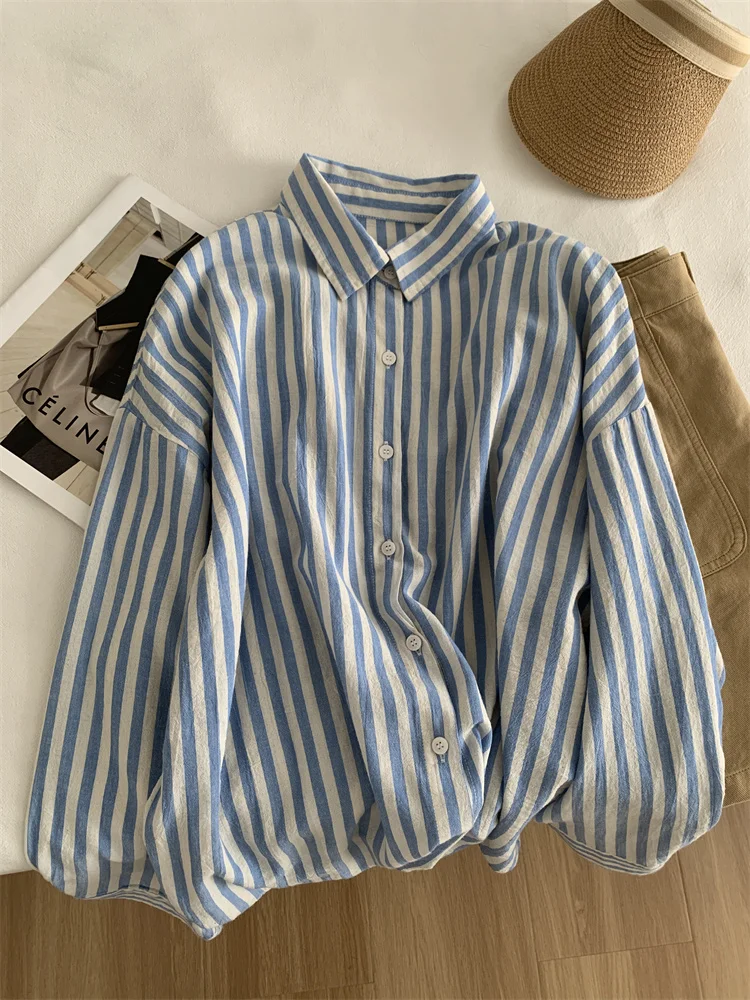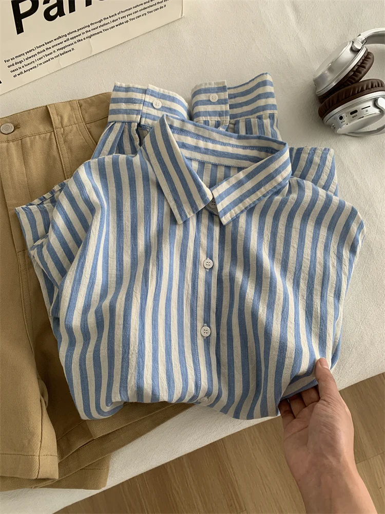 Blue Linen Striped Shirt for Women in Summer, Thin Sagging, Lazy and Slimming,...