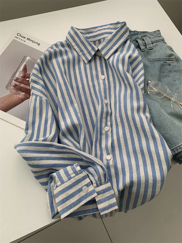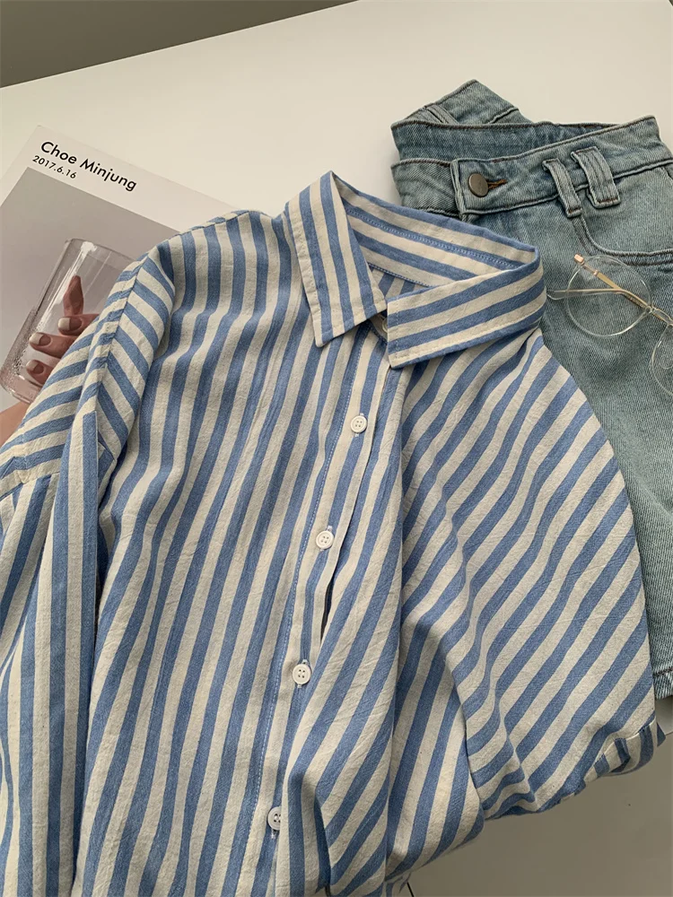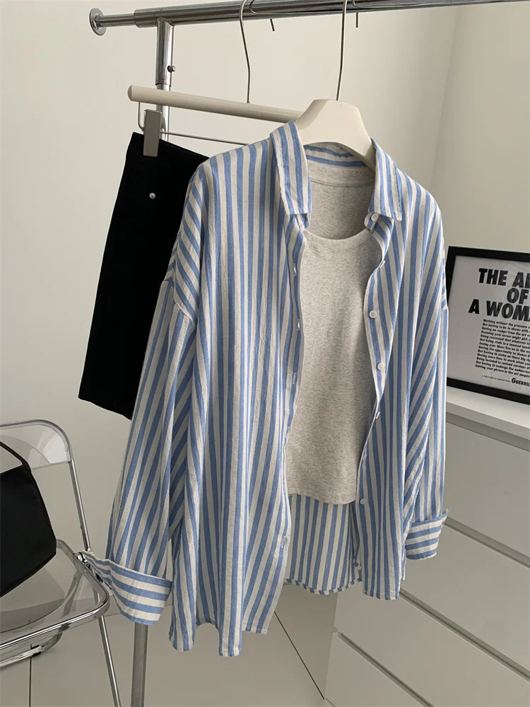 Синяя льняная полосатая рубашка для женщин летом, тонкая обвисшая, ленивая и утягивающая, солнцезащитная блузка