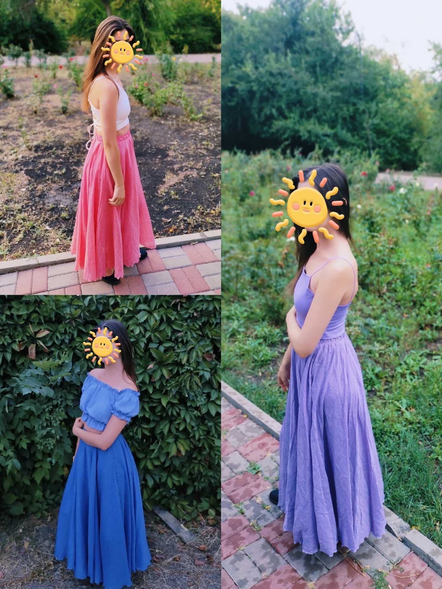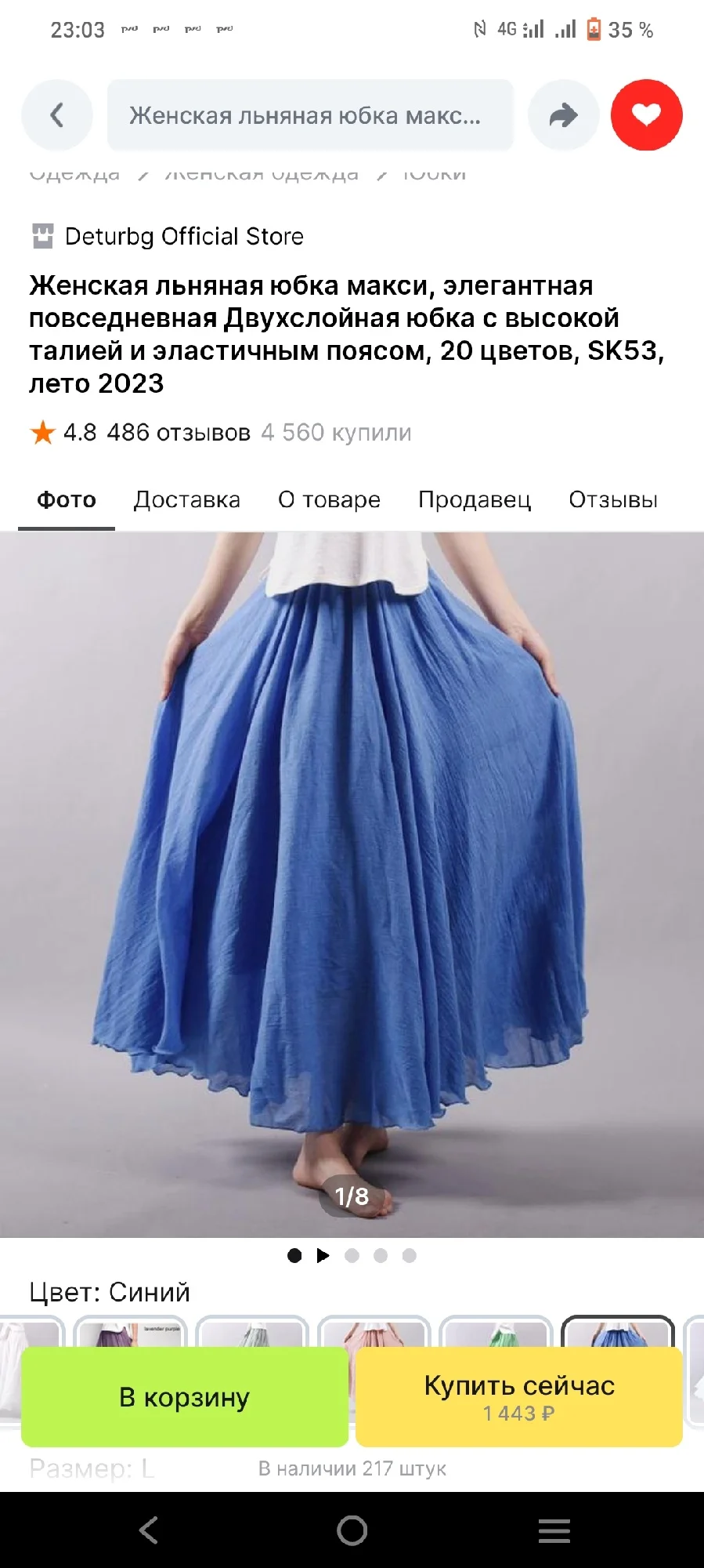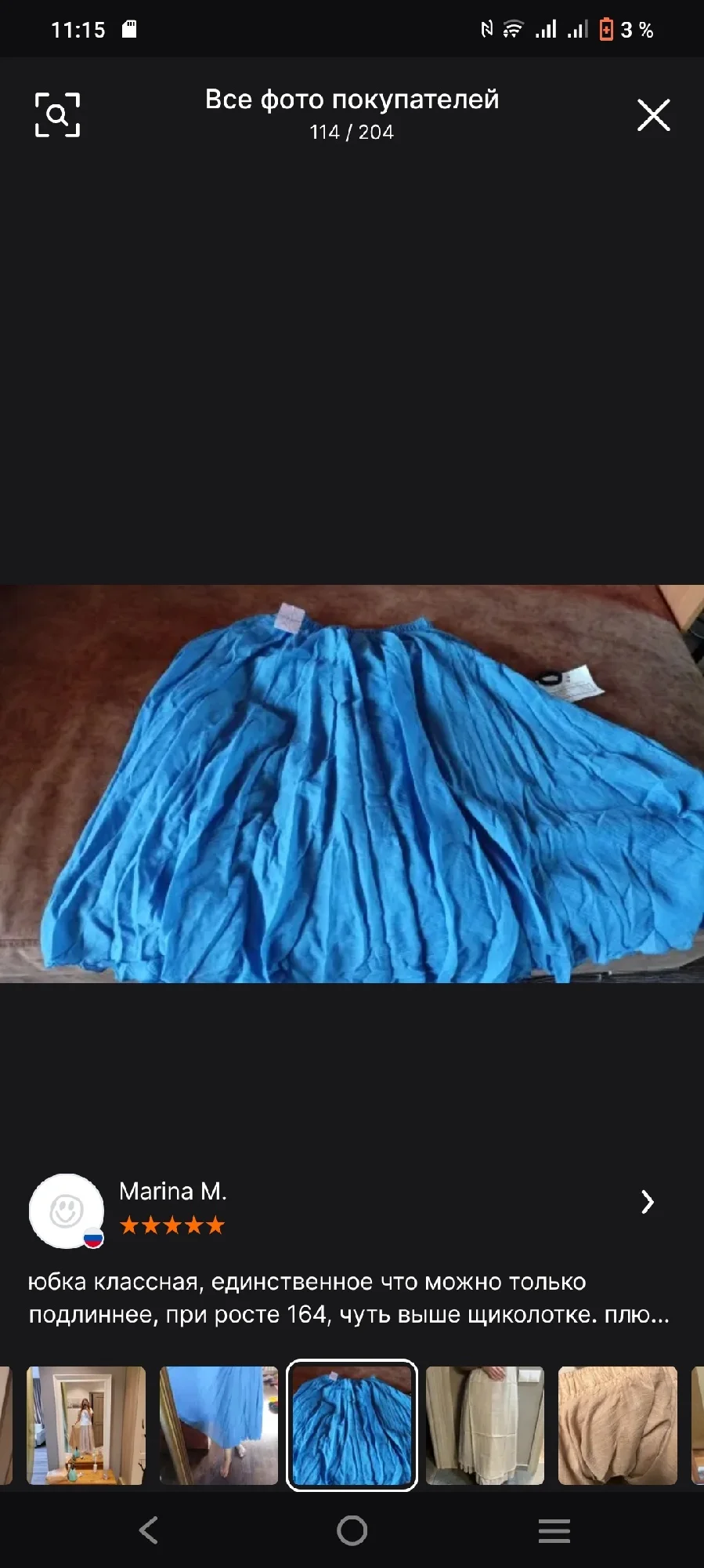 Брала 3 юбки, синюю, розовую и сиреневую/фиолетовую. Материал мне очень нравится, не очень на лен похоже, ну может лёгкий хлопок или папин, но ткань замечательная, я в 36° жары испытала её, создаётся вентиляция, ветерок и защищает от солнца, кожа совсем не потеет, в отличие от шорт или мини-юбок, где пот в три ручья. Пошито качественно все три юбки, по цвету вживую мне больше всего понравилась сиреневая, хоть я и не ношу такие цвета, но её у меня выпросили, в итоге одну сиреневую подарила родственнице, и такую же ещё заказала для подарка другой на д.р. Для себя больше всего хотела эту синюю/голубую, но вживую она оказалась не такого цвета как на фото продавца и на фото отзывах покупателей. У покупателей она более голубая (какую я хотела), в итоге пришла более синяя (мне не совсем идёт этот оттенок), поэтому одну звезду сняла. Видимо партии разные и цвета могут отличаться. Фото с разным освещением прикладываю. (На последних двух фото 9,10 - фото другого покупателя и фото продавца, цвета отличаются с тем, что мне пришло).4655 u. 11 июля 2024