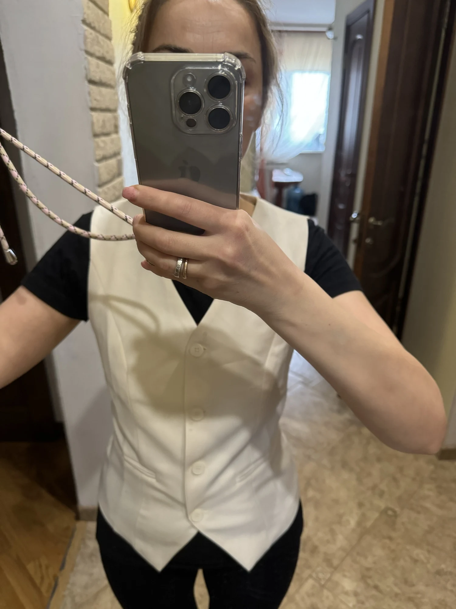 Жилет хороший, на 84-68-94 заказала S, продавец советовал М, я рискнула так как не было размера. Сидит в притык, М был бы лучше. Цвет скорее бежевый, или кремовый.