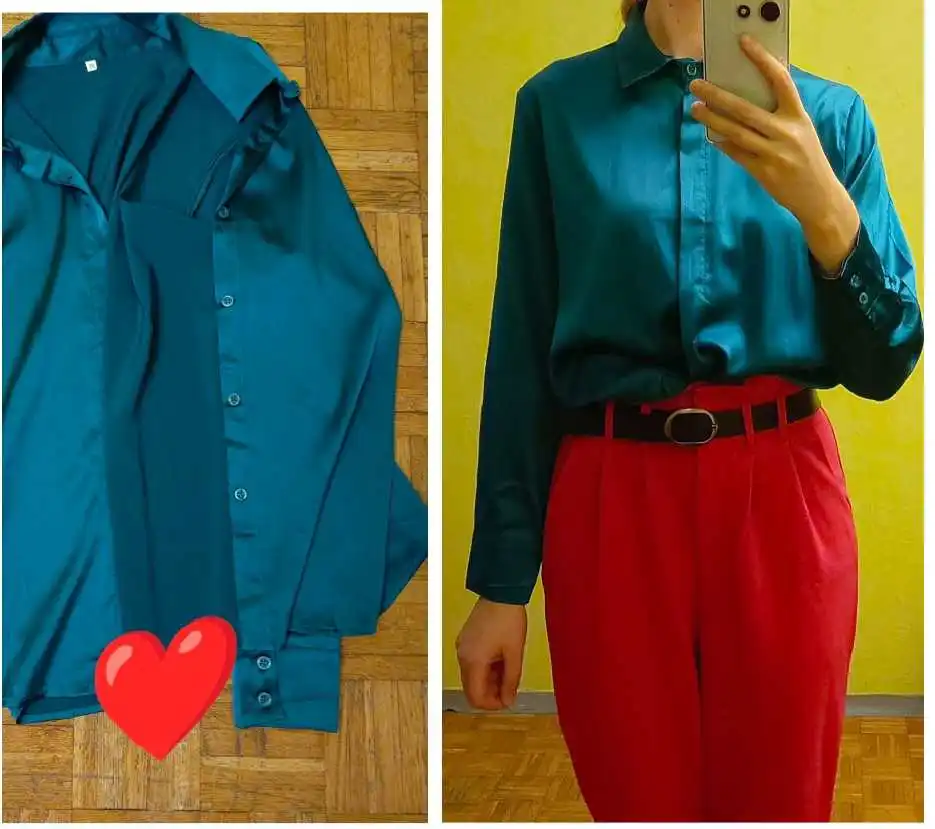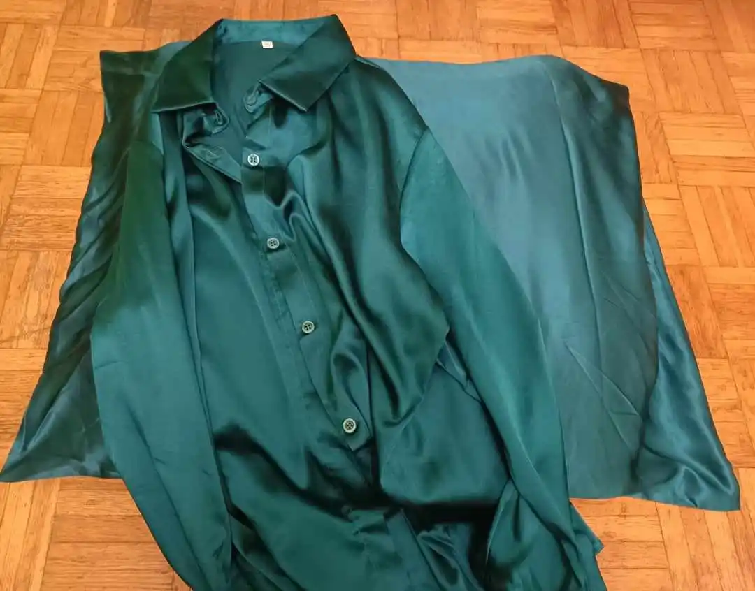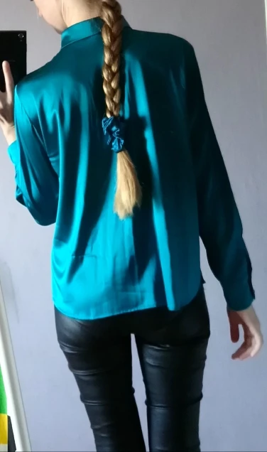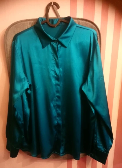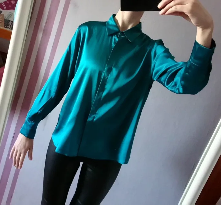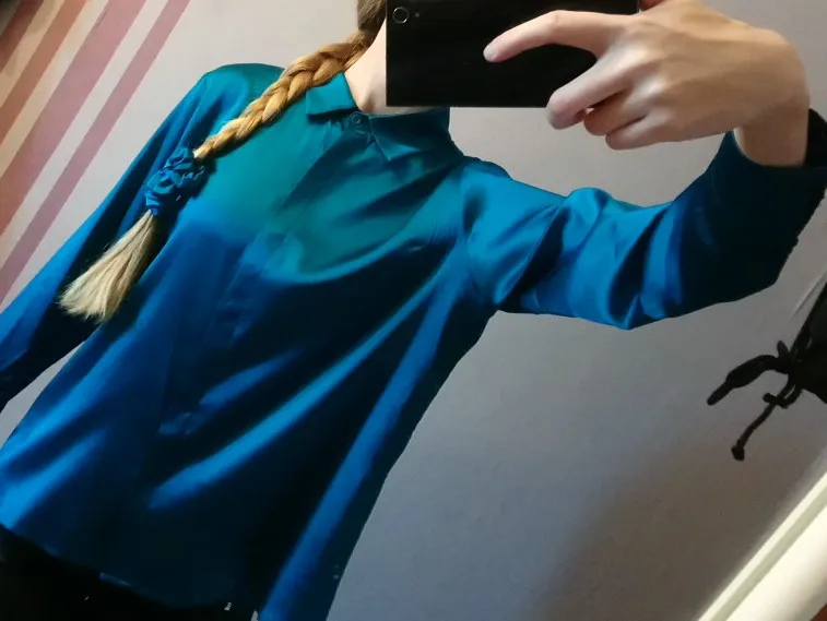 Посылка пришла очень быстро до двух недель. На рост 174см, вес 60кг, 87-70-94, хотела взять самый большой размер, но не было в наличии. взяла размер XL. Рукав впритык, линия плеча тоже, попу не прикрывает полностью, там где тело, довольно таки широкая рубашка. Тесть тут азиатские размеры, в шёлке мне хочется больше свободы, пространства, я для себя решила , что буду брать в этом магазине XXL. Состав указан шелк, судя по тому как отпариватель сложно справляется, думаю шелк. Продавец очень общительный, в подарок положил шелковые носки и купон на следующую покупку. Резинка на фото тоже с этого магазина. Цвет безумно -красивый, благородный бирюзовый. На фото, больше уходит в синеву. Дополнительные фото и отзыв, дополню позже. Однозначно советую и магазин и продавца!!! Носила уже раз 5. Если снимать аккуратно и вешать на тремпель, то не нуждается в дополнительной глажке