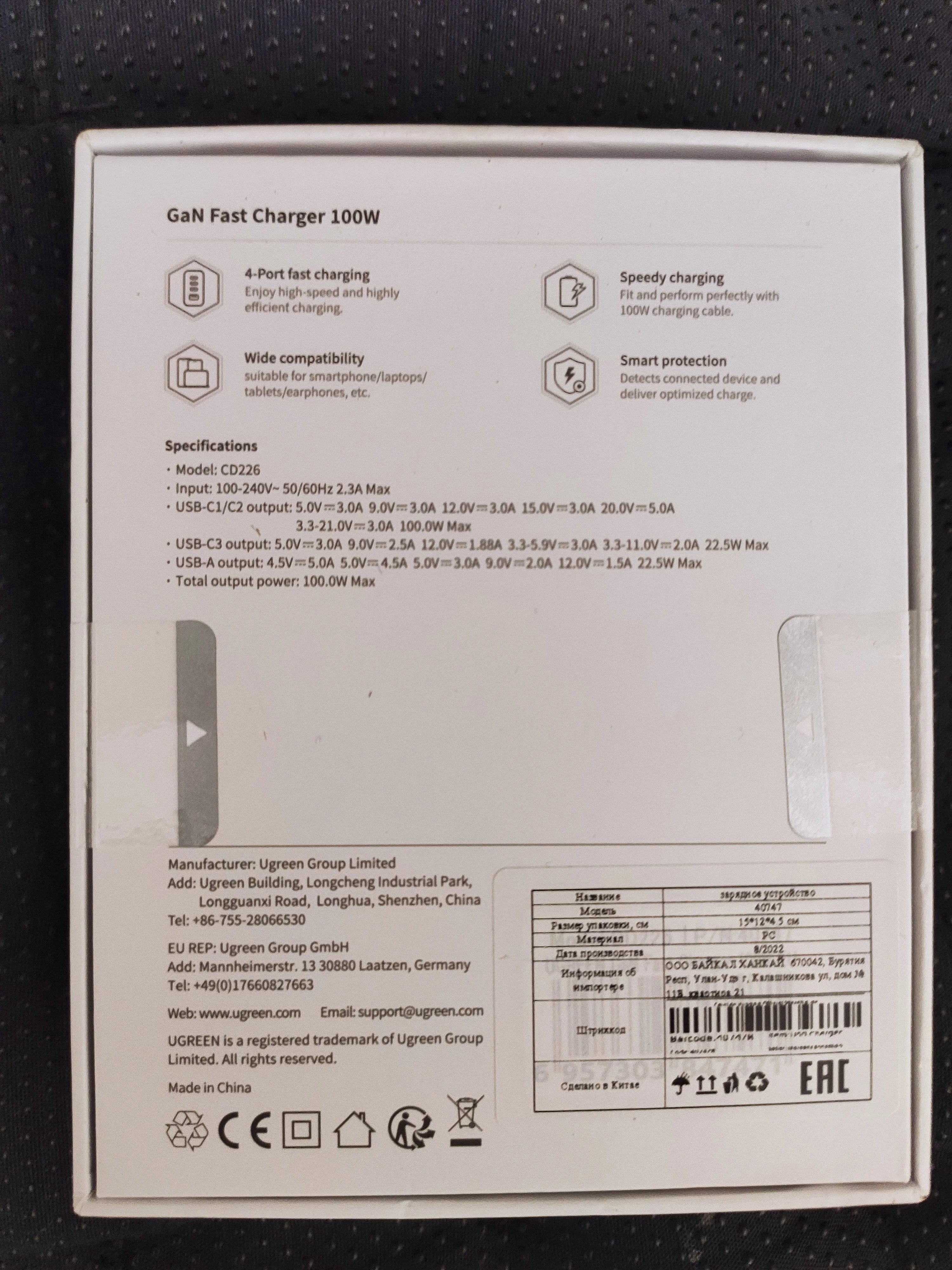 Качество конечно товара на высоком уровне! Ми9 лайт заряжает быстрой зарядкой. Ноутбук Ноутбук HP Pavilion 15-eg1006ur точно заряжает, через разъем tipe-c с функцией Power Delivery. Через фирменную докстанцию HP заряжать ноут не захотел. Не грелся. Несколько устройства заряжать не пробовал. Продавец немного мухлюет с доставкой, отправляет Почтой России хотя при заказе выбираешь 5Post. В результате доставка не самая быстрая. Это относится ко всем товарам, которые я заказывал у этого продавца. Коробка зарядника была в фирменном почтовом пакете UGREEN но без пупырок. Провод вложен вместе с коробкой.