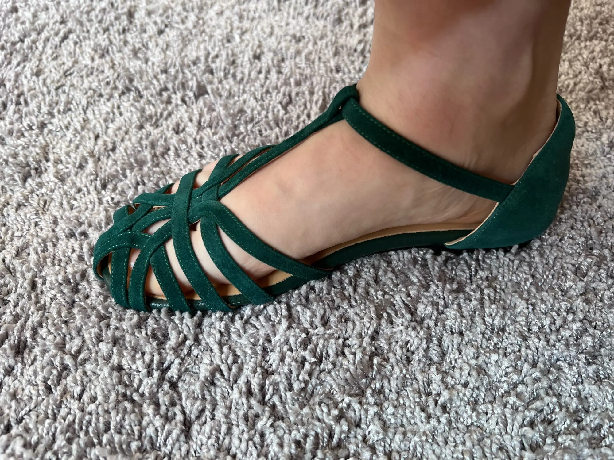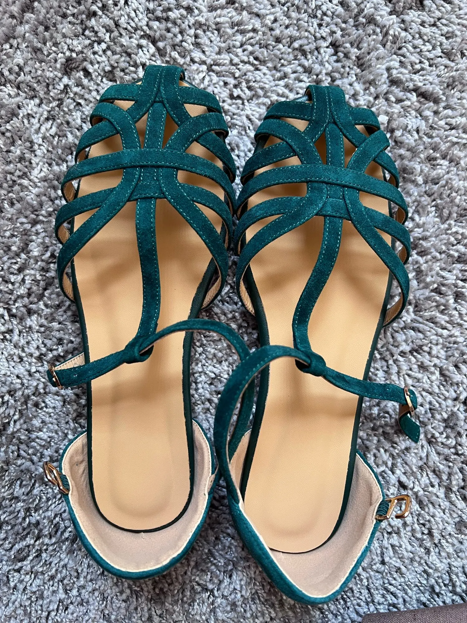 Women's natural suede leather narrow band braided t-strap flats sandals round...