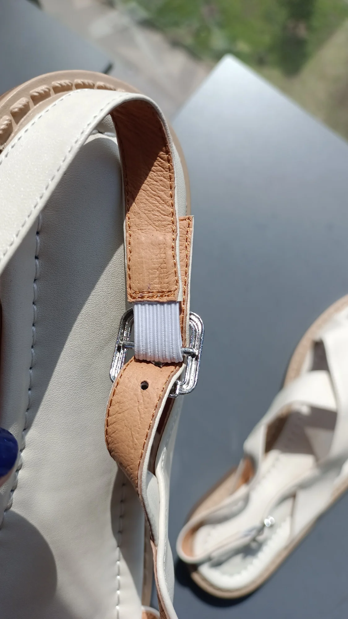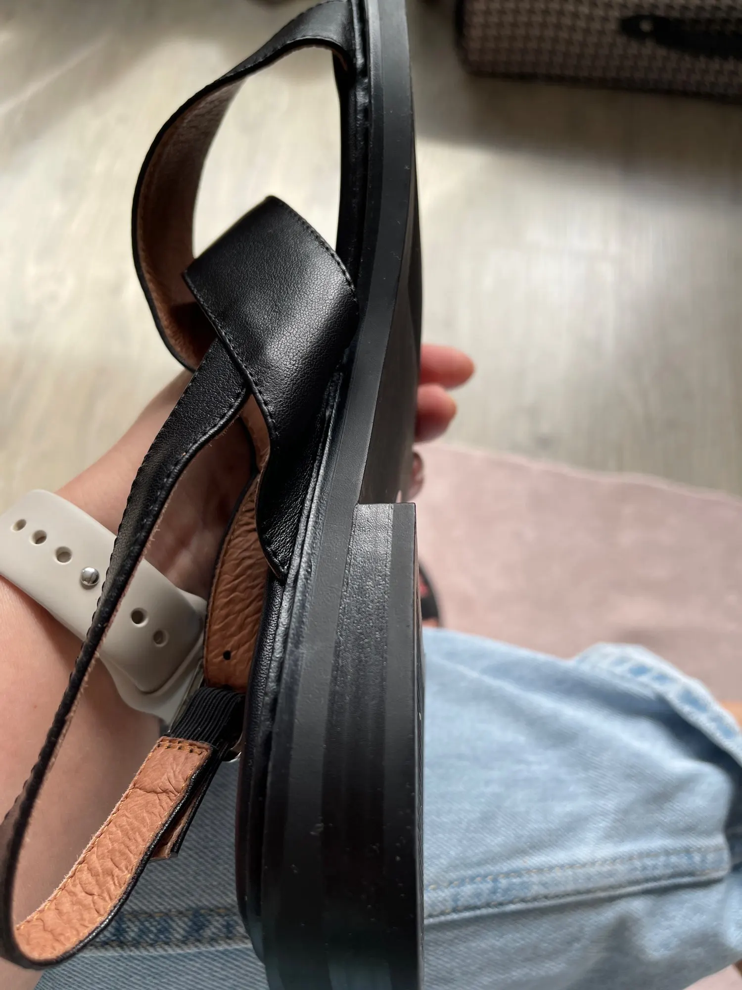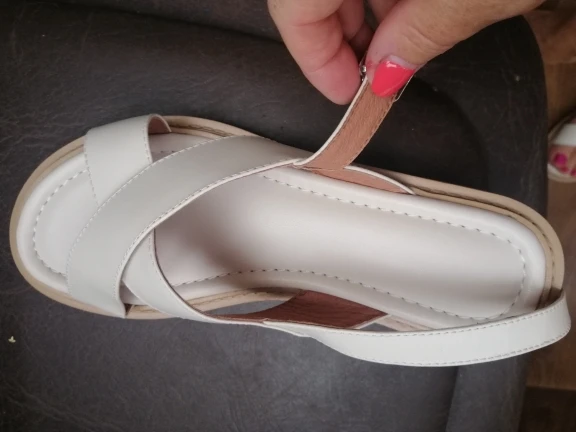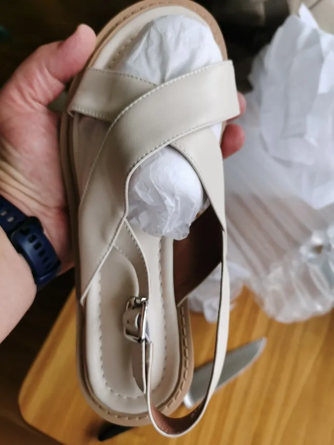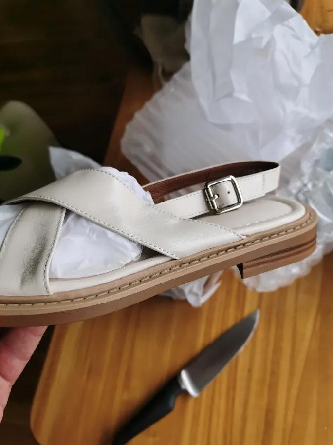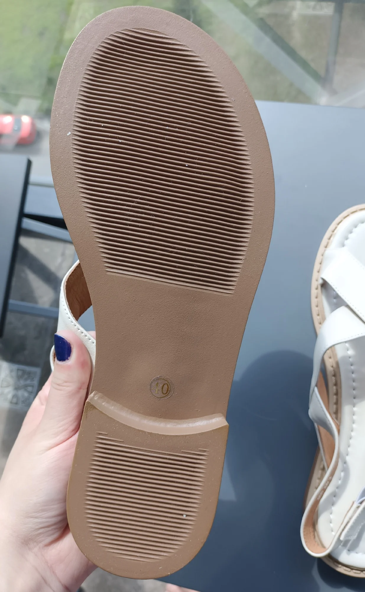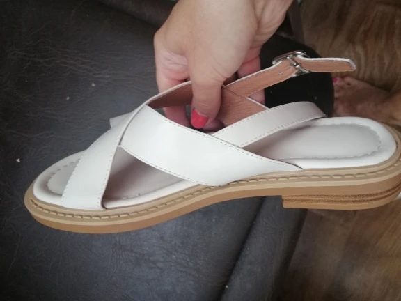 Сандалии реально крутые! Классные, удобные очень. На широкую стопу 24,5 взяла 39 размер, сели как надо. Пальцы не торчат, не соскальзывают. Сидят на ноге не вплотную, свободно, но при ходьбе комфортно. За такую цену(2500) прям подарок! Упакованы отлично, ничего не помялось! Следов клея нет, пахнут кожей. Я очень довольна покупкой! Возьму белые ещё! Продавцу респект! И благодарности!Maria K. 18 июля 2022