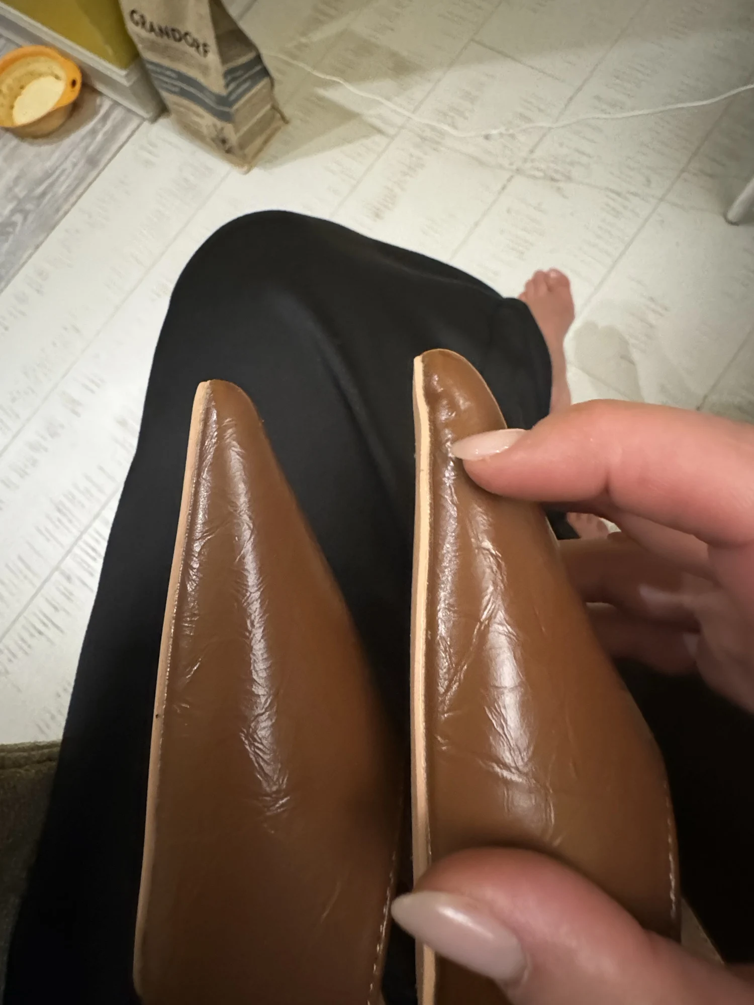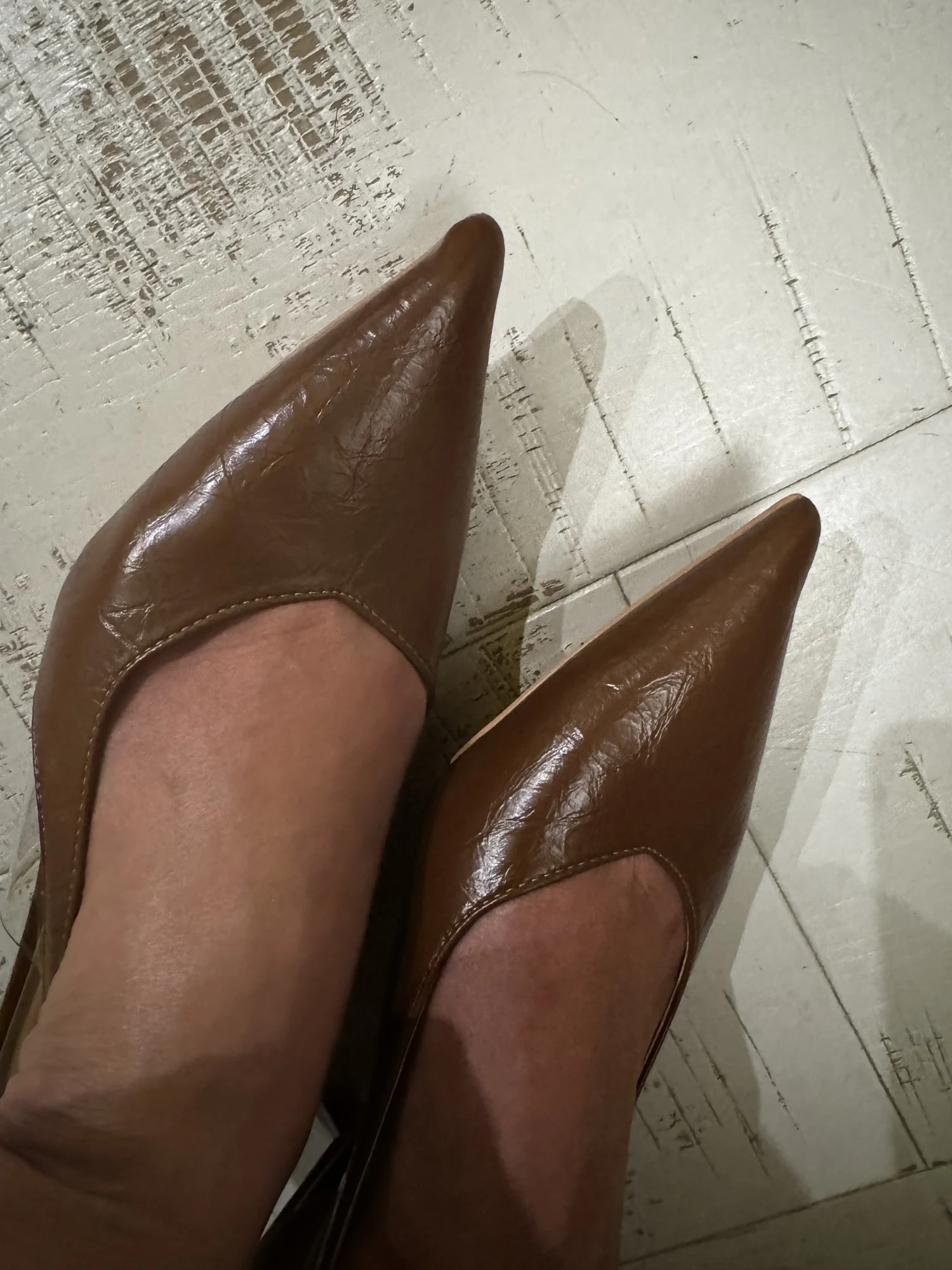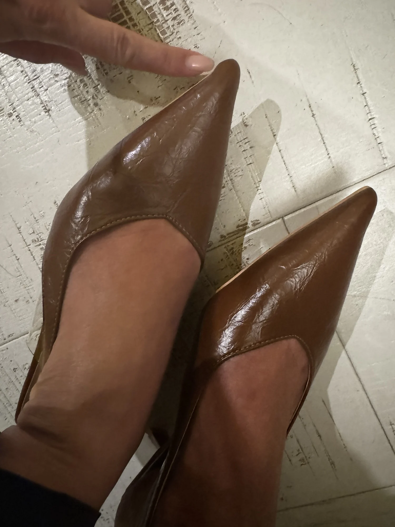 веачале не заметила, а потом как заметила и все, брак. на одной туфле спереди горбатый нос, как клюв, носить это не представляется возможным, хотя сами по себе туфли мягкие и приятные