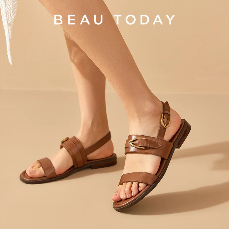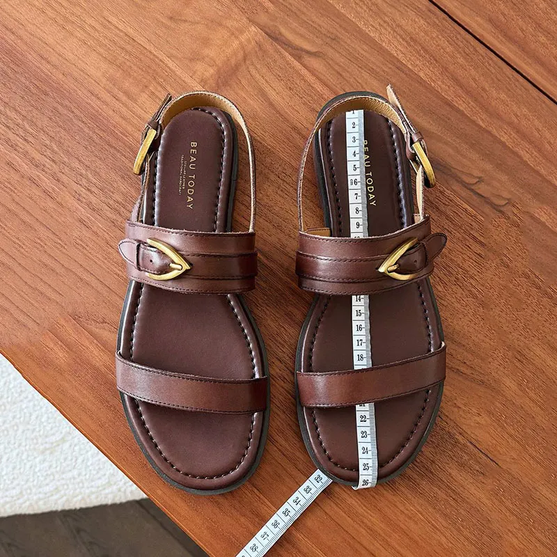 BEAUTODAY Сандалии на плоской подошве из натуральной кожи с металлической пряжкой Decro Летняя женская обувь на низком каблуке с открытой пяткой в стиле ретро 32426