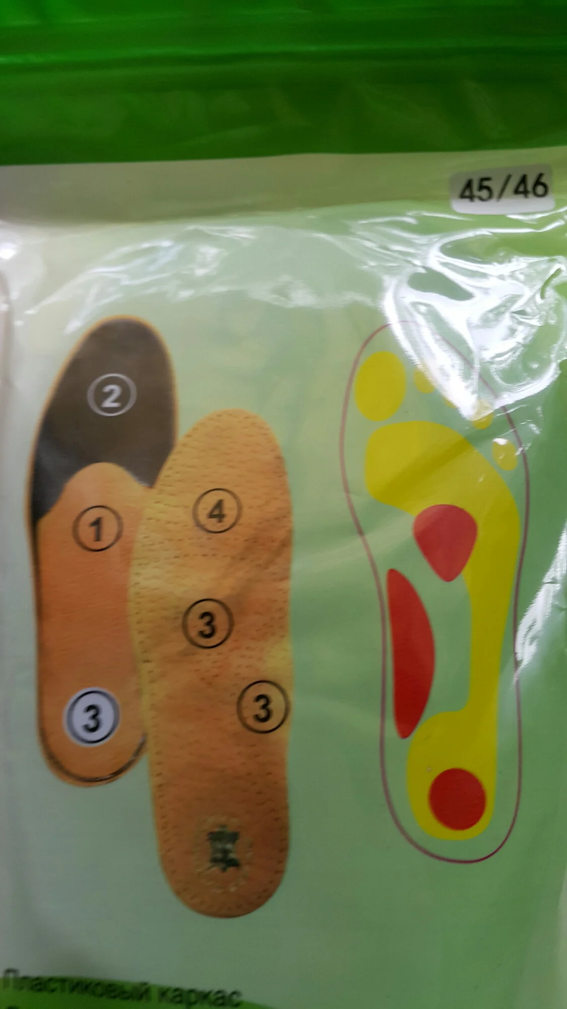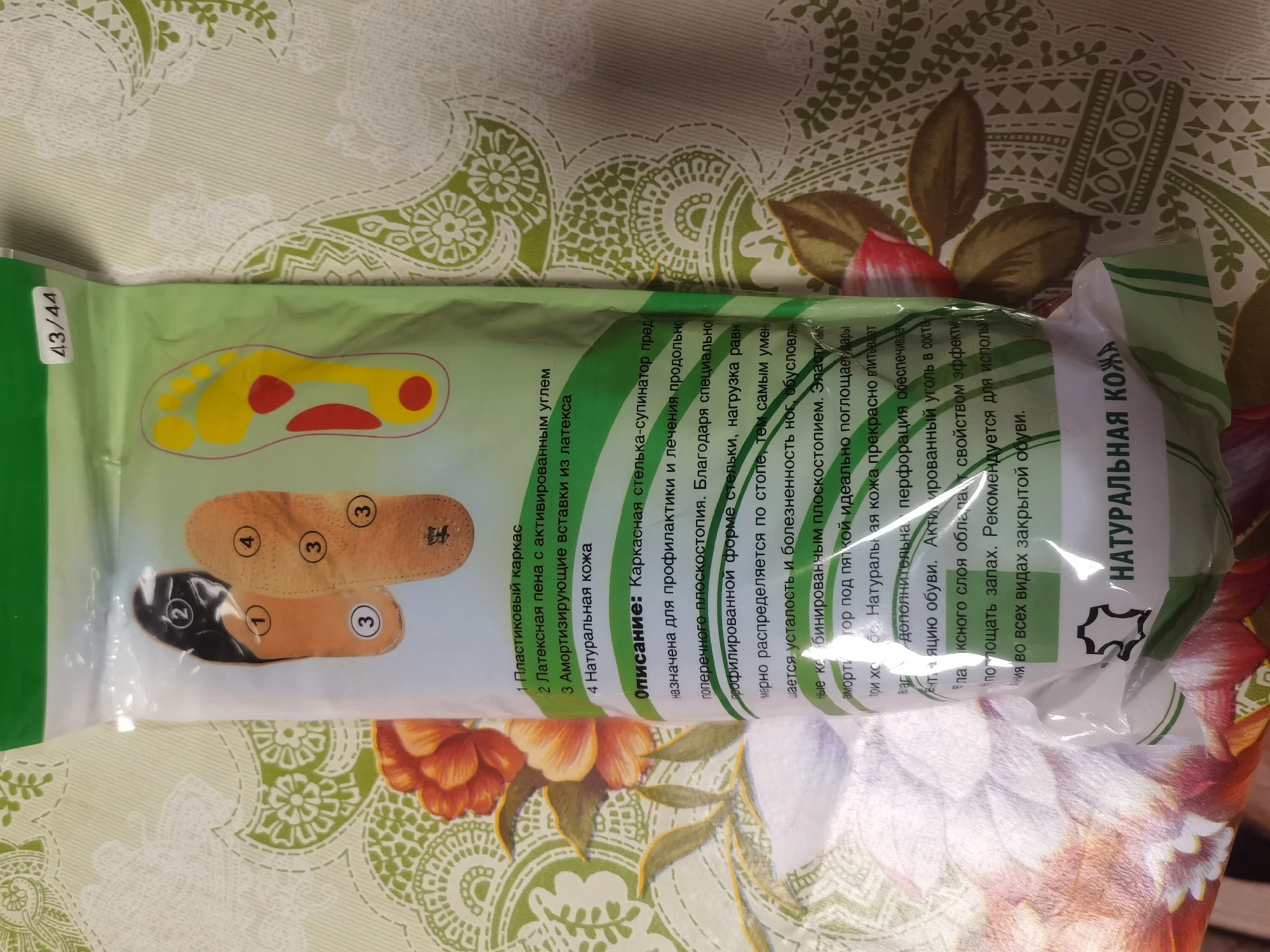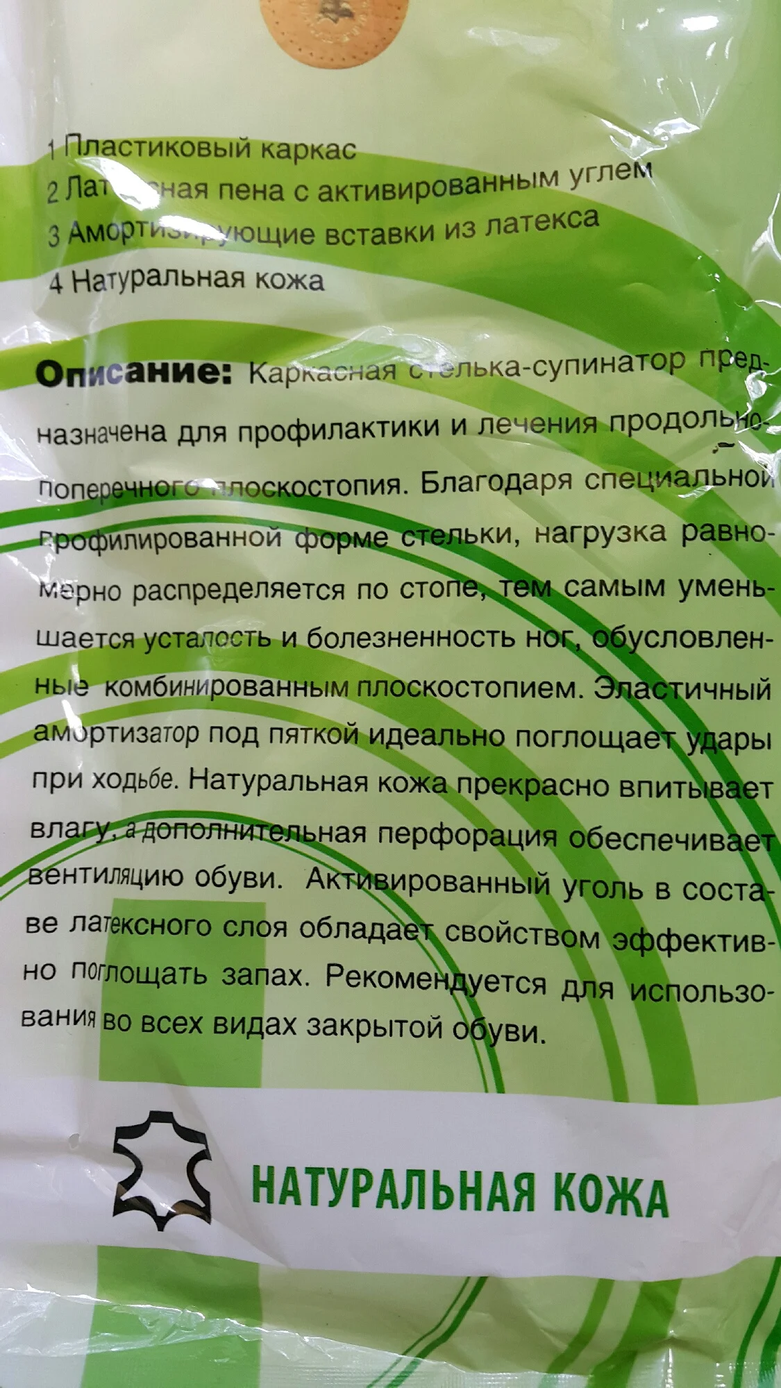 Доставка в постамат за 9 дней. Цена 300р. Натуральная кожа толщиной 1.5мм наклеена на мыгкую резиноподобную подложку 1.5мм. А также в месте ступни наклеен пластиковый, довольно сильный прогиб от плоскостопия. Конструкия довольно жёсткая. На самой пятке - мягкий кружок супинатора. с обратной стороны. Сделано качественно. На упаковке - все надписи на русском языке.Andrey Valerievich D. 5 мая 2024
