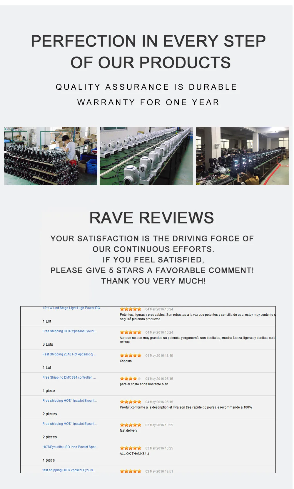Отлично собраны, пластик прочный. Внешне выглядят прилично. Пришли на 10 дней раньше, в хорошей упаковке, без повреждений. Курьерская доставка на дом. Инструкция на английском языке, особенно ценно, что четко расписаны каналы DMX. Пока не включал, напишу позже. Продавца рекомендую!9007 u. 8 ноября 2023