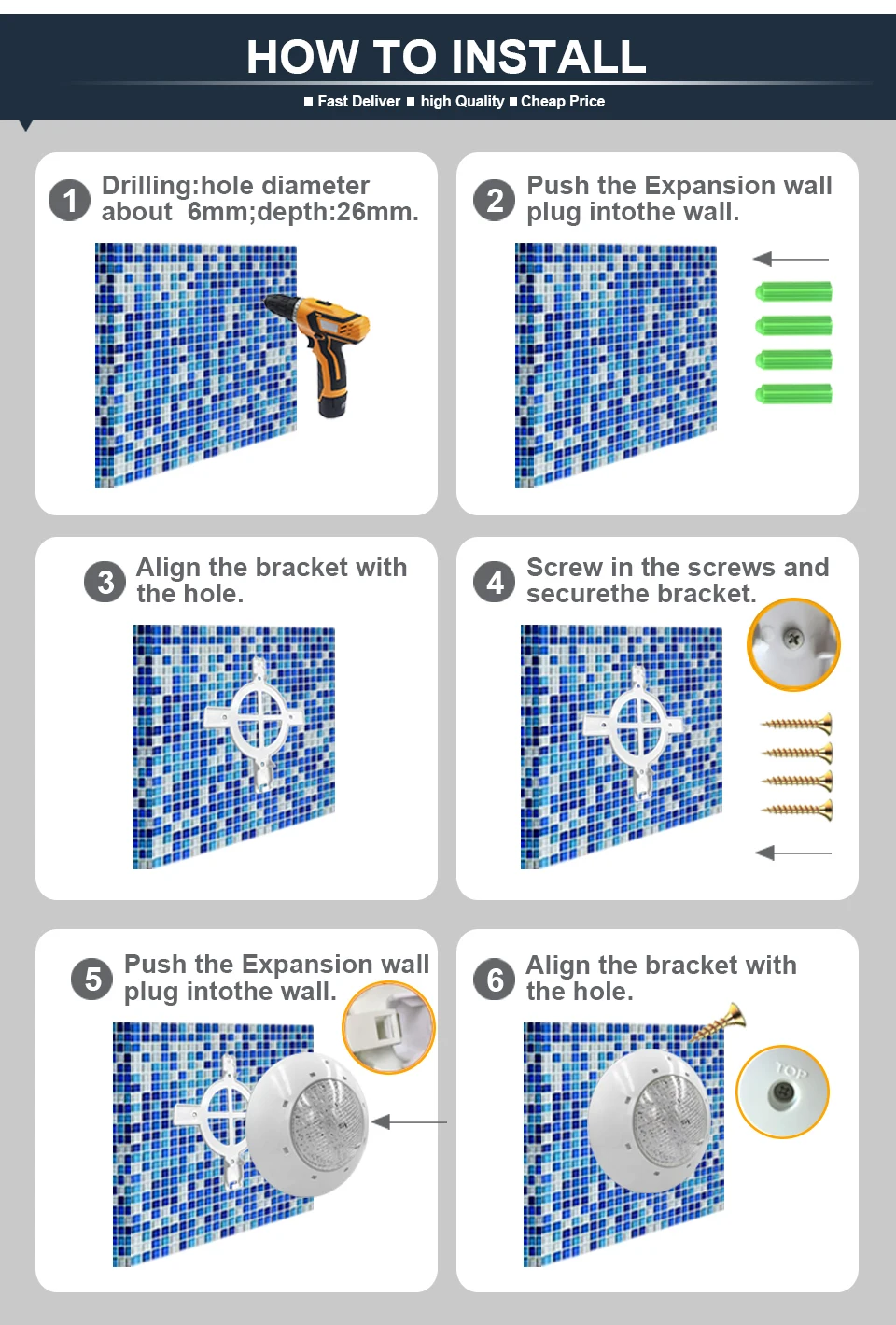 Настенный анкерный пластик очень хрупкий, светодиодные лампы невозможно отделить от внешней оболочки, как указано в инструкции, из-за того, что невозможно установить полностью растянутый кабель, который должен быть таким образом, чтобы избежать необходимости пустой бассейн, Вам придется кататься на нем, потому что если вы не пропустите кабель за верхним винтом якоря.