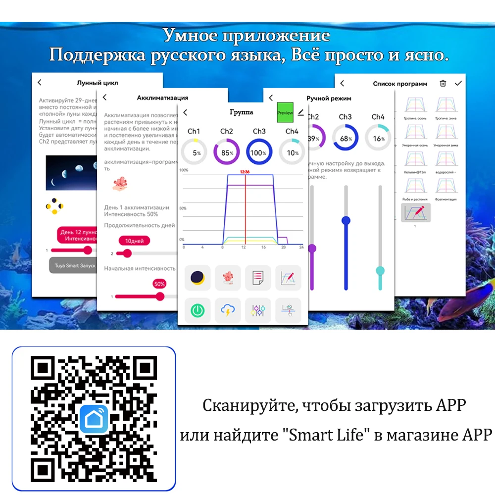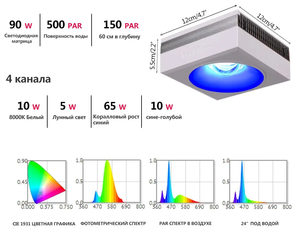 4 канала создают неограниченное количество спектральных комбинаций, чтобы соответствовать самым строгим требованиям вашего аквариума.