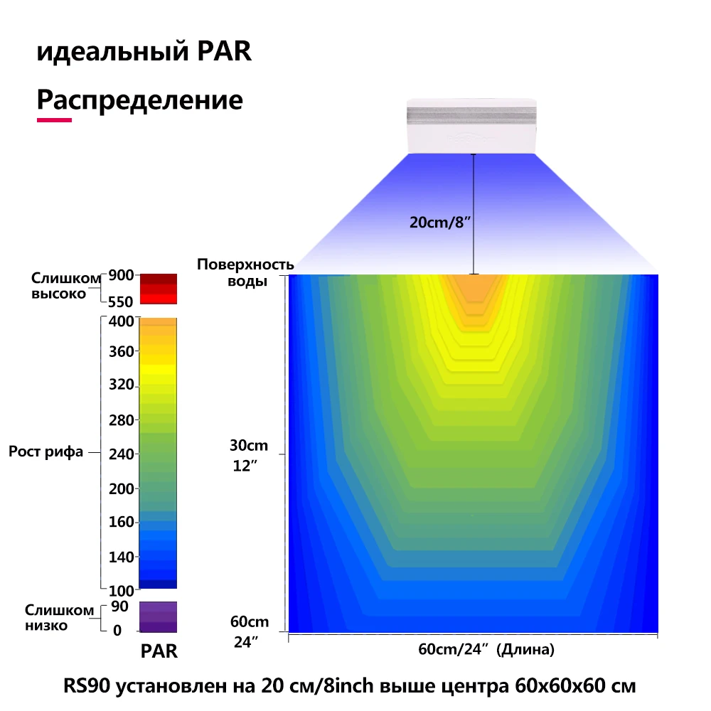 Свет RL90 обеспечивает идеальные значения PAR по всему аквариуму для роста кораллов.