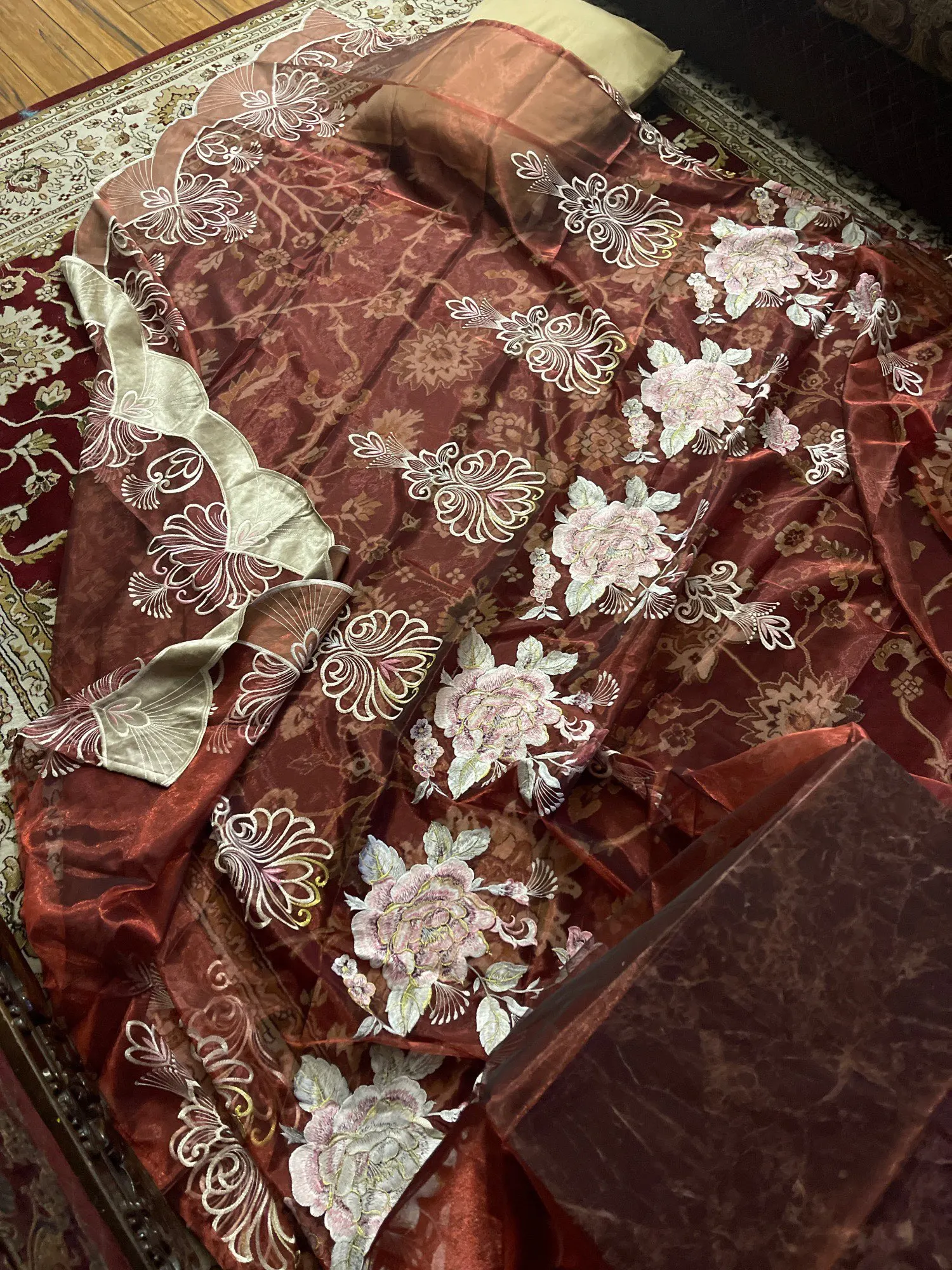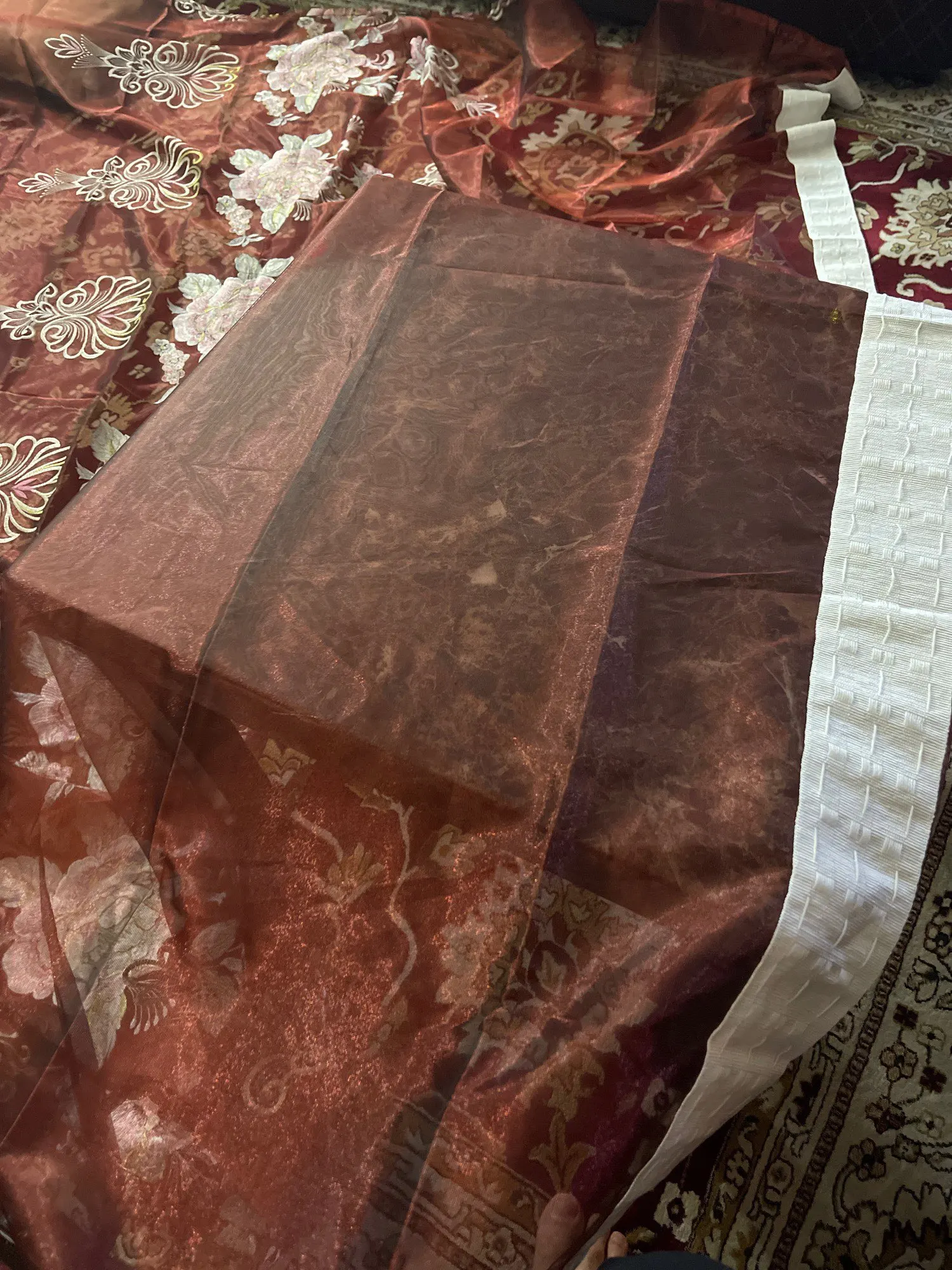 Прострочка занавески не аккуратная, подобная, последовательная. Смотрите фотографии, чтобы увидеть различия в занавеске.