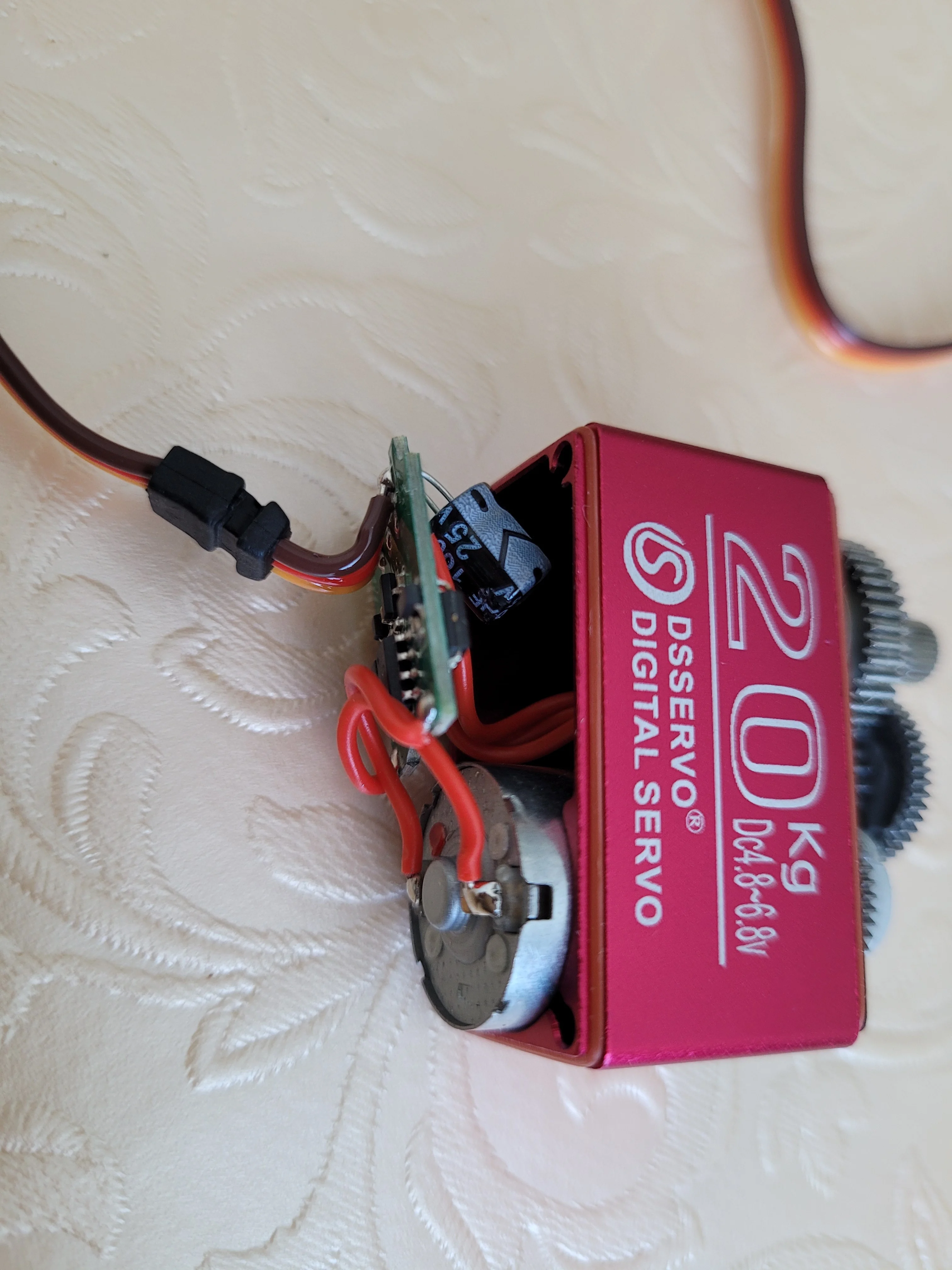 Пришла исправная. Работает медленно, но чётко. звука удержания (жужжание) на нагрузке 5кг с вылетом 2см от оси нет. На всякий случай покрыл плату лаком.