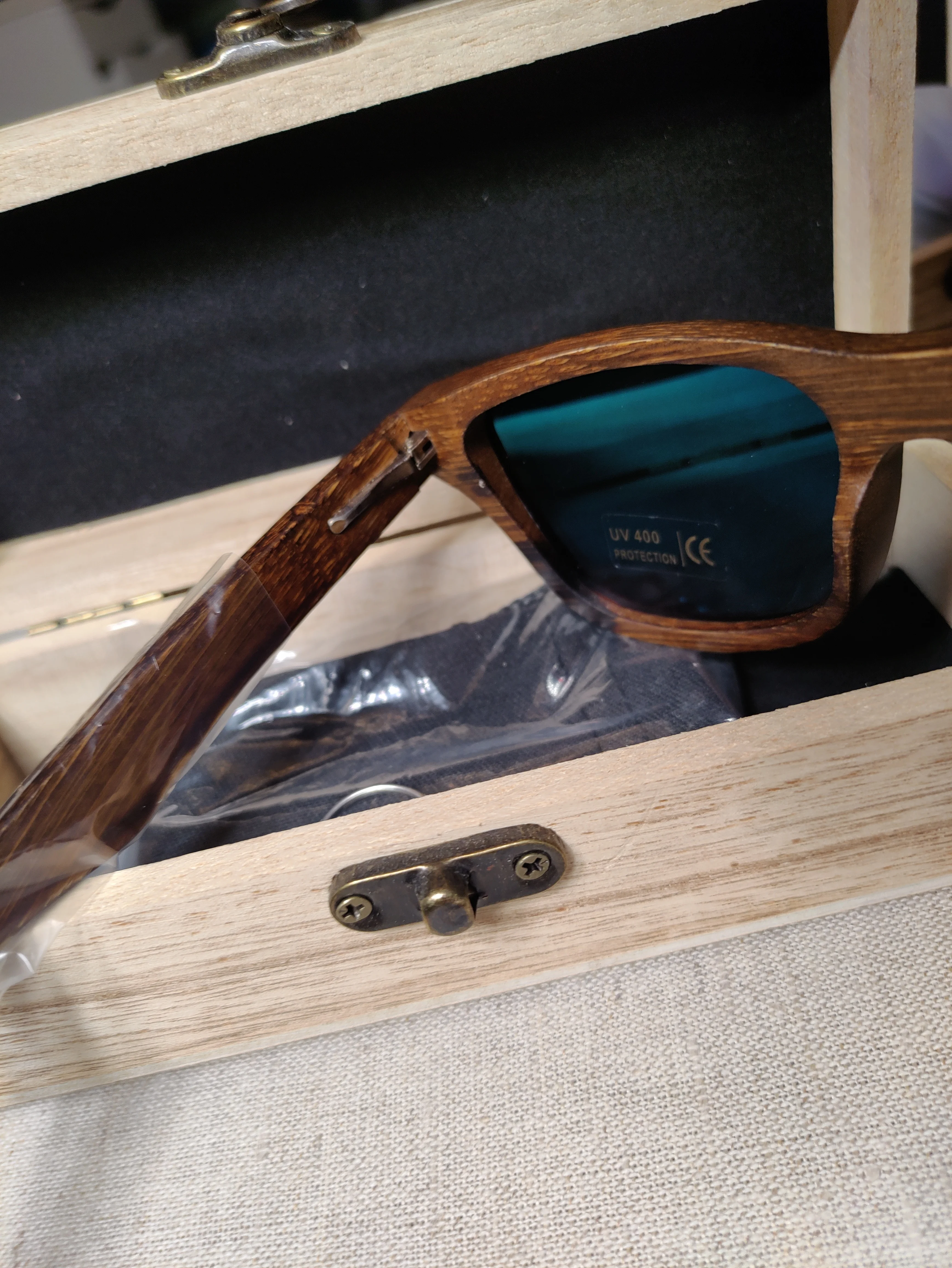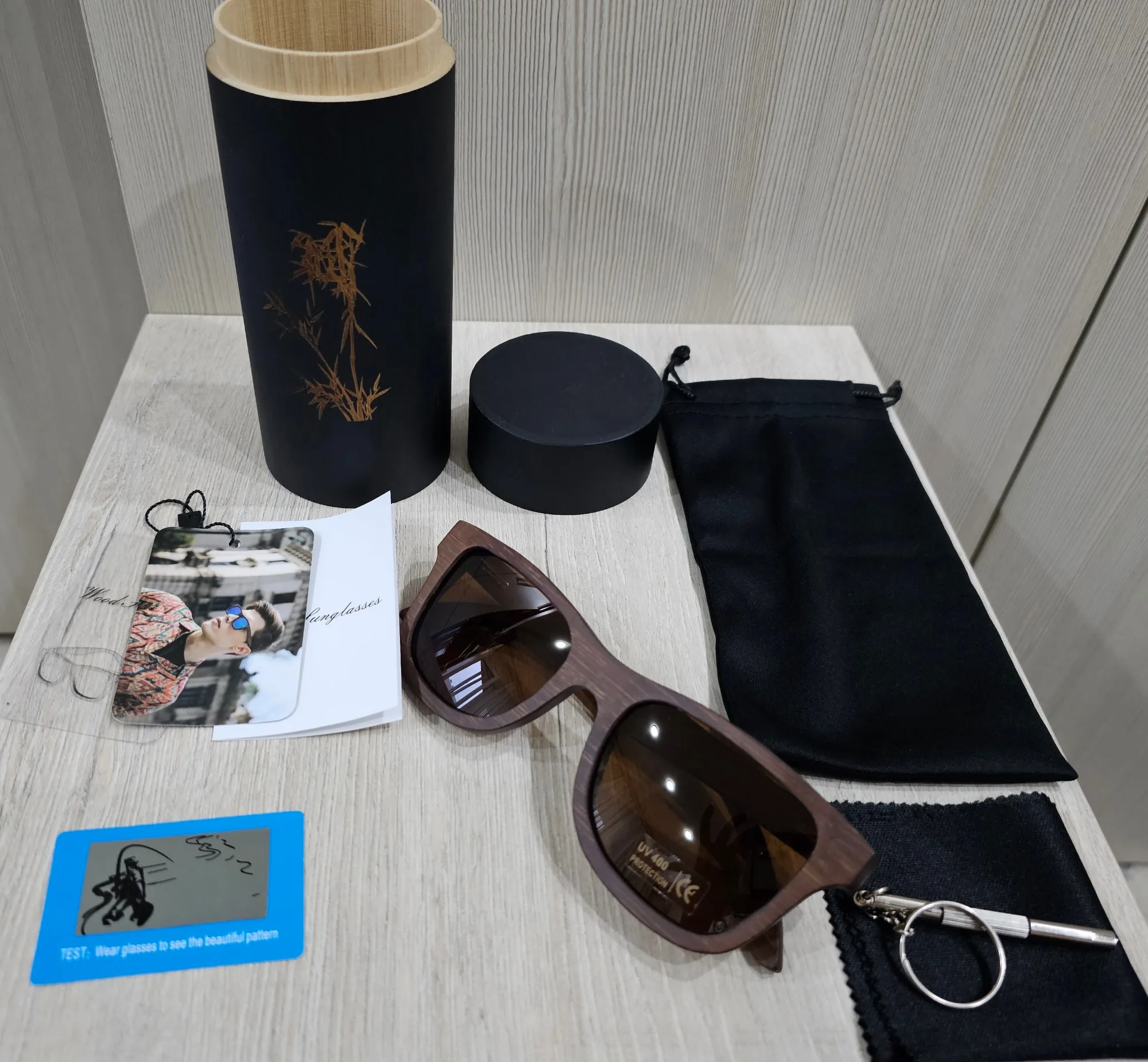 Солнцезащитные поляризованные очки в деревянной оправе от магазина GM Official Store.Комплектация:1.очки в деревянной оправе,2.тканевый чехол,3.тестовая карточка поляризации,4.салфетка по уходу,5.чехол-мешочек,6.мини отвёртка,7.деревянный футляр.Материал линз поликарбонат,идут с зеркальным эффектом.Шикарные очки,фабричное качество.Легкие,на узкое лицо идеально, хорошо держатся.Универсальные,для мужчин и женщин.Сответствуют описанию продавца.Прекрасный выбор и как подарок для близких.Магазин рекомендую,заказываю не впервые.