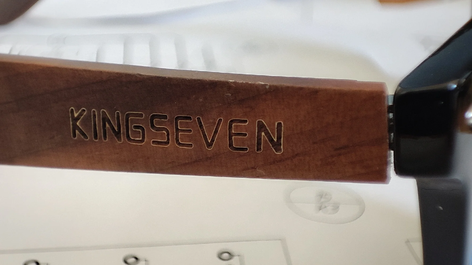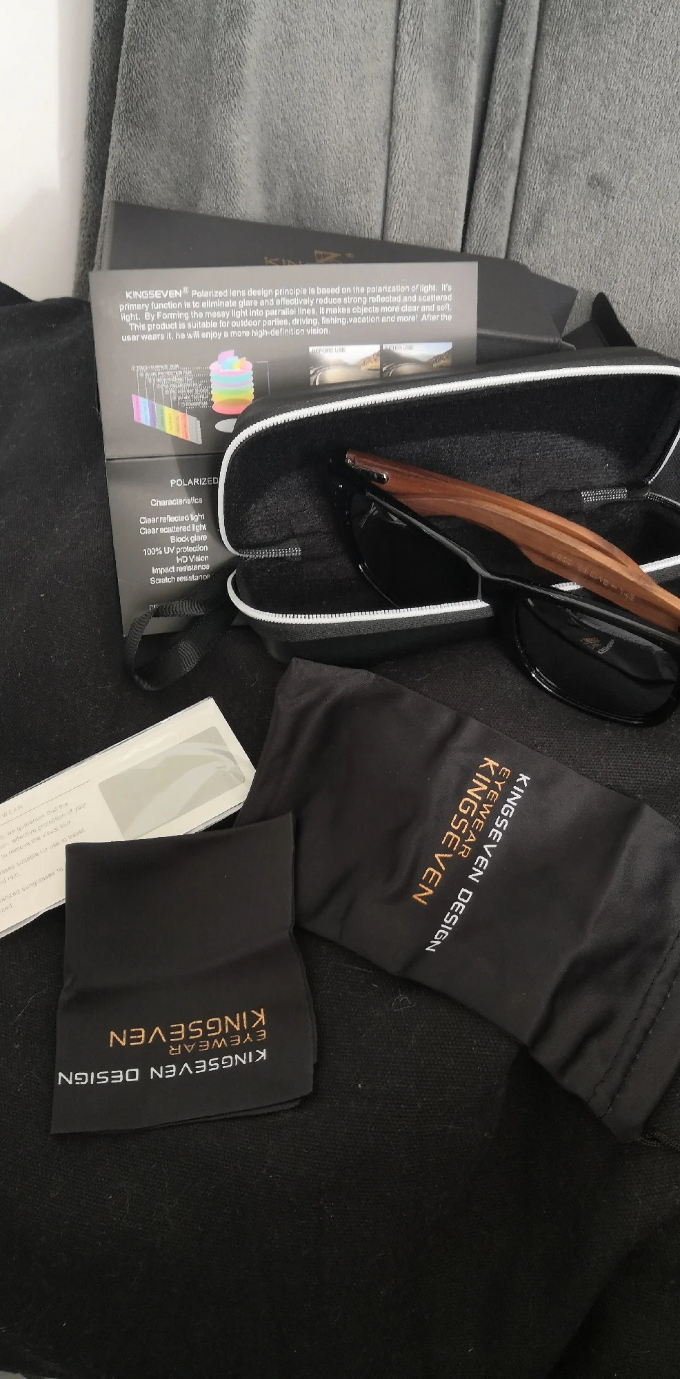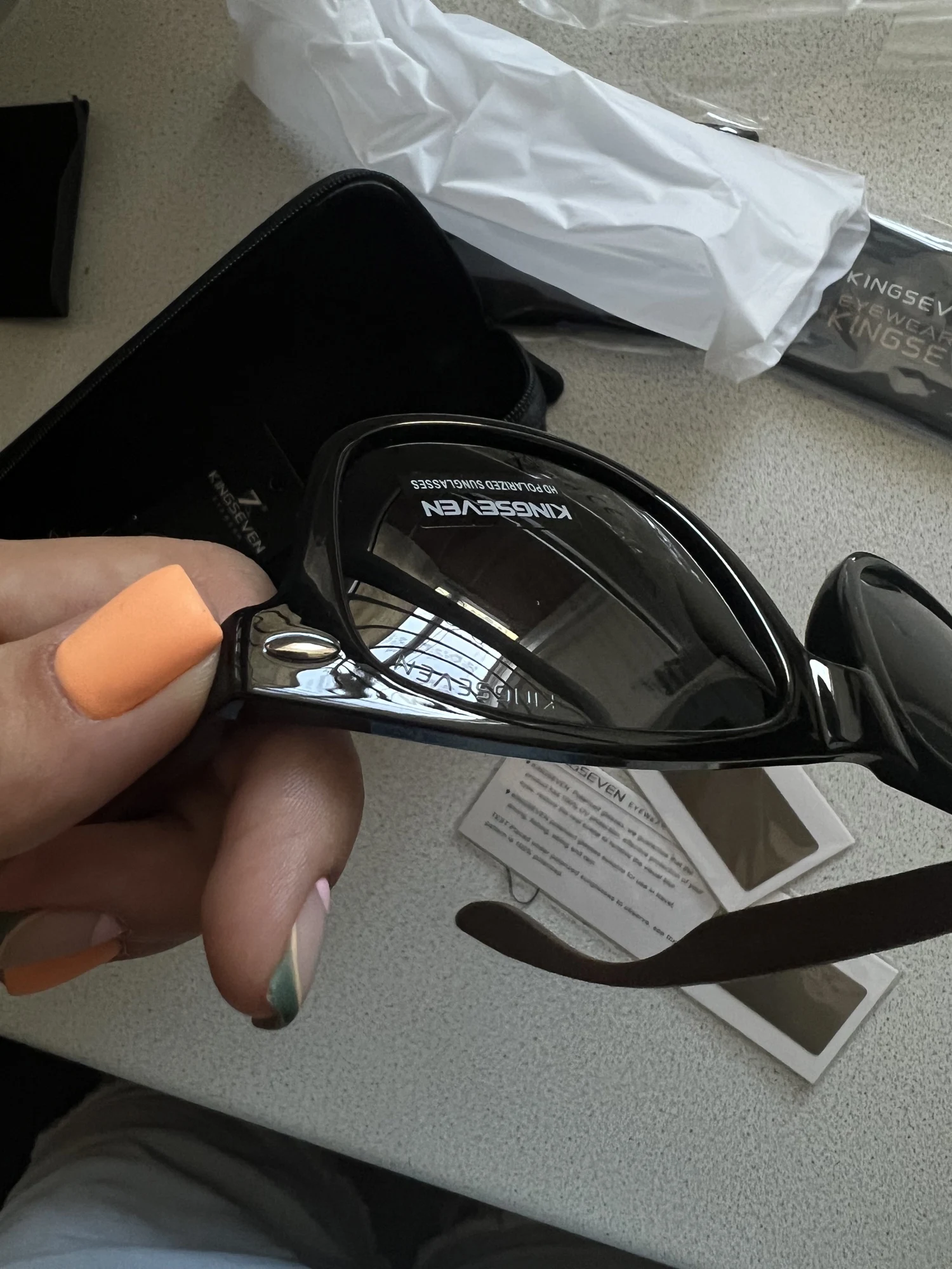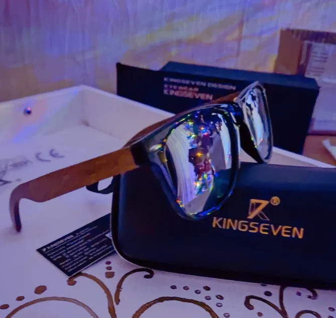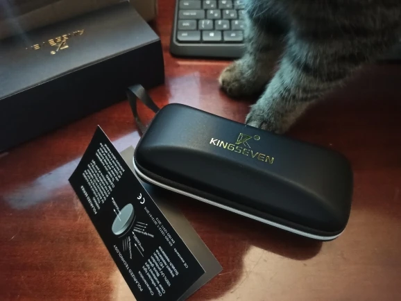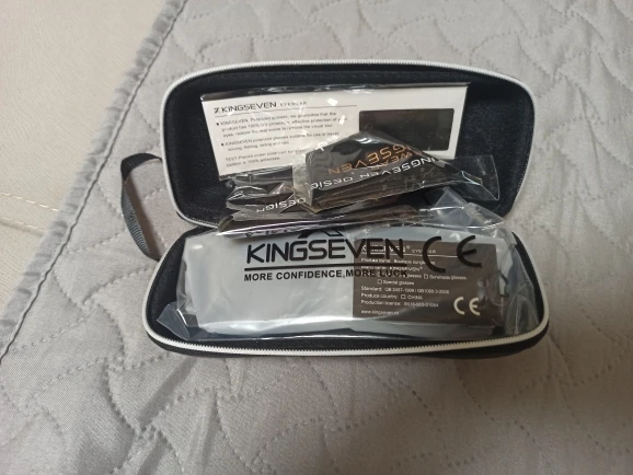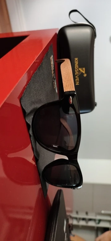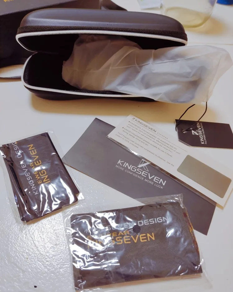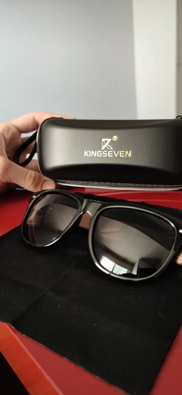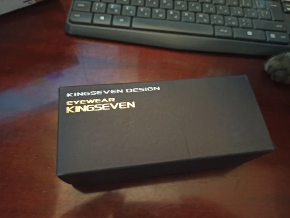 Медленно прибывает, и логотип «kingseven» не написан на стержнях. Коробка также поставляется с дефектным шарниром. Товар отличного качества. Рекомендуется. Линзы действительно хорошего качества, оправа также хорошего качества. Можно купить без опасений.