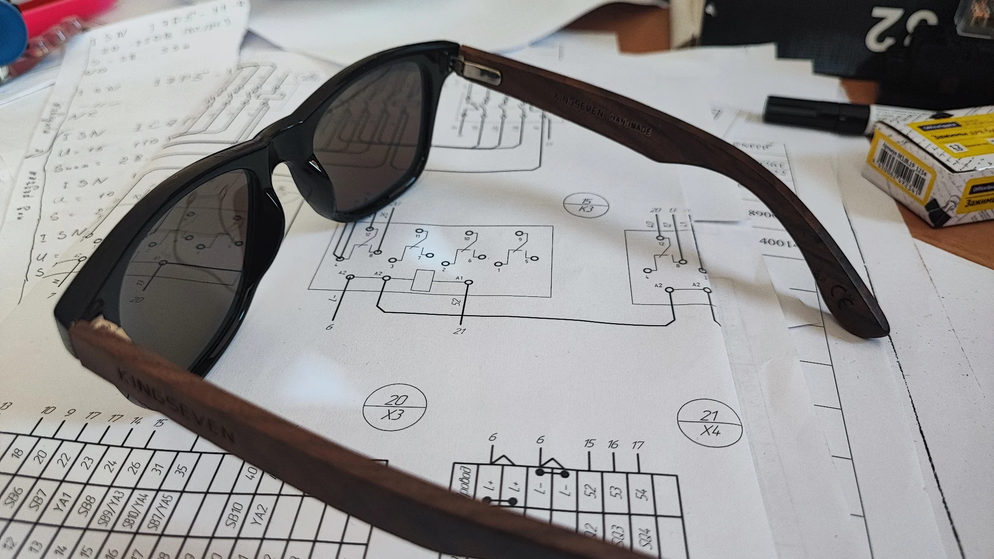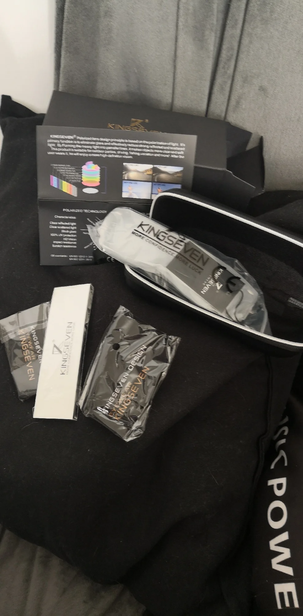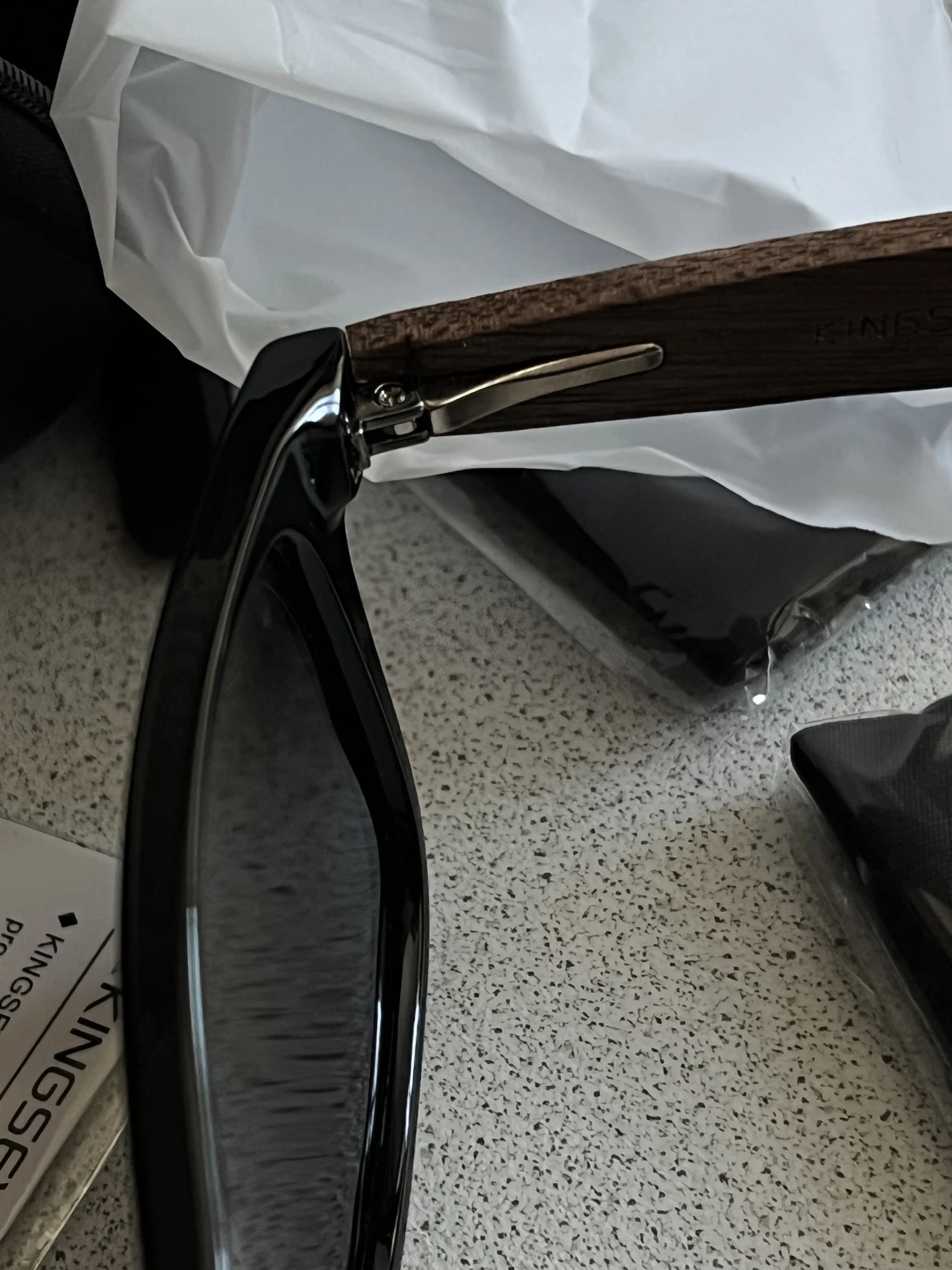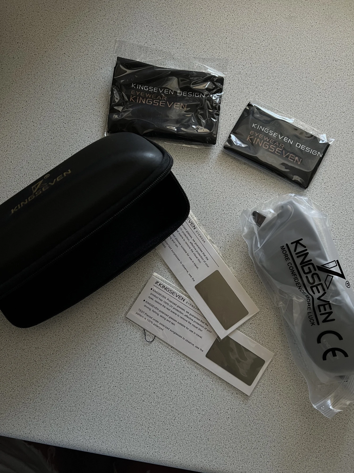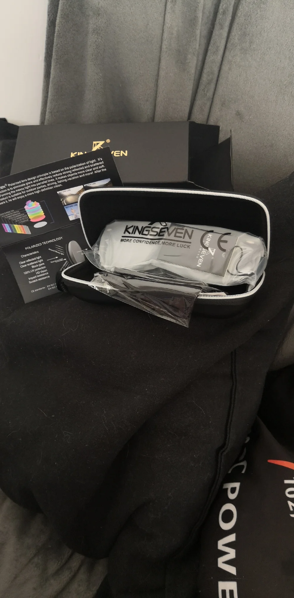 Медленно прибывает, и логотип «kingseven» не написан на стержнях. Коробка также поставляется с дефектным шарниром. Товар отличного качества. Рекомендуется. Линзы действительно хорошего качества, оправа также хорошего качества. Можно купить без опасений.