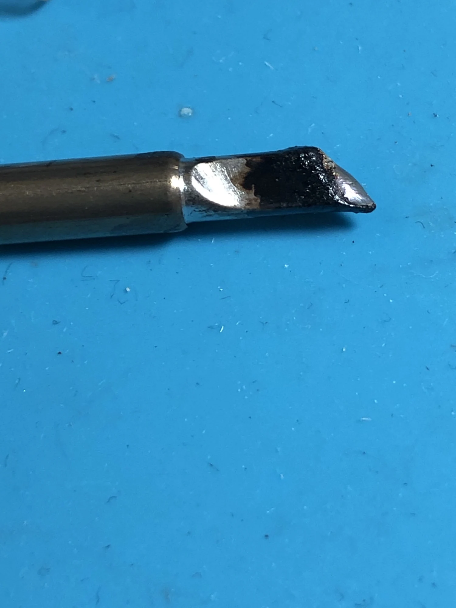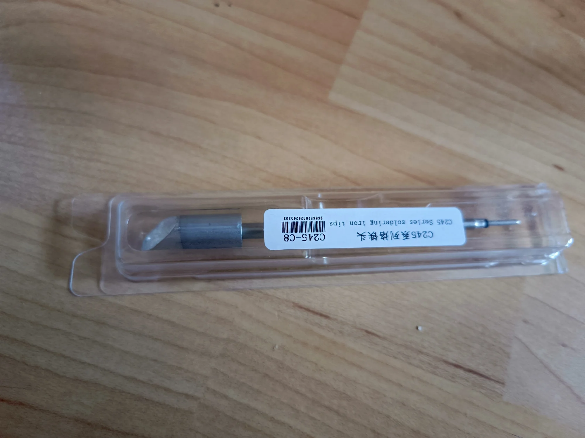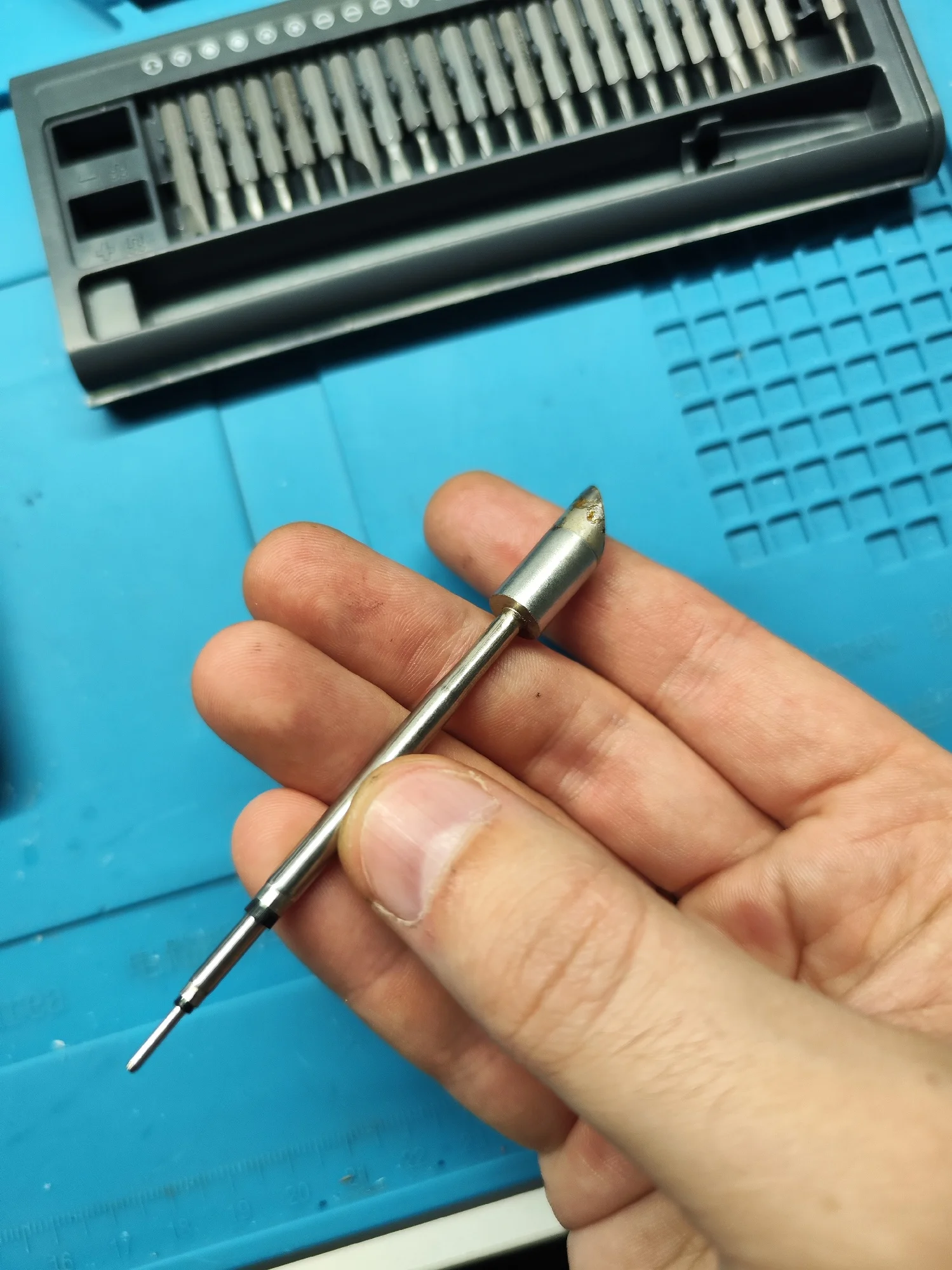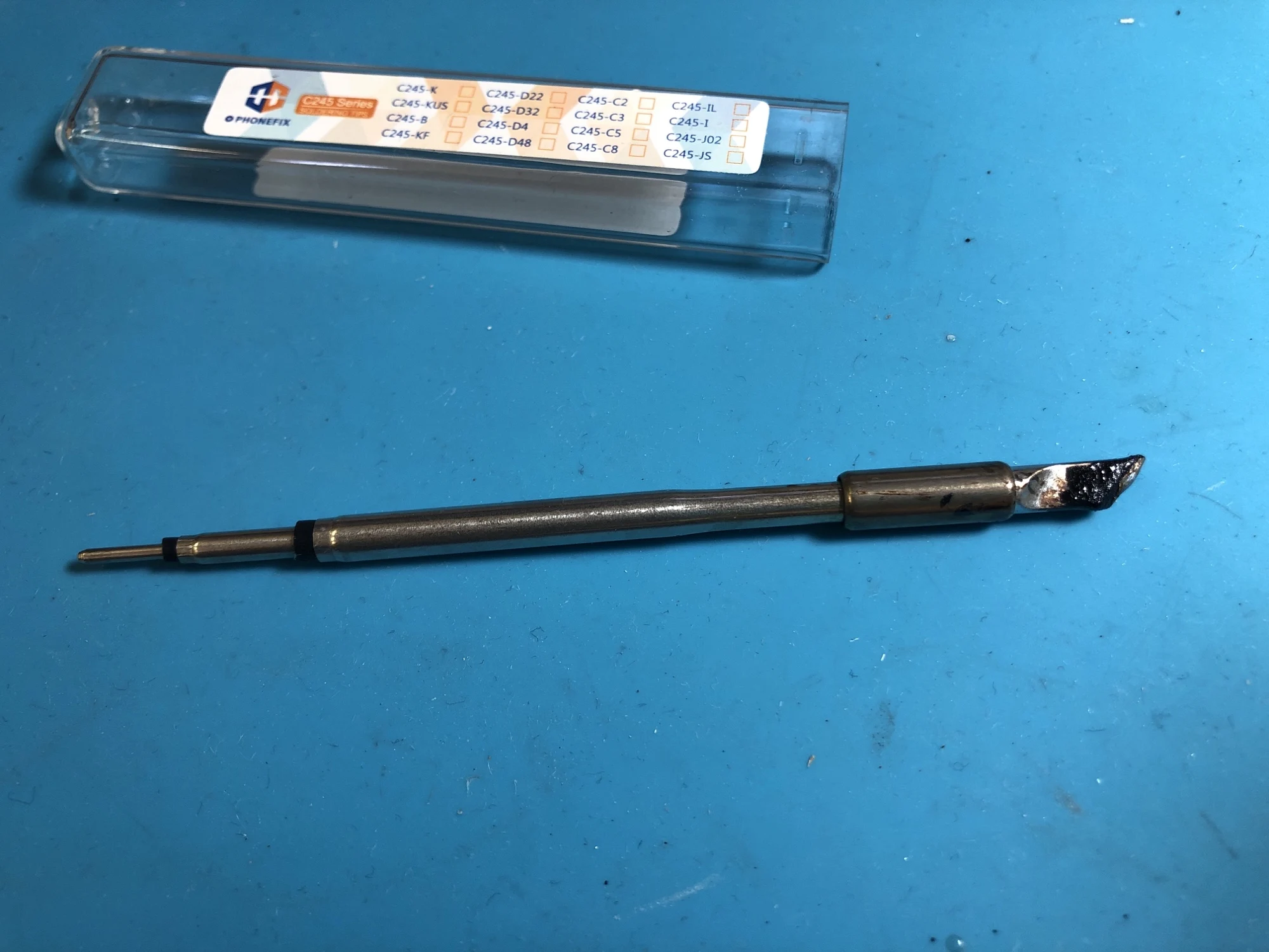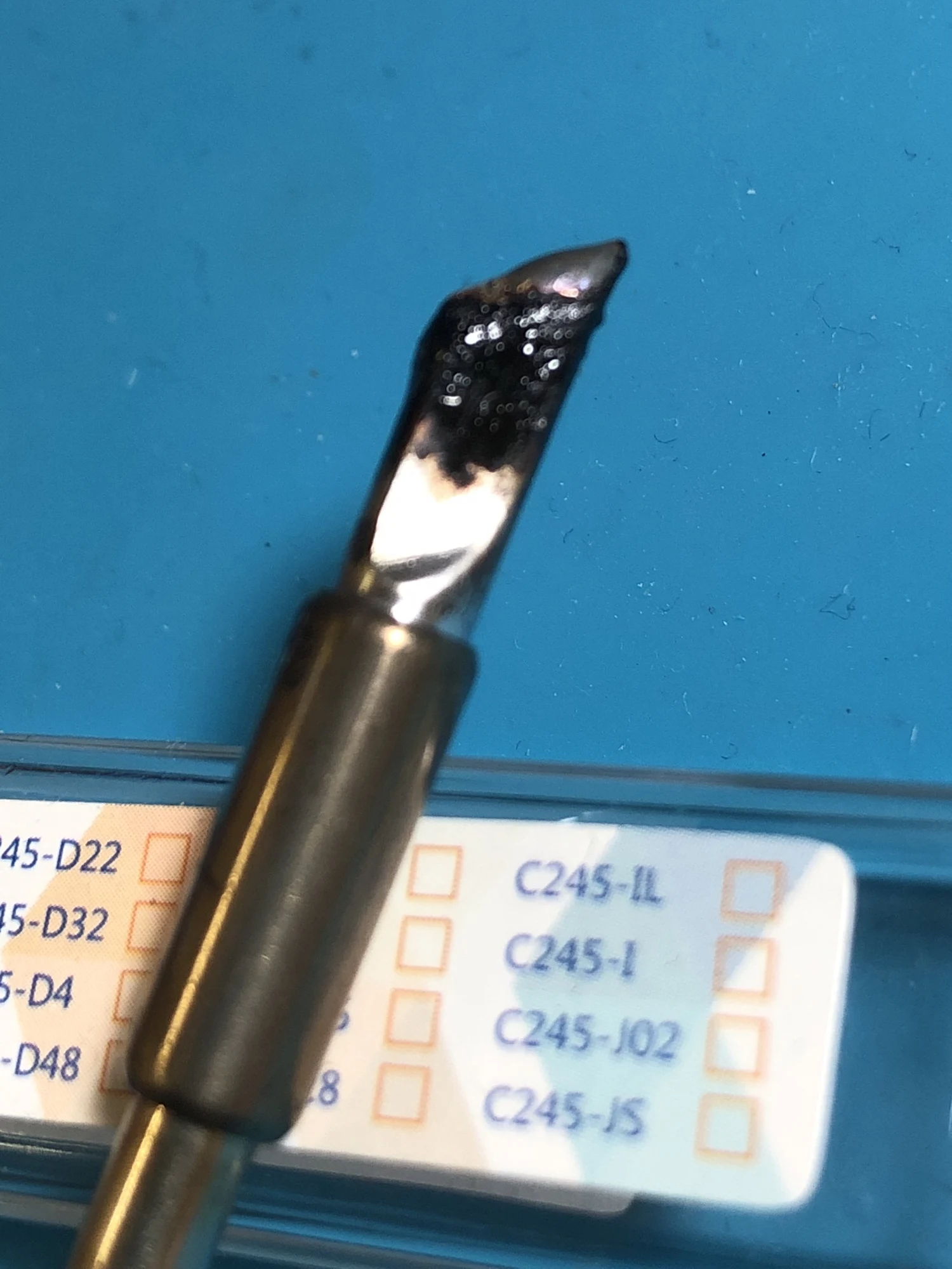 Совершенно другое жало: другой производитель, другая упаковка и форма наконечника. В довесок следы использования: капля припоя и термический нагрев металла