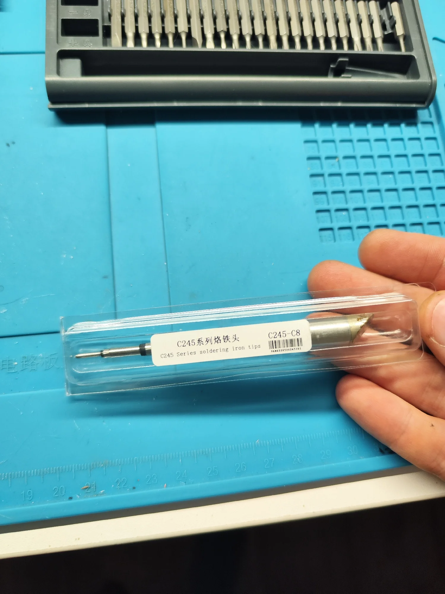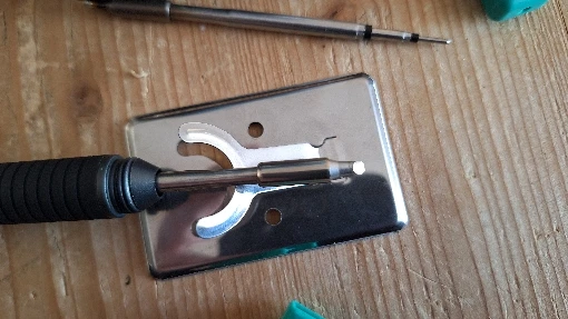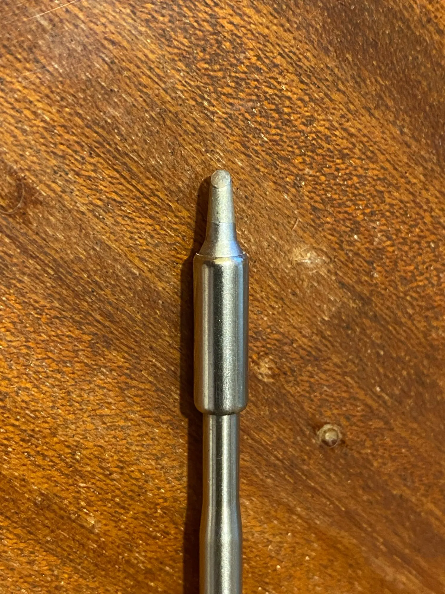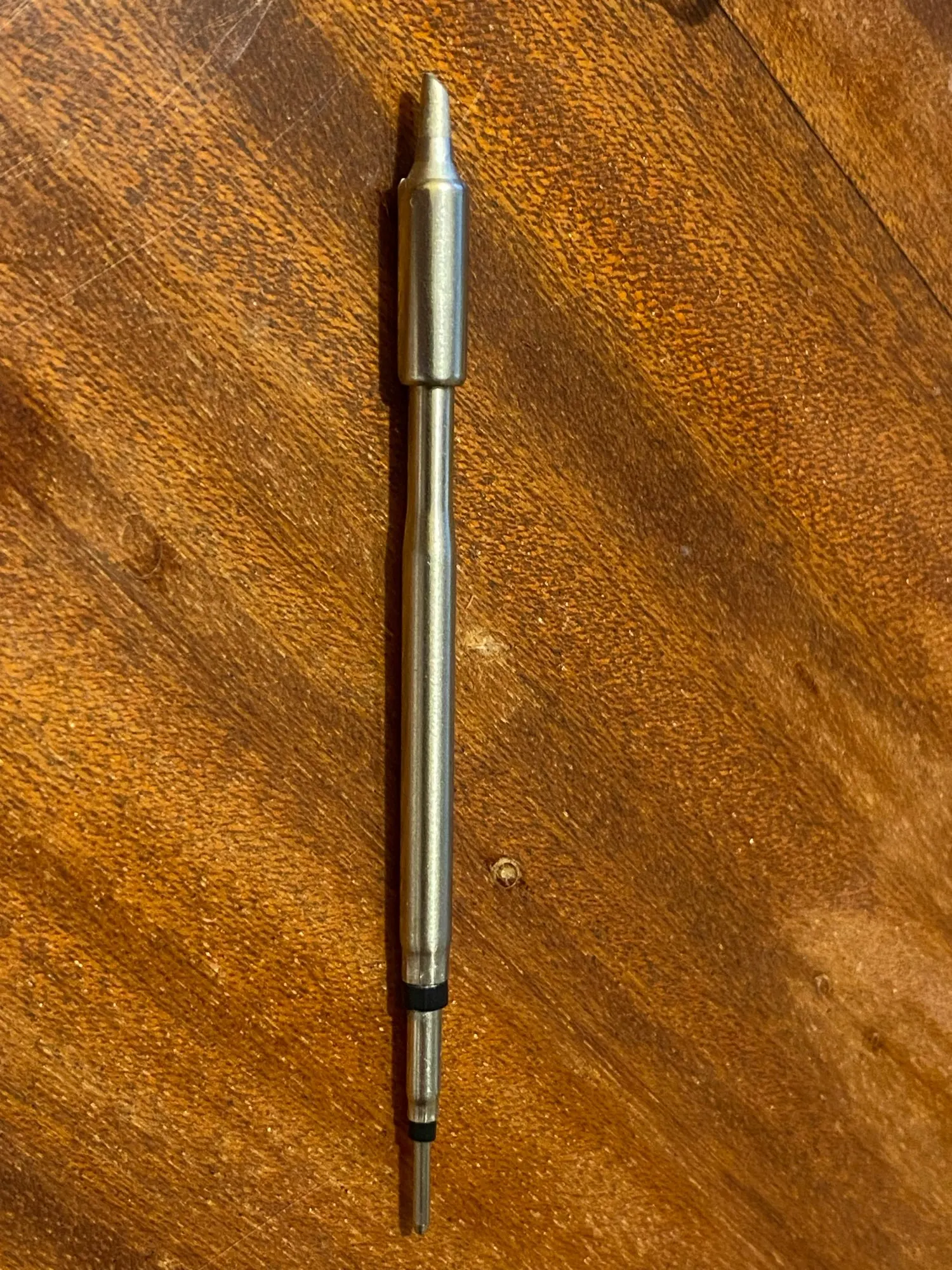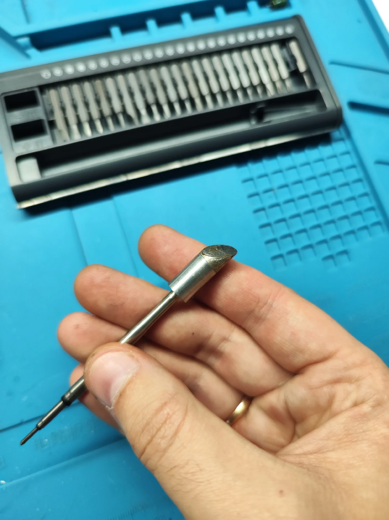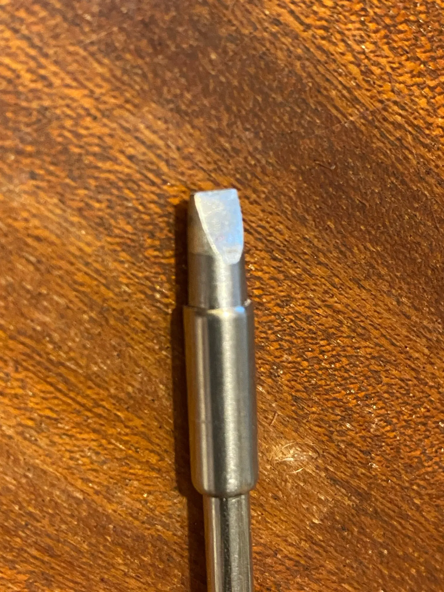 Совершенно другое жало: другой производитель, другая упаковка и форма наконечника. В довесок следы использования: капля припоя и термический нагрев металла