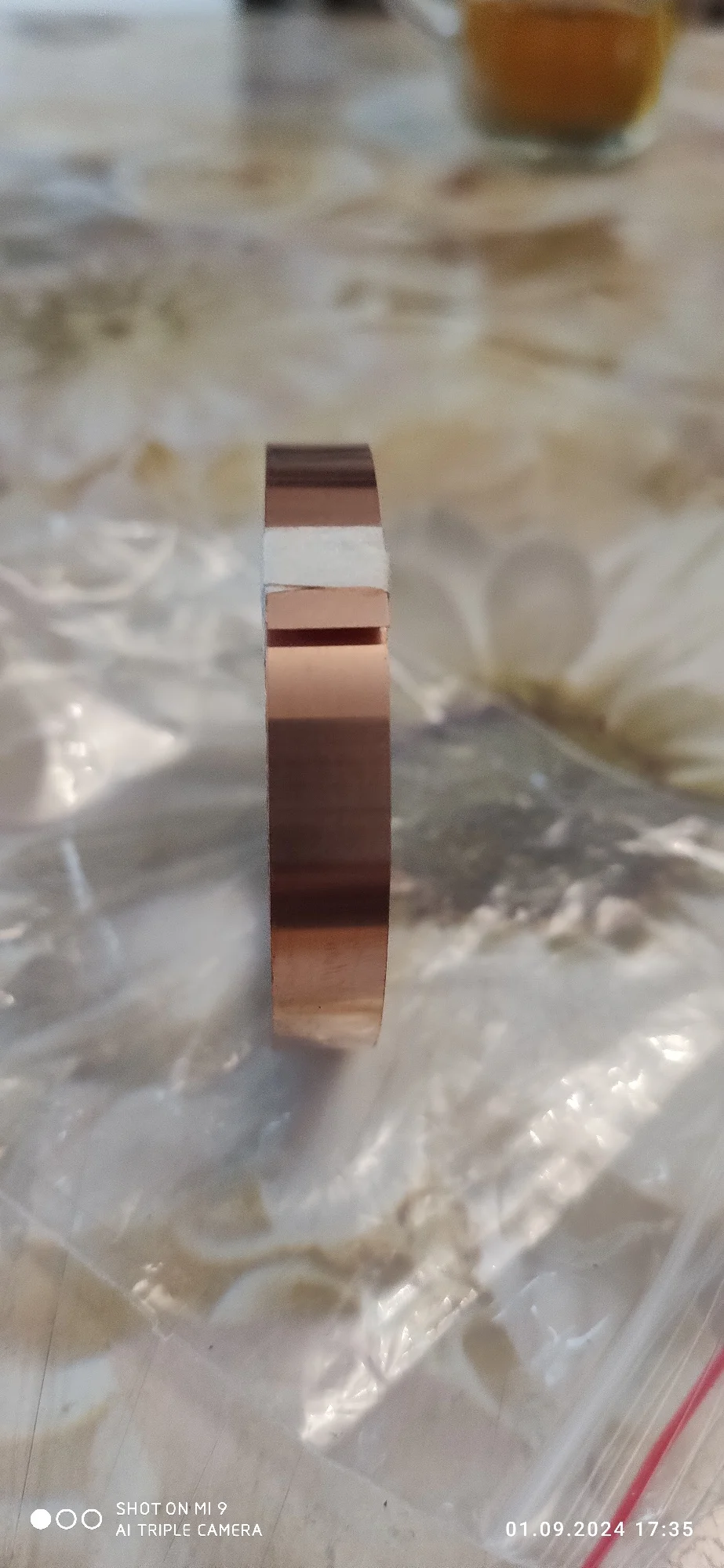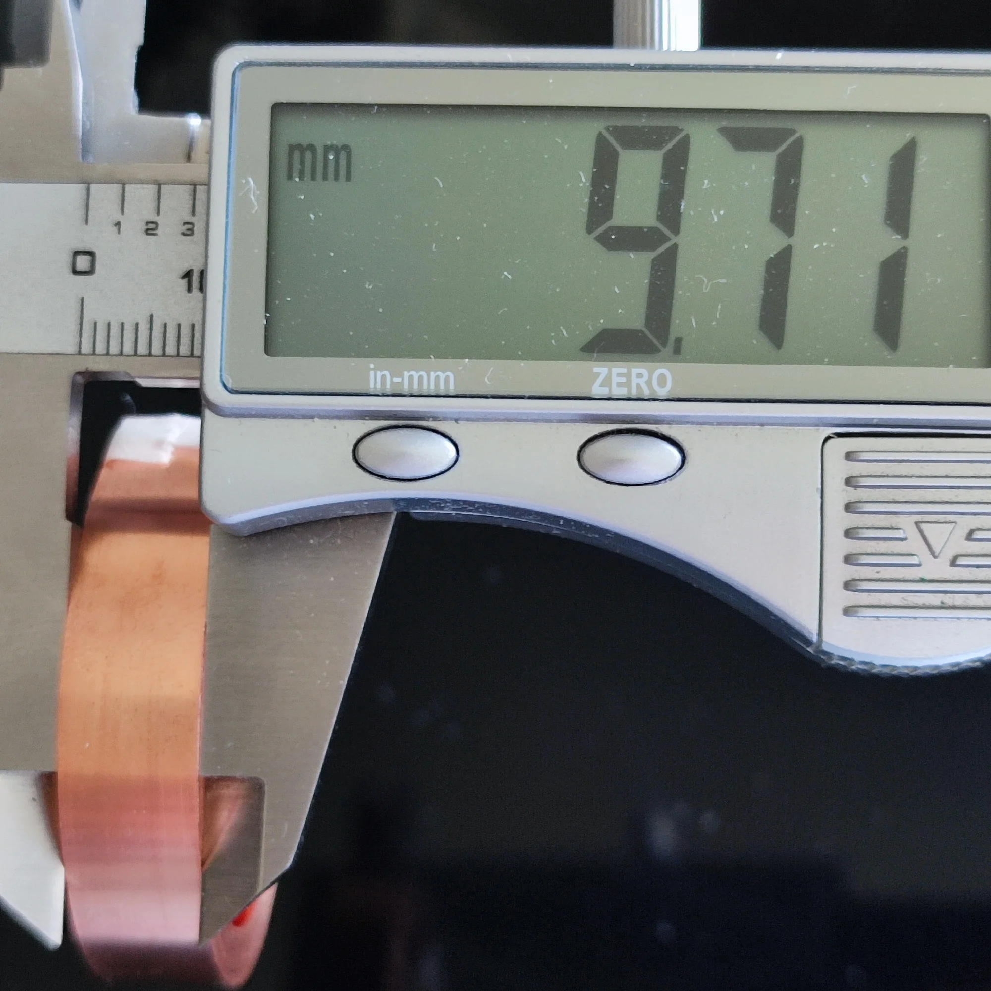 Фактическая ширина меньше, и это 9,71 мм (то есть минус 1 звезда), толщина составляет от 0,1 до 0,09 мм. Давайте проверим, есть ли медь или нет. В расчете я буду использовать толщину 0,1 мм и общую длину 5 м. Вес 0971*0,01*500*8,83 = 43,36 граммы, и он очень близок к измеряемому фактическому весу, поэтому материал, скорее всего, медь.