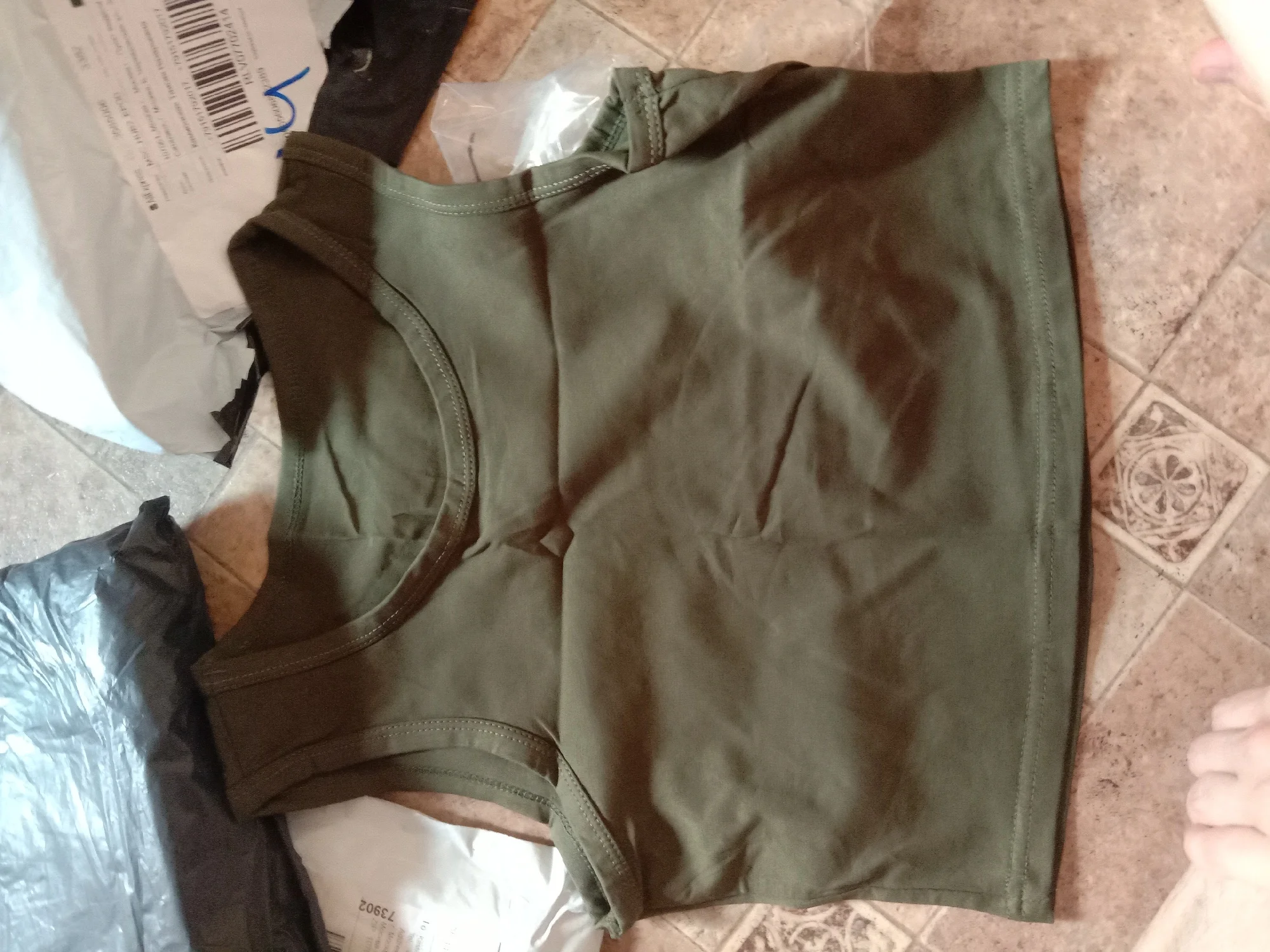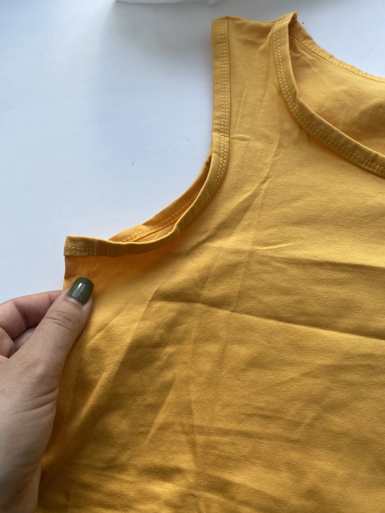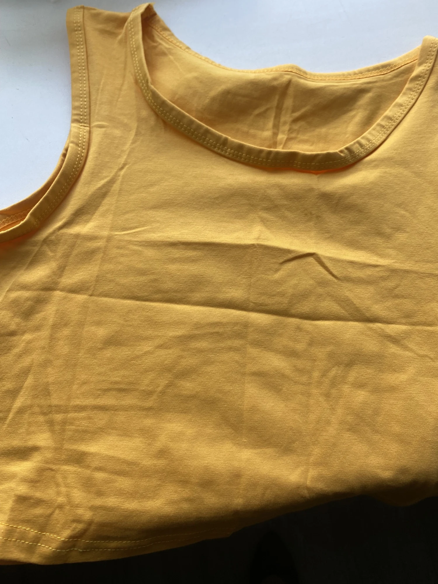 легкая майка/топ цвет не горчица. размер L на 46-48 российский. у меня 44,но на вякий взяла побольше.