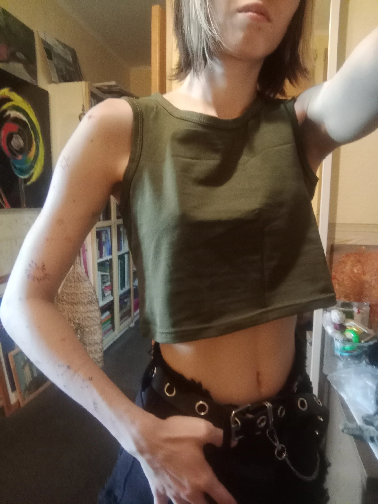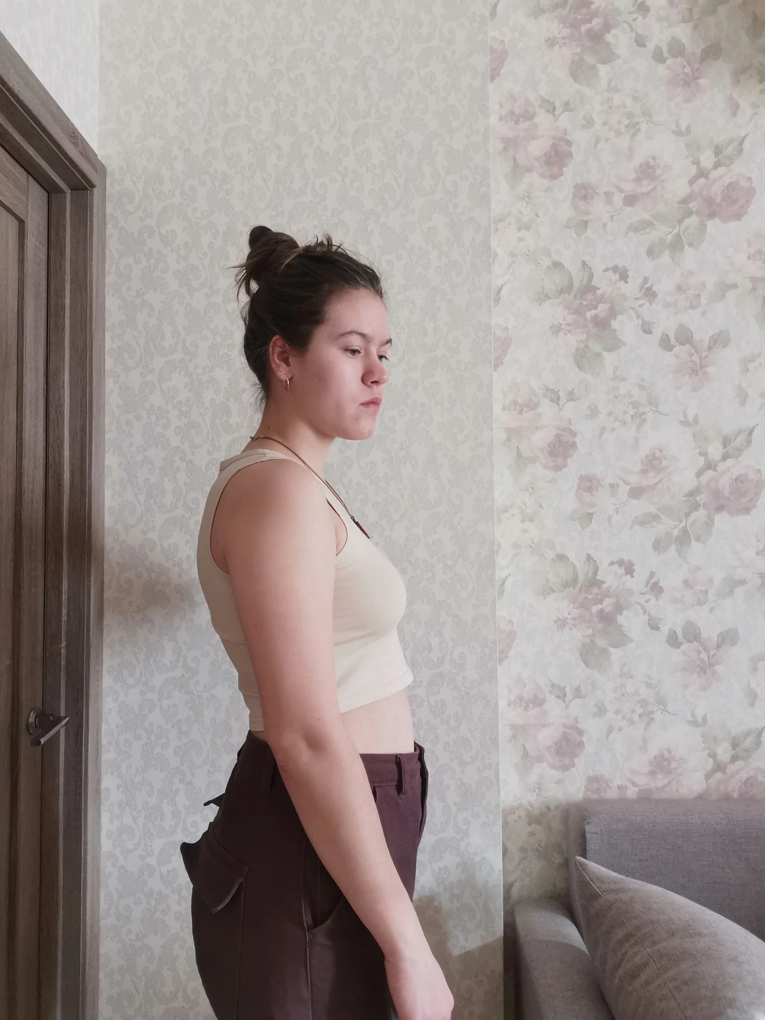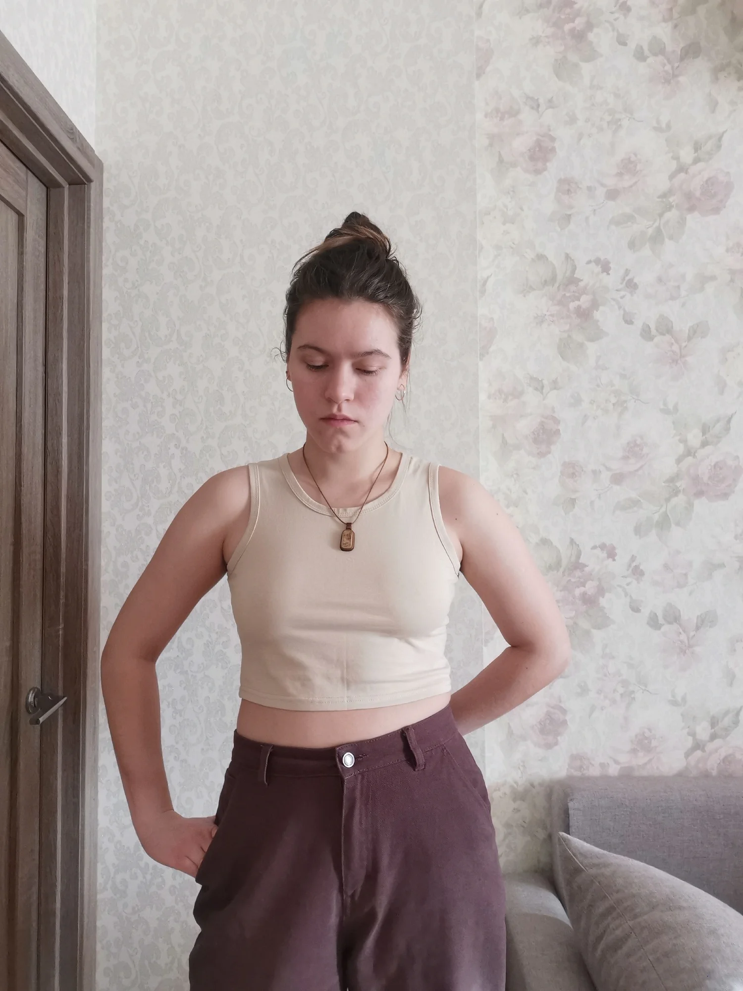 легкая майка/топ цвет не горчица. размер L на 46-48 российский. у меня 44,но на вякий взяла побольше.