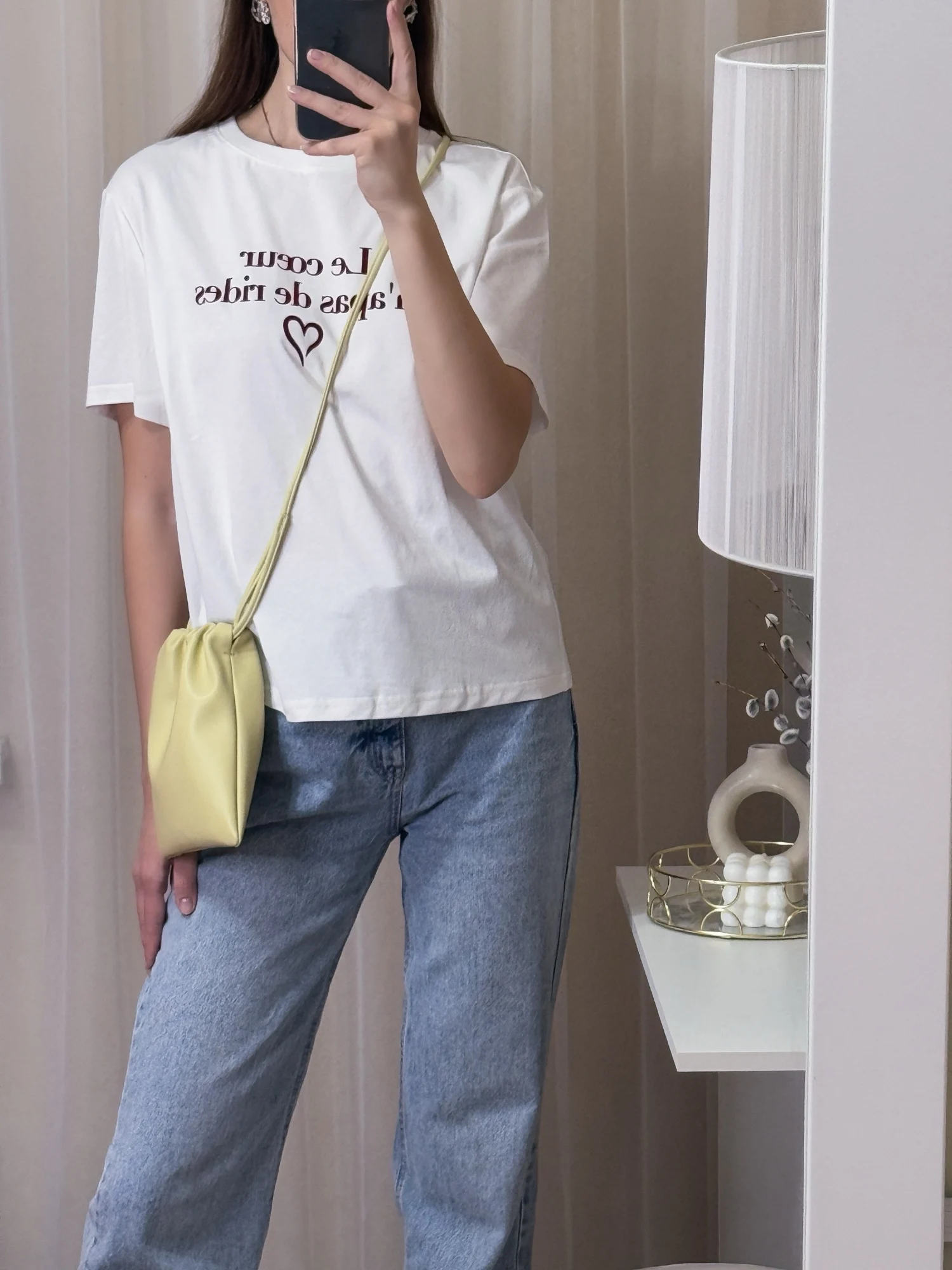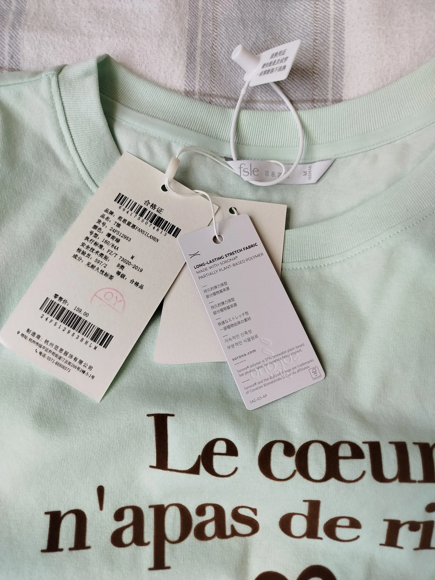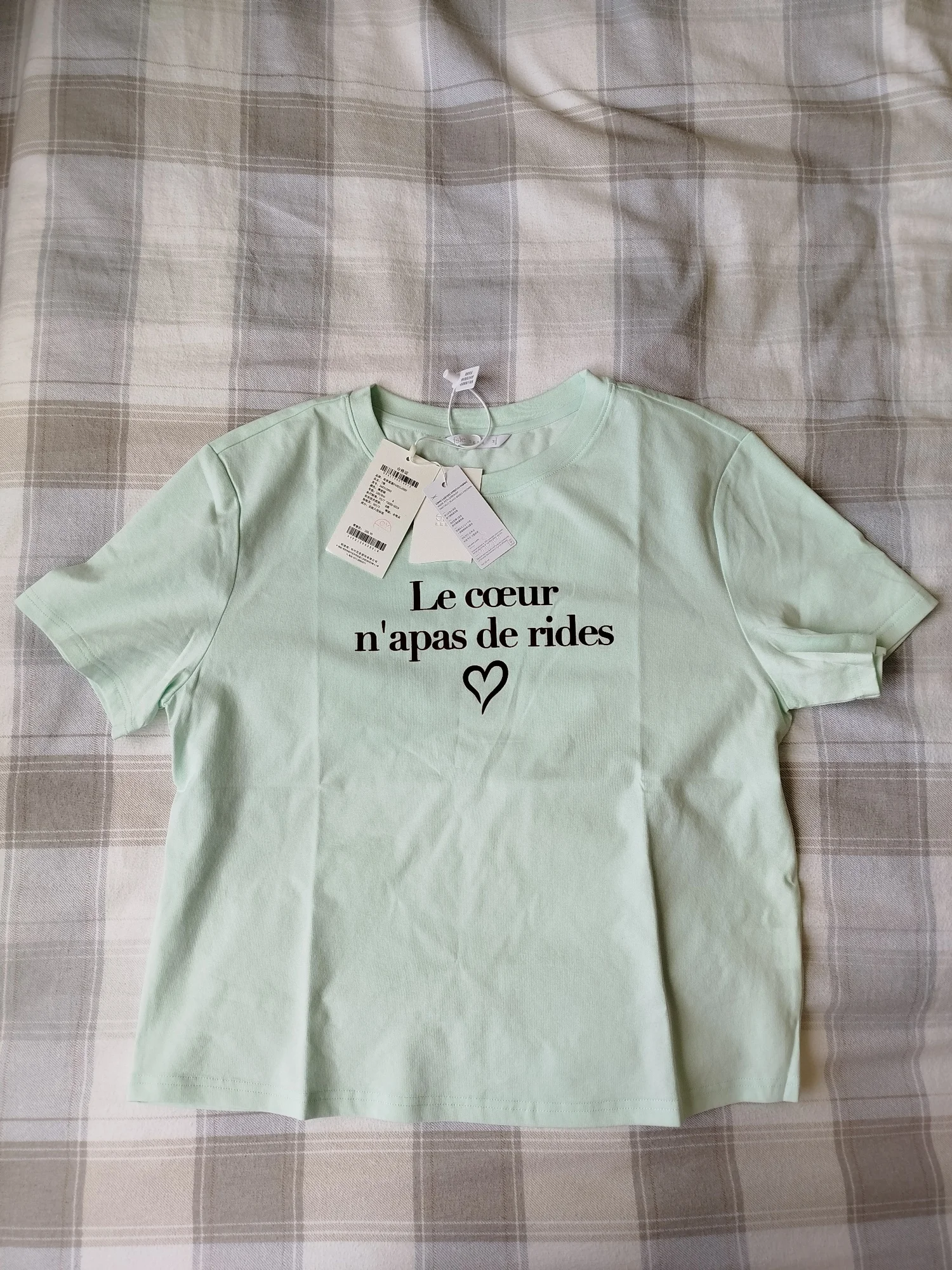 Я привередливый покупатель, и эта футболка мне не понравилась. Покупала за 11$ (включая 20% НДС). Состав - 78% хлопок, 22% полиэстер. Ткань содержит волокна Sorona - синтетический полимер, при производстве которого используется растительное сырье. Футболка приятная на ощупь, достаточно плотная. Оттенок - нежно- мятный, как на фото продавца. Принт - бархатный. Размер М имеет маркировку 160/80А. На параметры 84-66-88, рост 168 см, вес 49 кг футболка подошла, но можно было брать и на размер меньше. Не понравился мне крой: футболка широкая, с широкой горловиной, и странно скроенными рукавами: плечевые швы некрасиво выпирают, футболка смотрится так, как будто широка в плечах. Фасон предполагает спущенное плечо (см. фото на модели), но смотрится это странно при таком крое. Оценку не занижаю, все выполнено качественно, возможно, я не поняла задумку или мне такая модель просто не идёт.