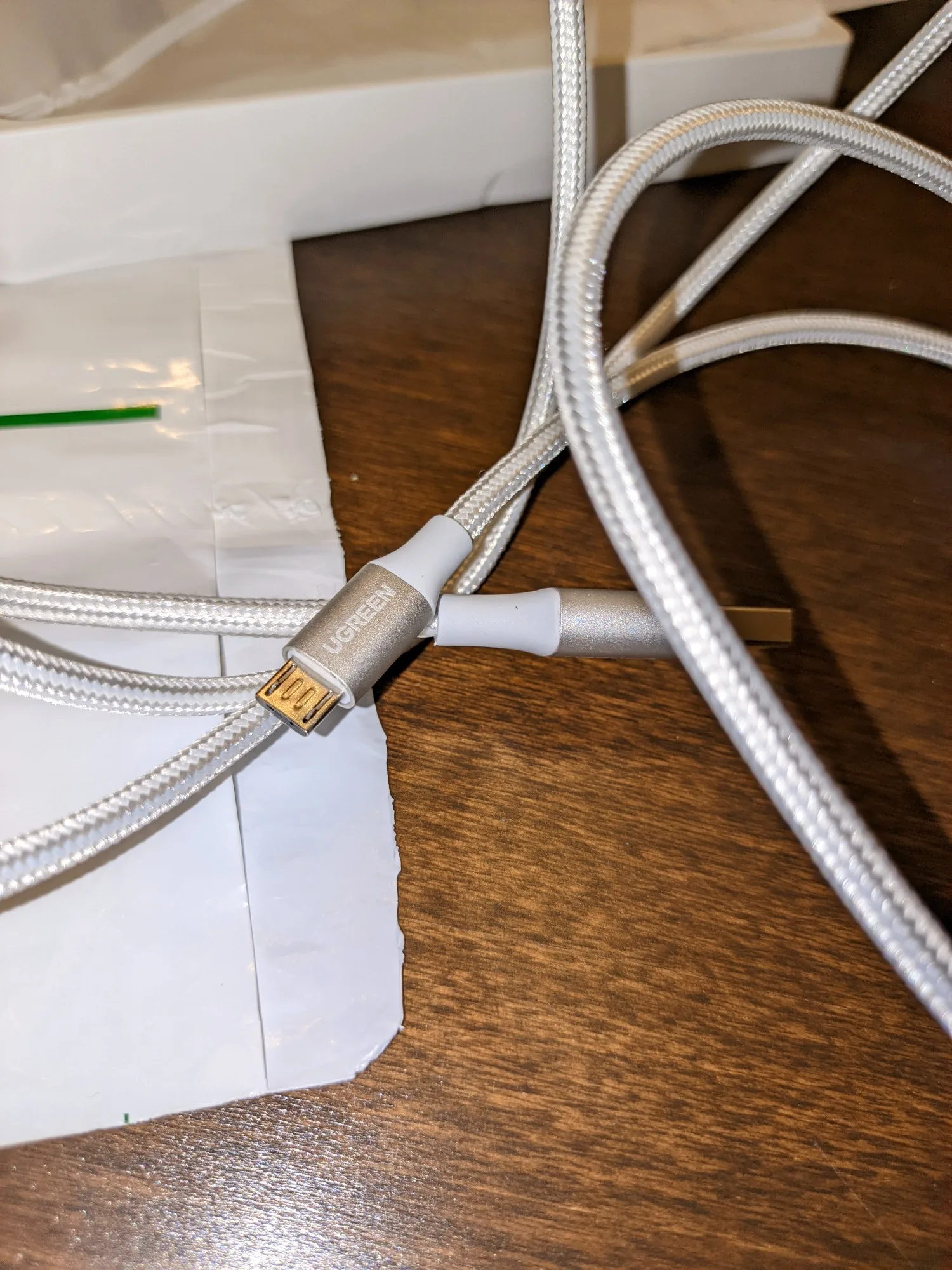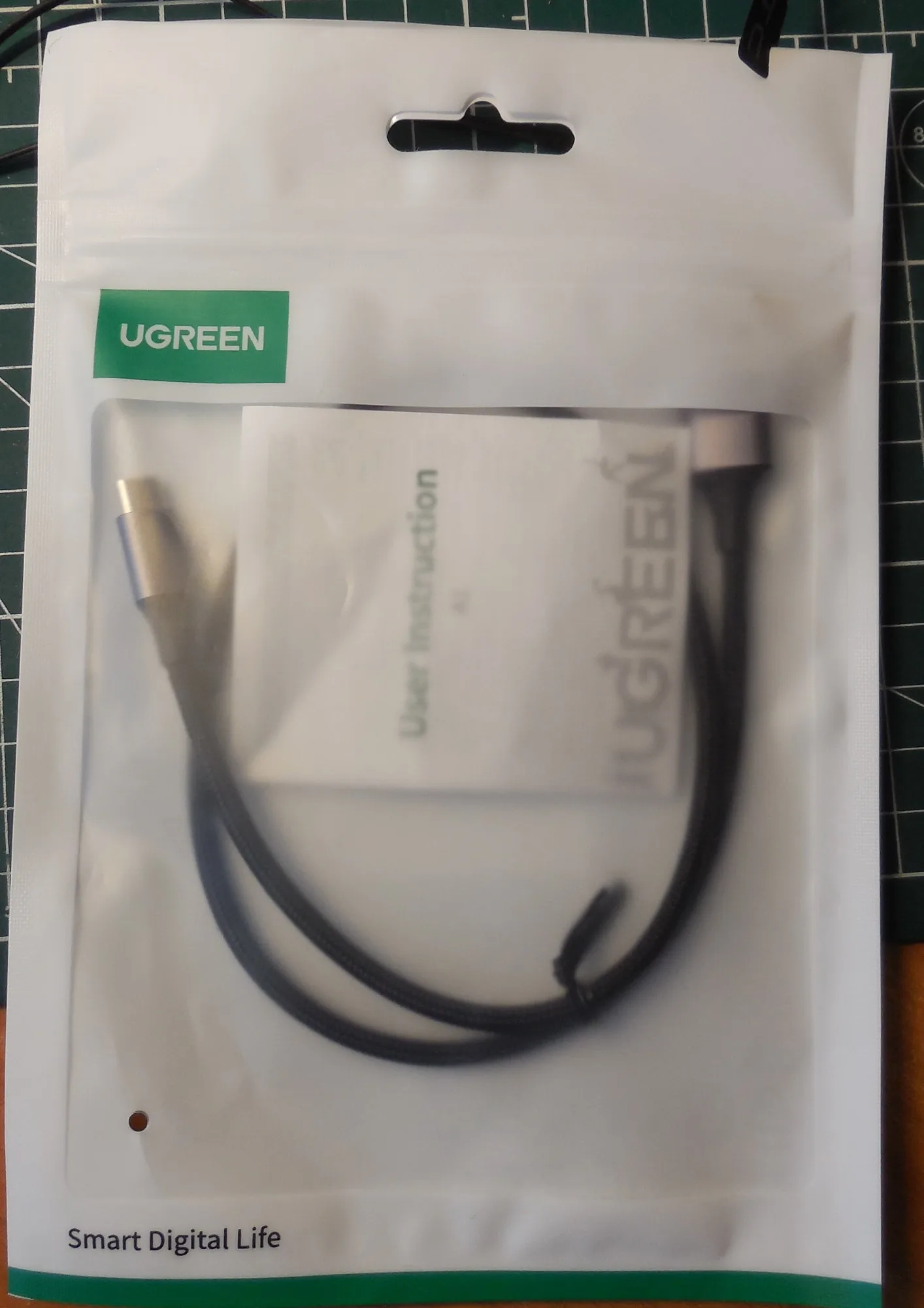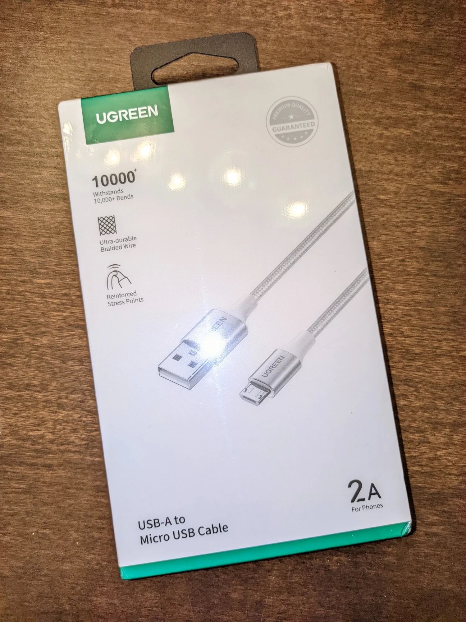 Кабель приятный, в тканевой оплётке, длина 2.02 m с коннекторами, диаметр 4 mm, хорошо держится в аппаратных разъёмах, выполняет свои функции. Заказывал по цене ₽643, включающей доставку, для использования с компактным паровым увлажнителем воздуха. Для устаревшего формата micro USB это дорого. Измерять пропускаемую мощность затруднительно из-за устаревшего формата. Буду надеяться на репутацию кабелей Ugreen. Упаковка традиционная для данного продавца: зип-пакет, коробочка, бело-зелёный фирменный пакет, который потрепался в доставке. Внешний пакет или конверт, маскирующий популярный товар (соблазн для воришек), отсутствует. Заказ от 14 февраля доставлен в ПВЗ вечером 23 февраля - Москва.