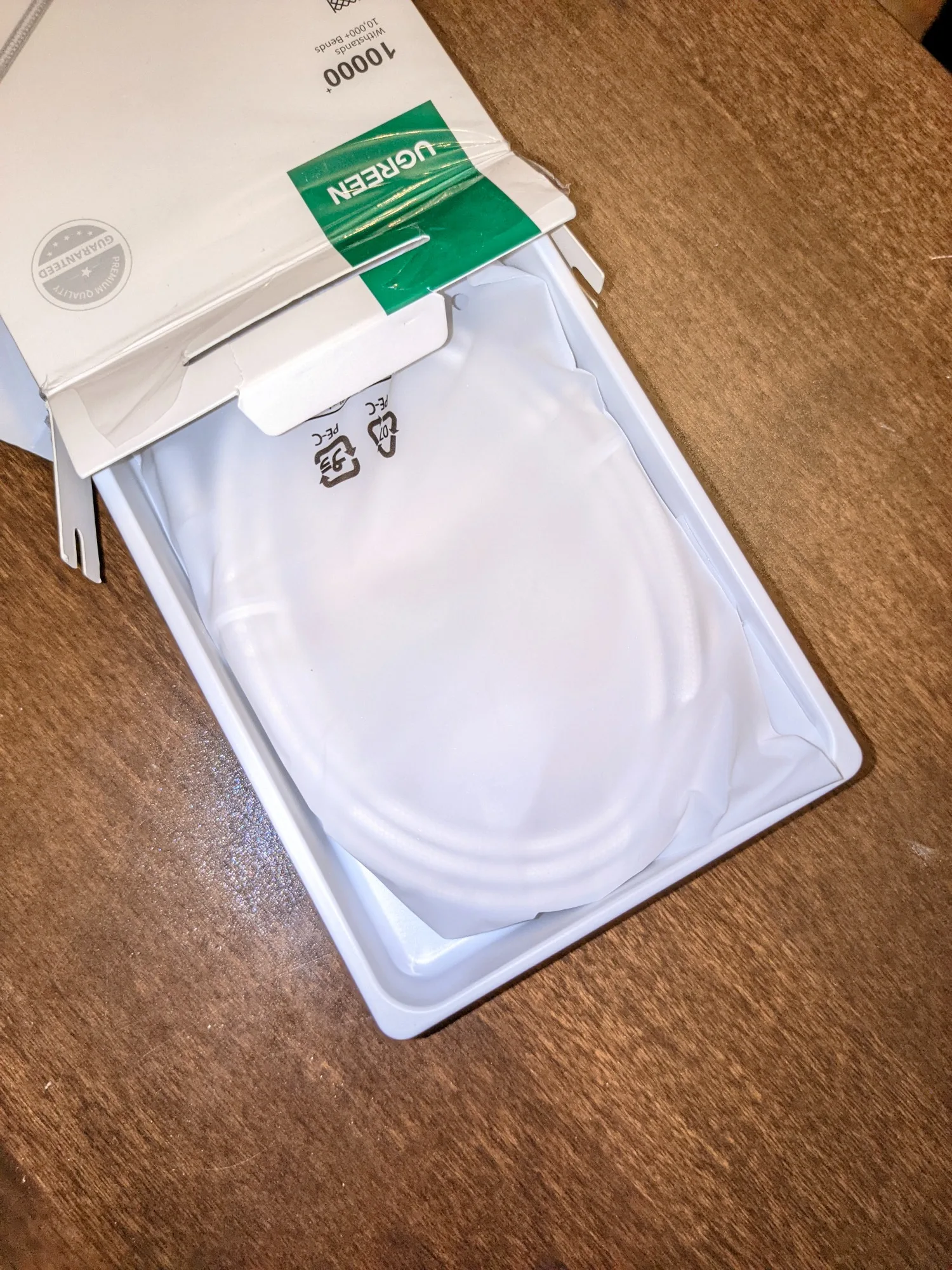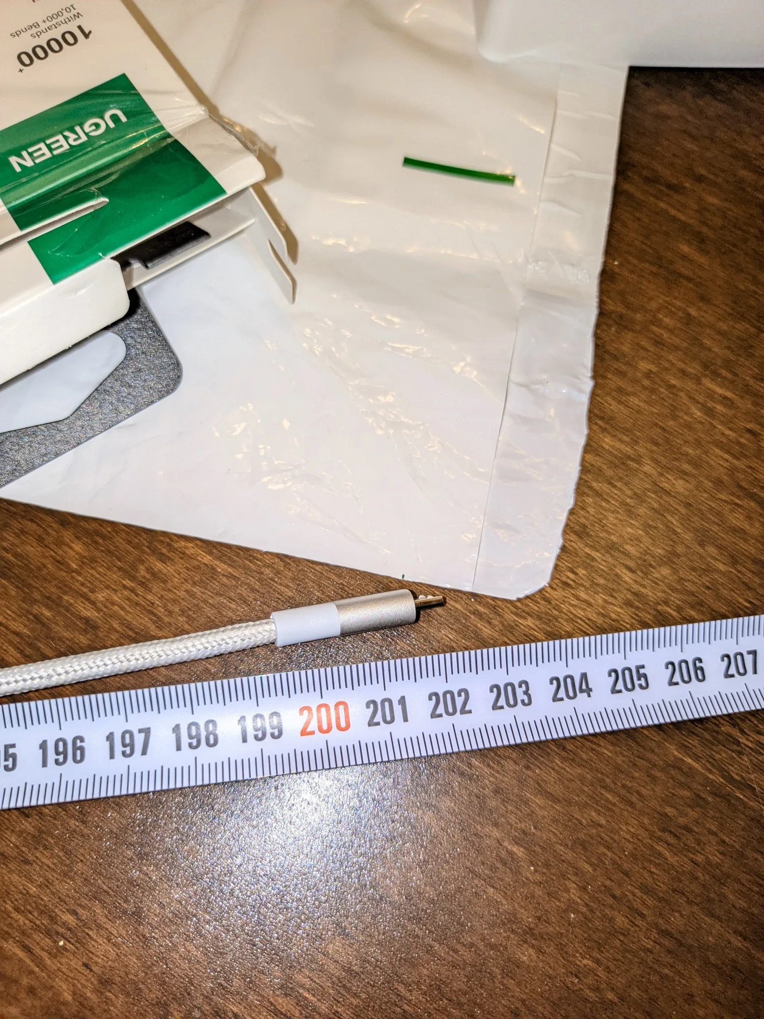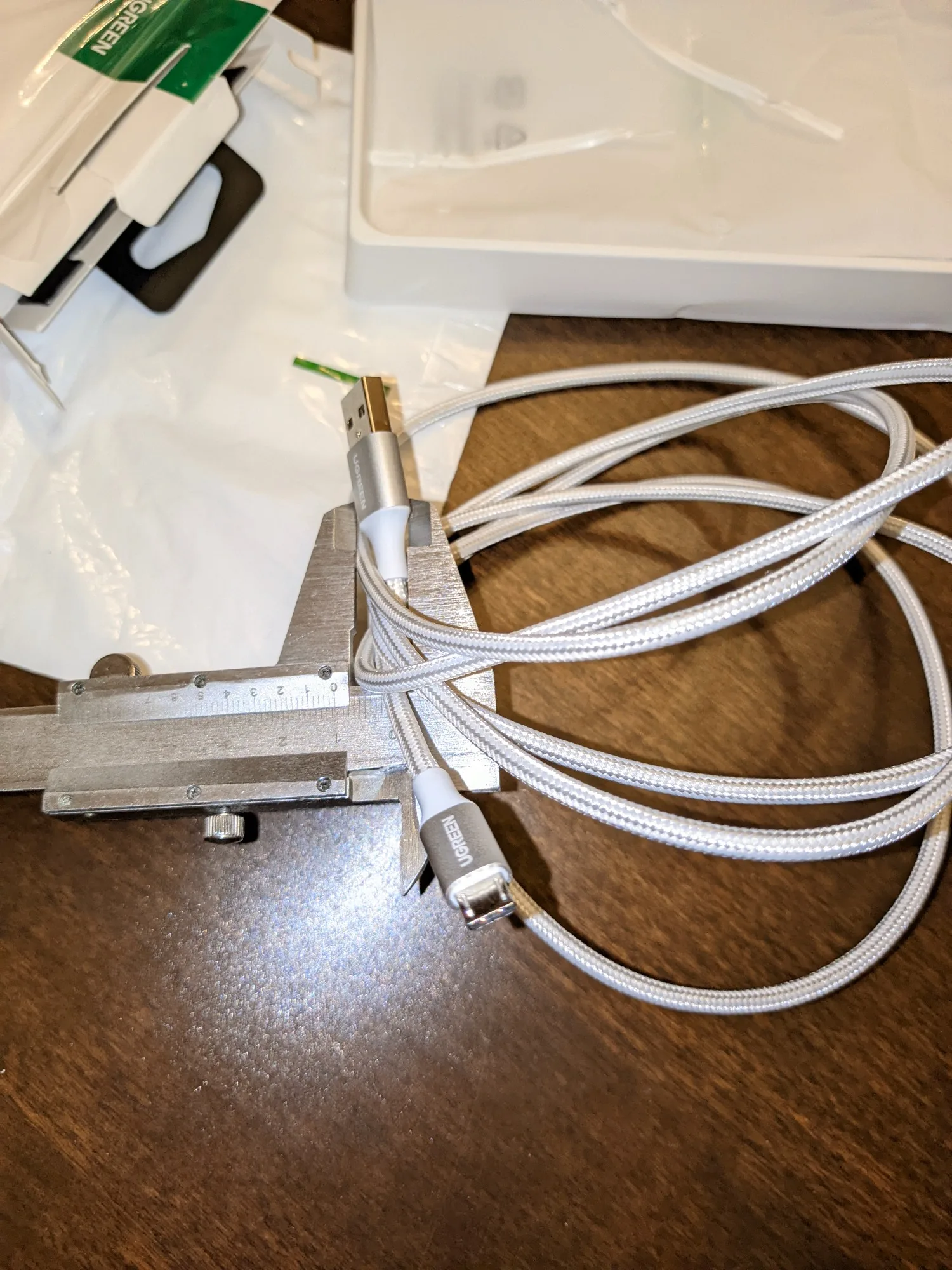 Кабель приятный, в тканевой оплётке, длина 2.02 m с коннекторами, диаметр 4 mm, хорошо держится в аппаратных разъёмах, выполняет свои функции. Заказывал по цене ₽643, включающей доставку, для использования с компактным паровым увлажнителем воздуха. Для устаревшего формата micro USB это дорого. Измерять пропускаемую мощность затруднительно из-за устаревшего формата. Буду надеяться на репутацию кабелей Ugreen. Упаковка традиционная для данного продавца: зип-пакет, коробочка, бело-зелёный фирменный пакет, который потрепался в доставке. Внешний пакет или конверт, маскирующий популярный товар (соблазн для воришек), отсутствует. Заказ от 14 февраля доставлен в ПВЗ вечером 23 февраля - Москва.