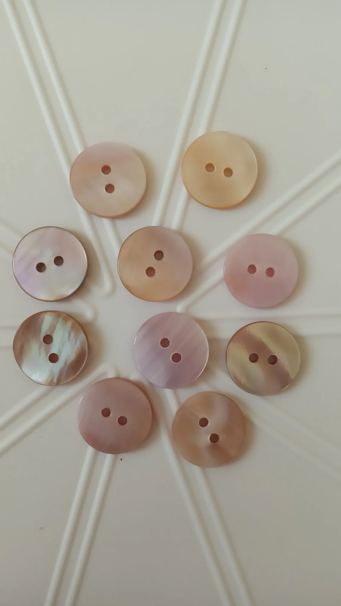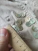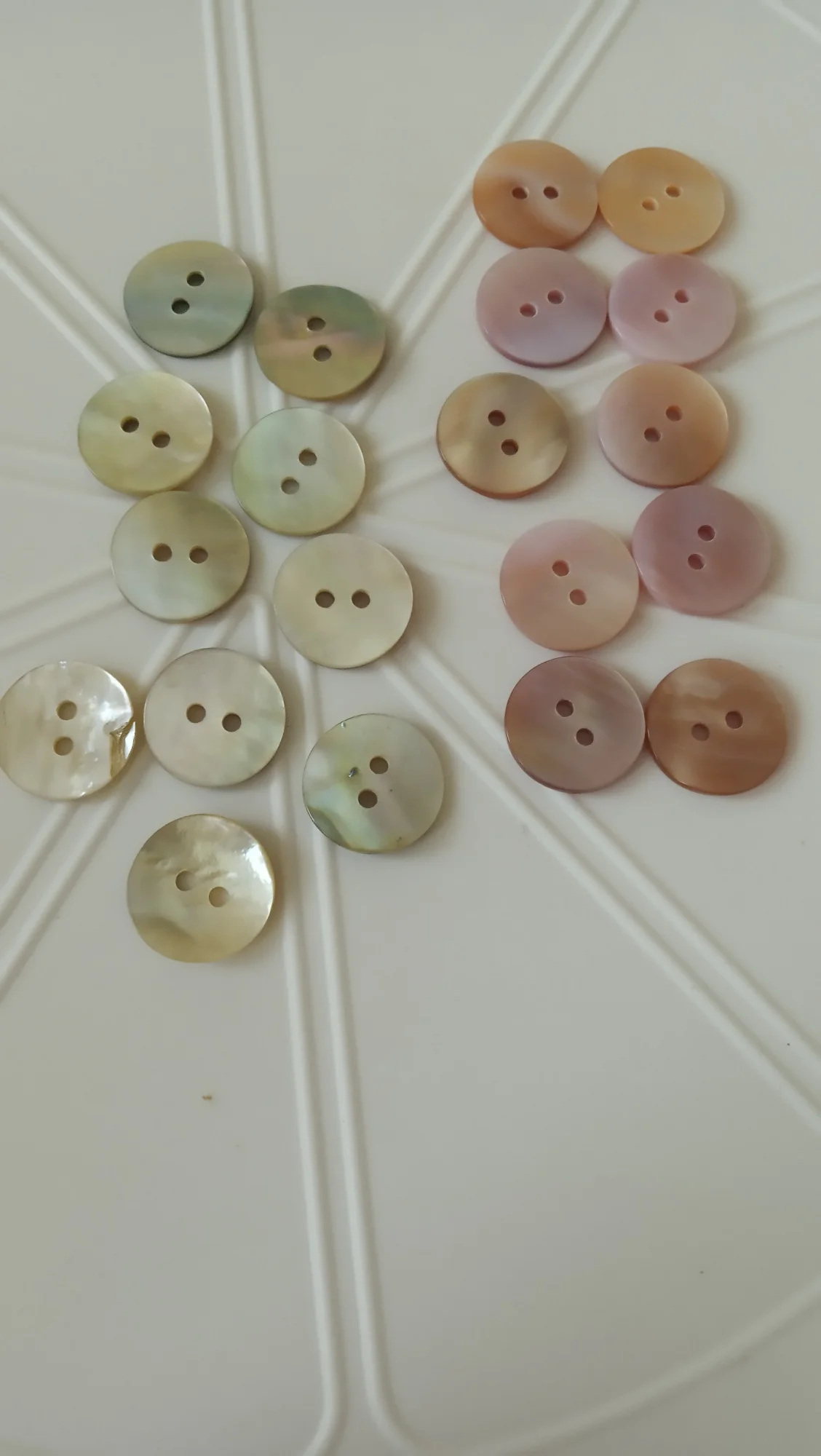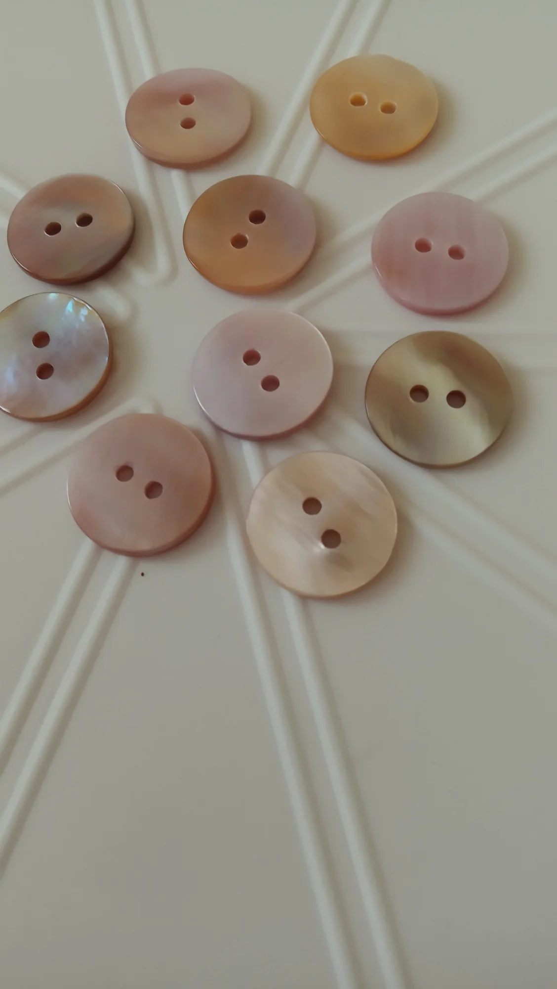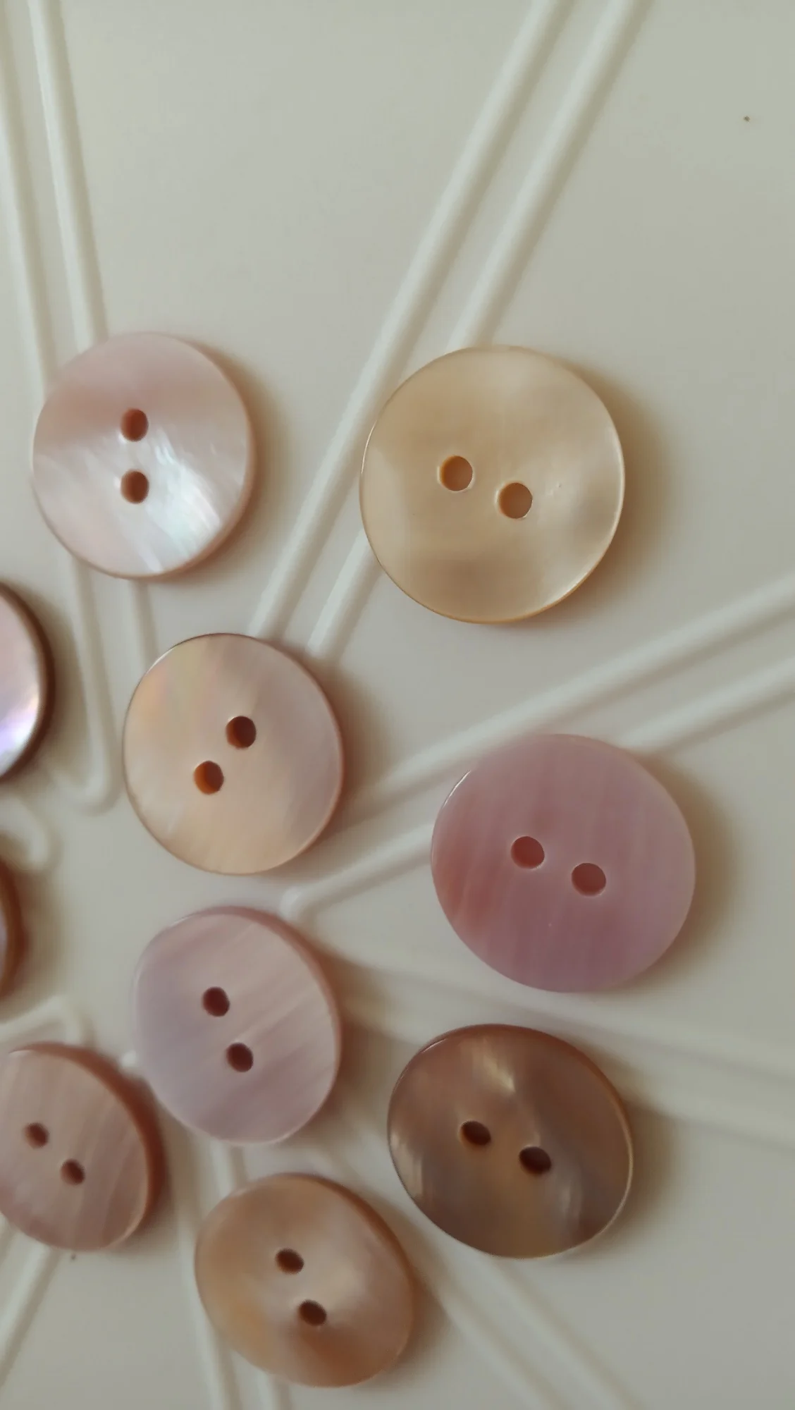 Пуговицы наипрекраснейшие! Это перламутр натуральный. Не тонкие, примерно одной толщины. Красивые переливы перламутра на всех пуговицах. Просто фото это не передаёт, я постаралась повертеть их, но всё равно наяву гораздо прекраснее. На трёх фото они с белыми, номером 1. Видна разница в цвете. Брала как вариант к изделию из натурального шелка (выбирала из 2-х цветов). И хоть остановилась на первом цвете, но эти пуговки прям фавориты пр качеству.