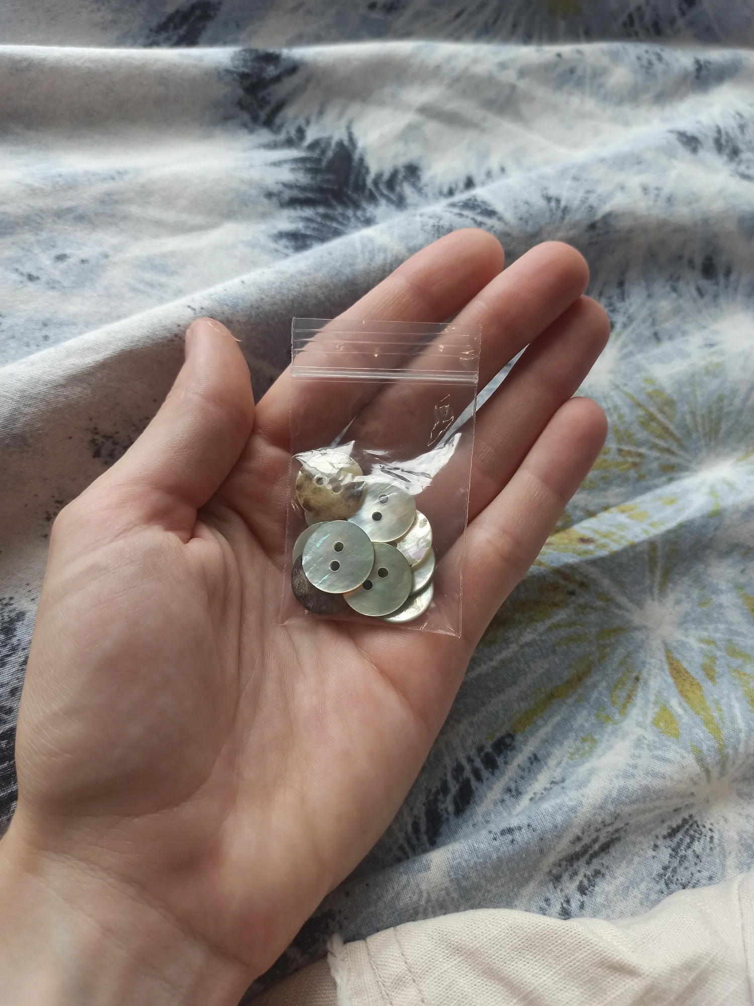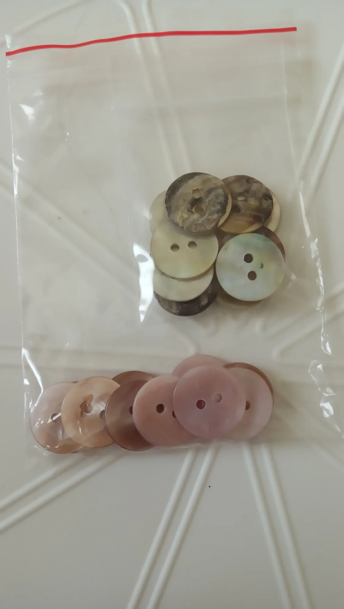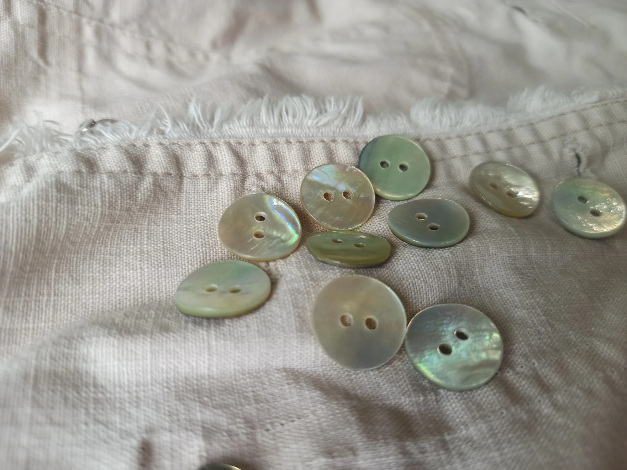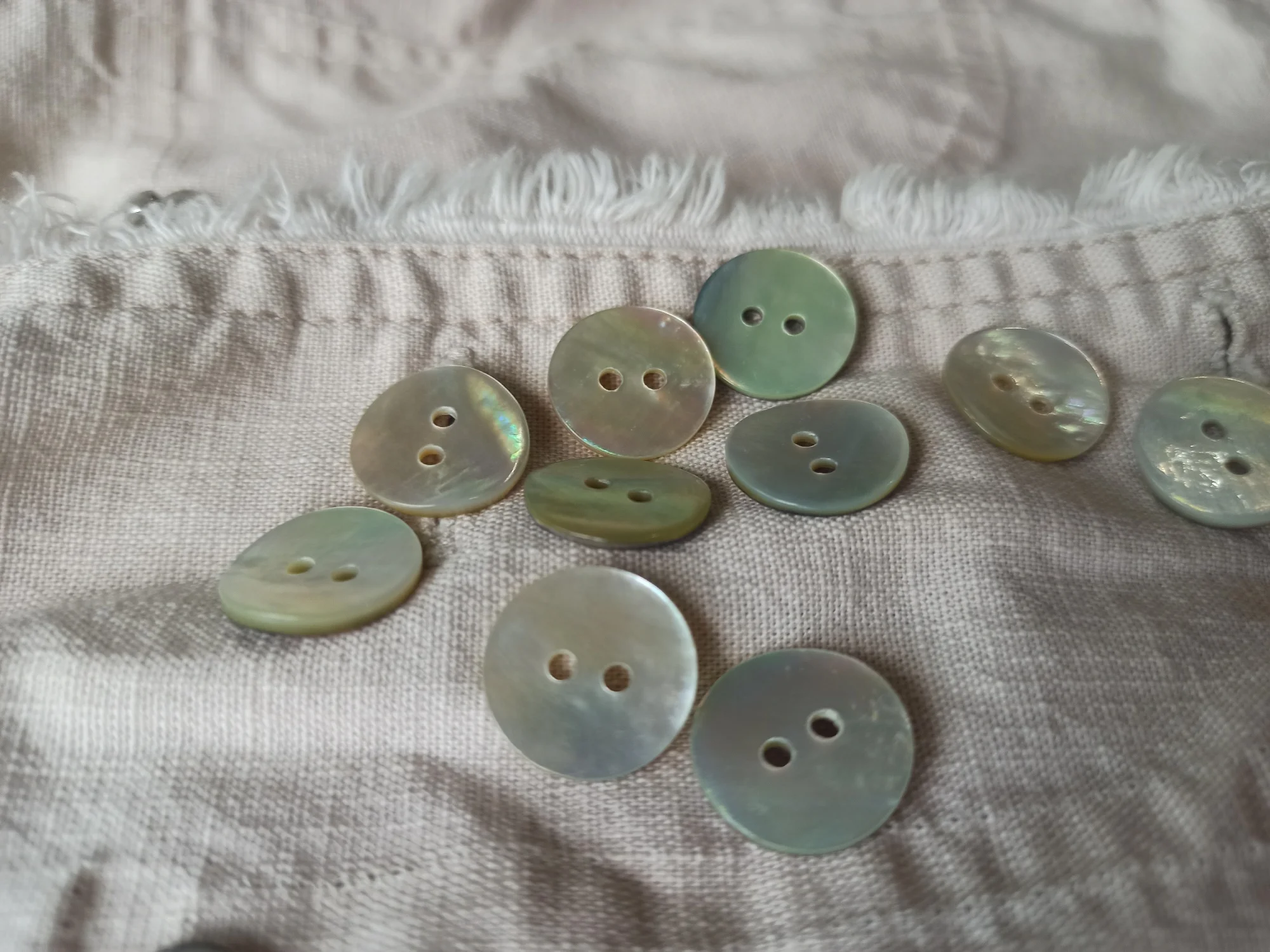 Пуговицы наипрекраснейшие! Это перламутр натуральный. Не тонкие, примерно одной толщины. Красивые переливы перламутра на всех пуговицах. Просто фото это не передаёт, я постаралась повертеть их, но всё равно наяву гораздо прекраснее. На трёх фото они с белыми, номером 1. Видна разница в цвете. Брала как вариант к изделию из натурального шелка (выбирала из 2-х цветов). И хоть остановилась на первом цвете, но эти пуговки прям фавориты пр качеству.