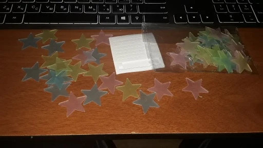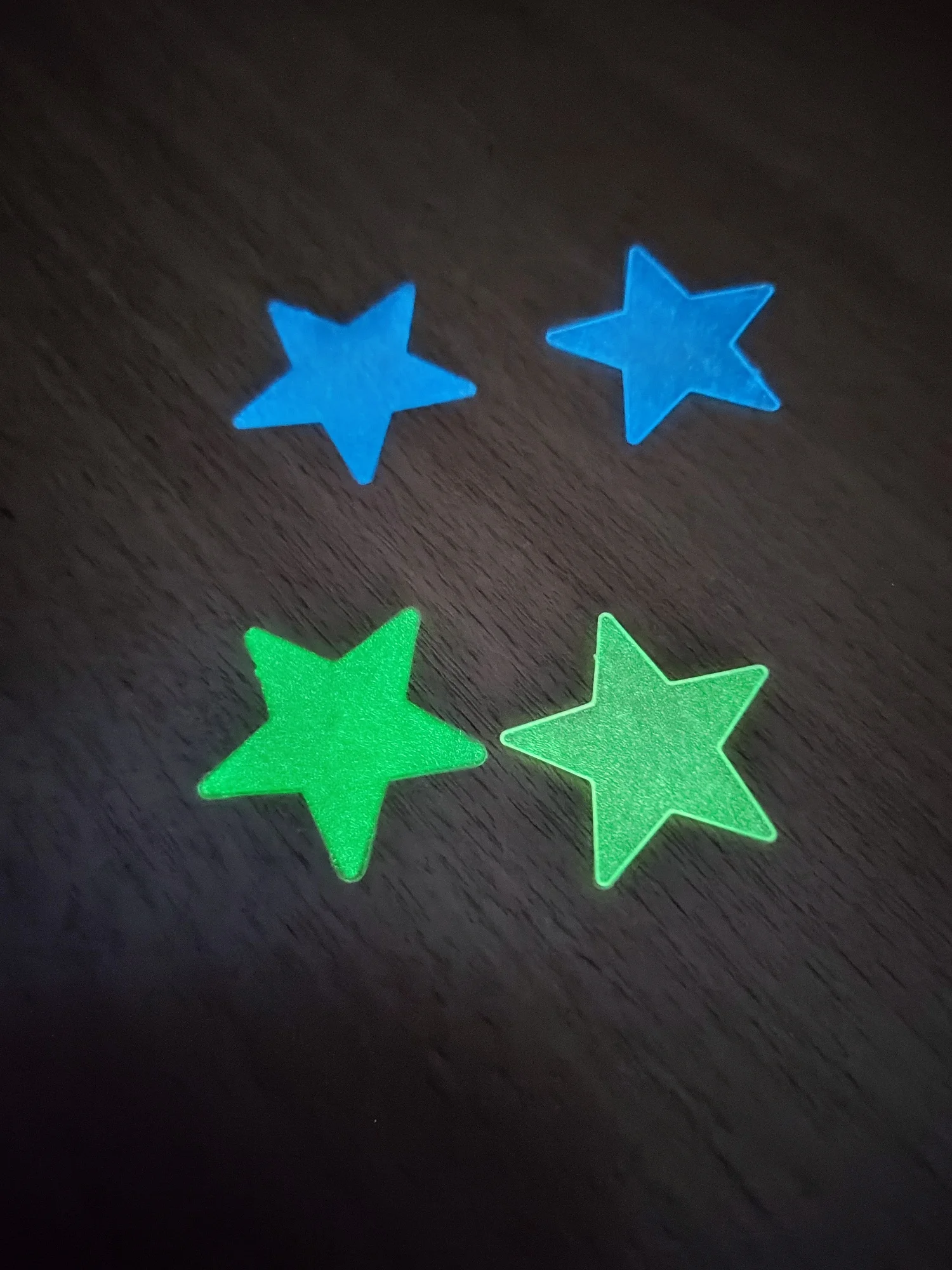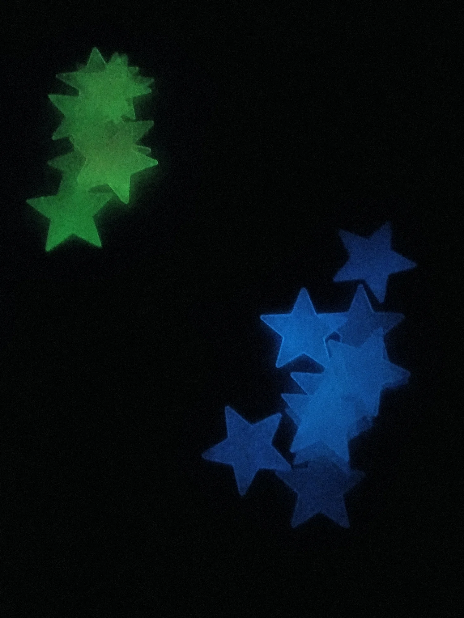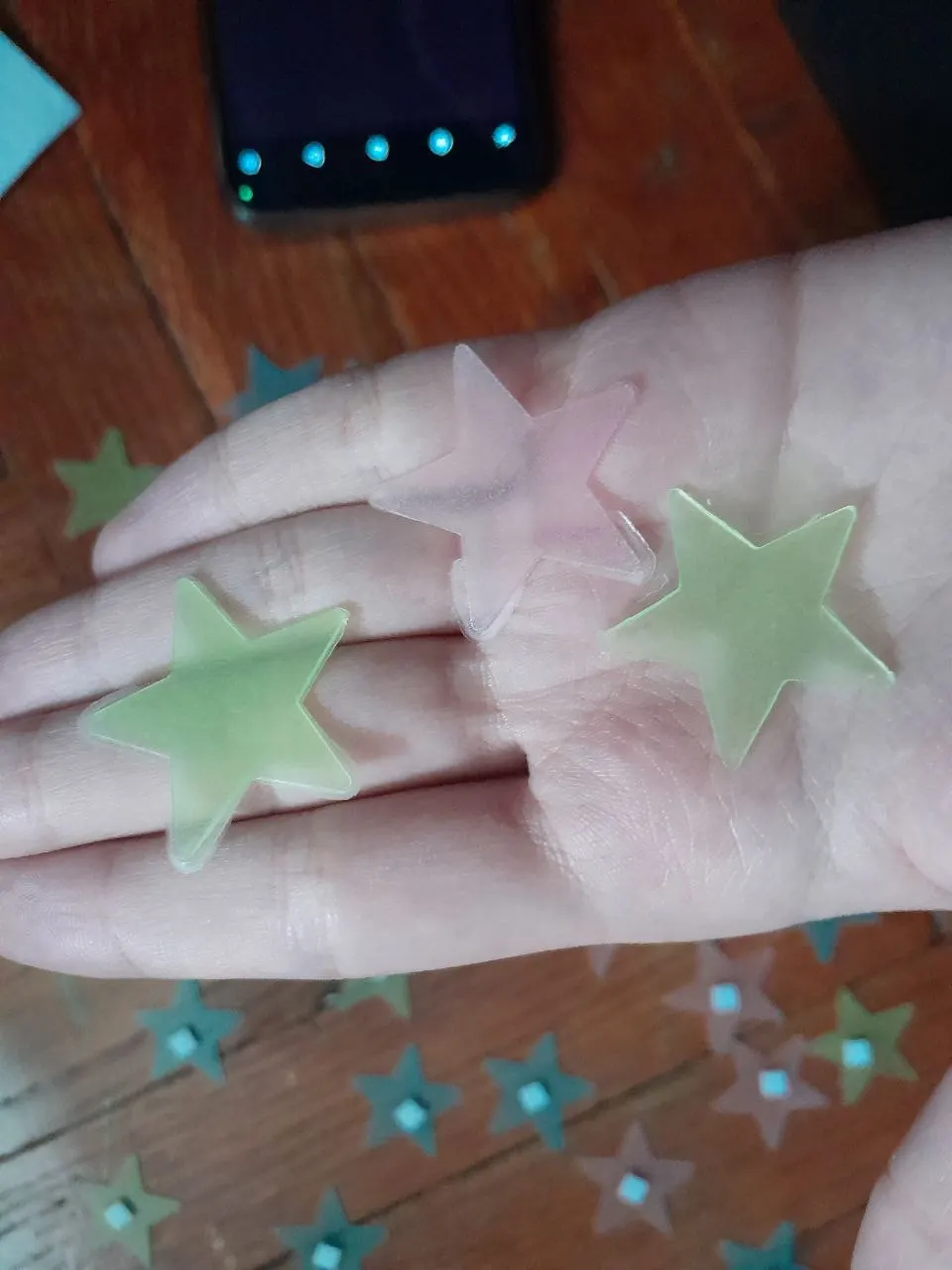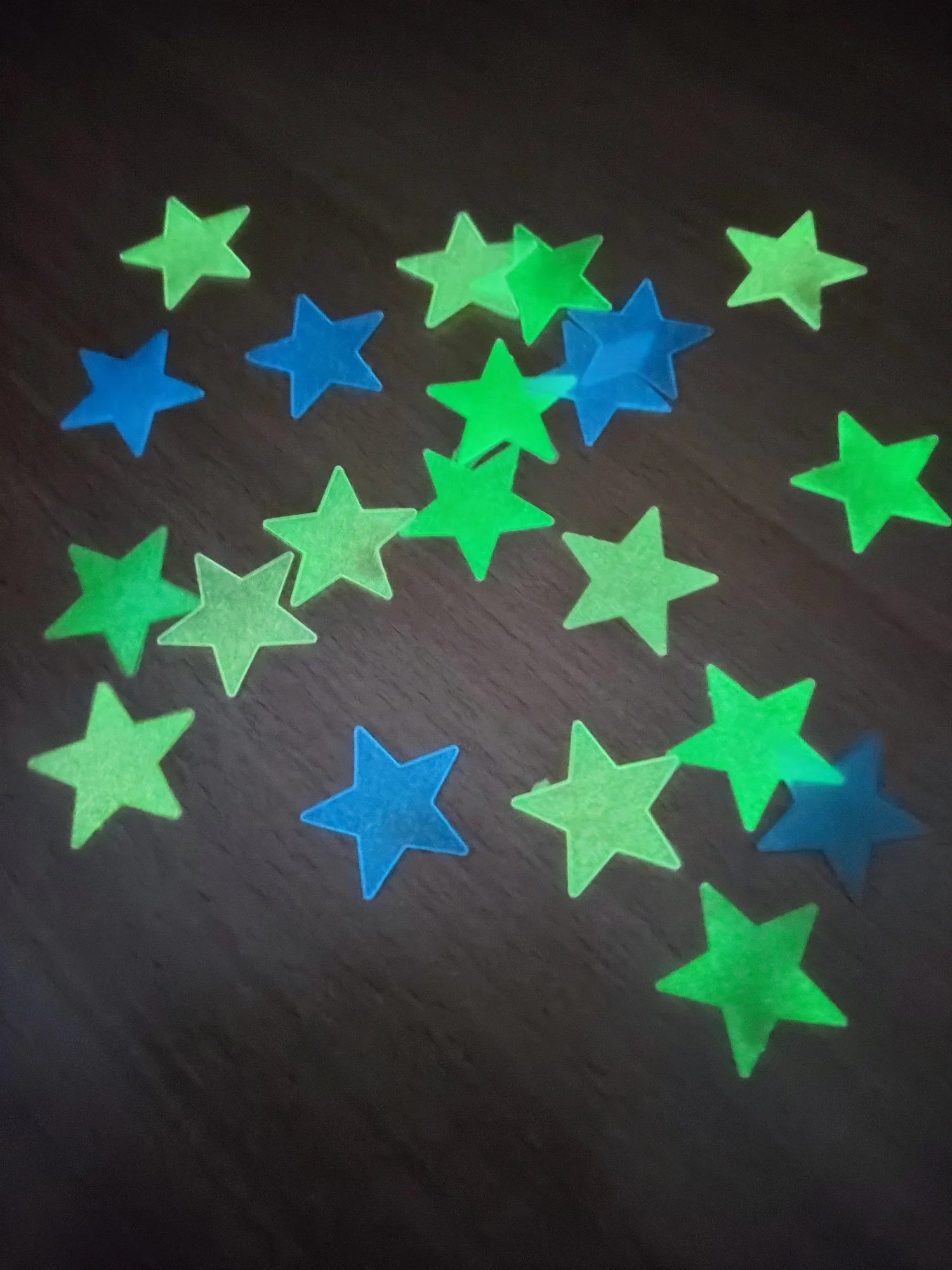 Цікавеньки зірочки. Іграшка. Відразу після засвічення лампою, світяться добре, тому наклеїли на плафон. Ще на пульт від тв. Навіть до ранку світяться, хоч дуже дуже слабенько. Очікування значно більші за реальність, в реальності тілька перші хвилини вау ефект, а далі майже не видно. Якщо є сенсорні лампи реагуючі на рух, то зірочки будуть краще відновлювати свічення, періодично поновлюватись. у комплекті є готова нарізана квадратиками двостороння клейка стрічка, зручно. на стелю ще не клеїли. Сині зірочки майже не світяться, купляти такі не варто.
