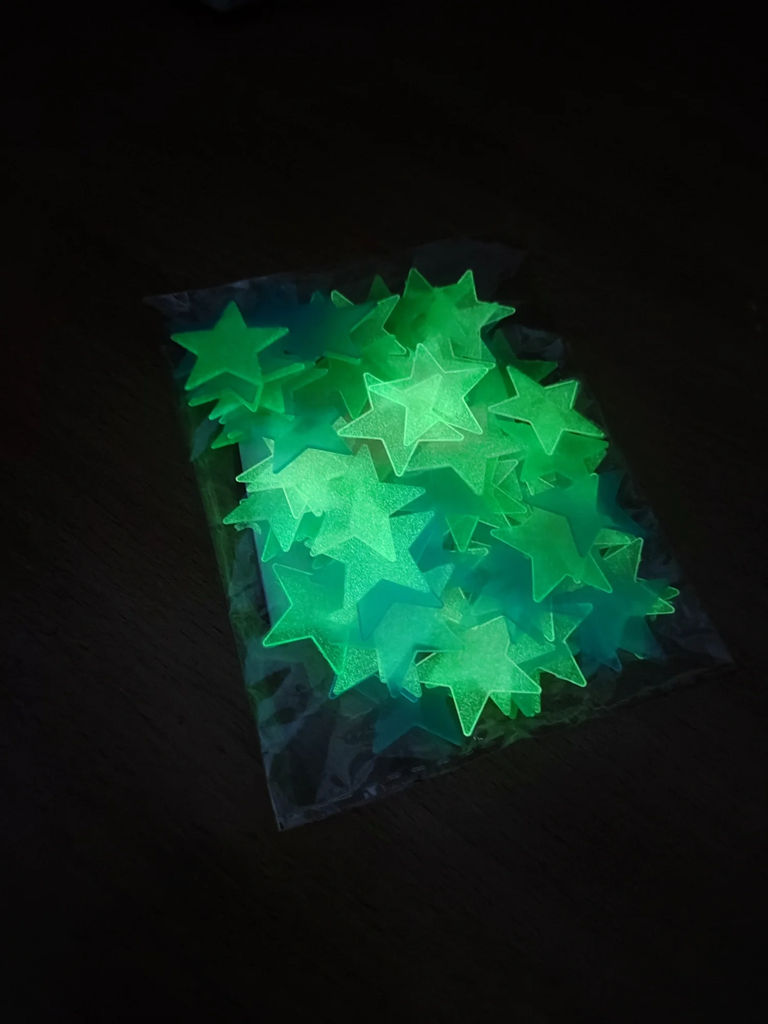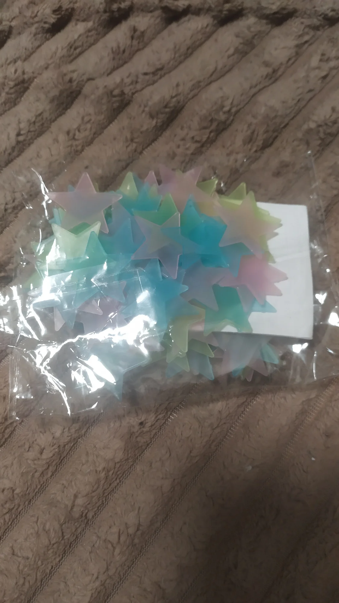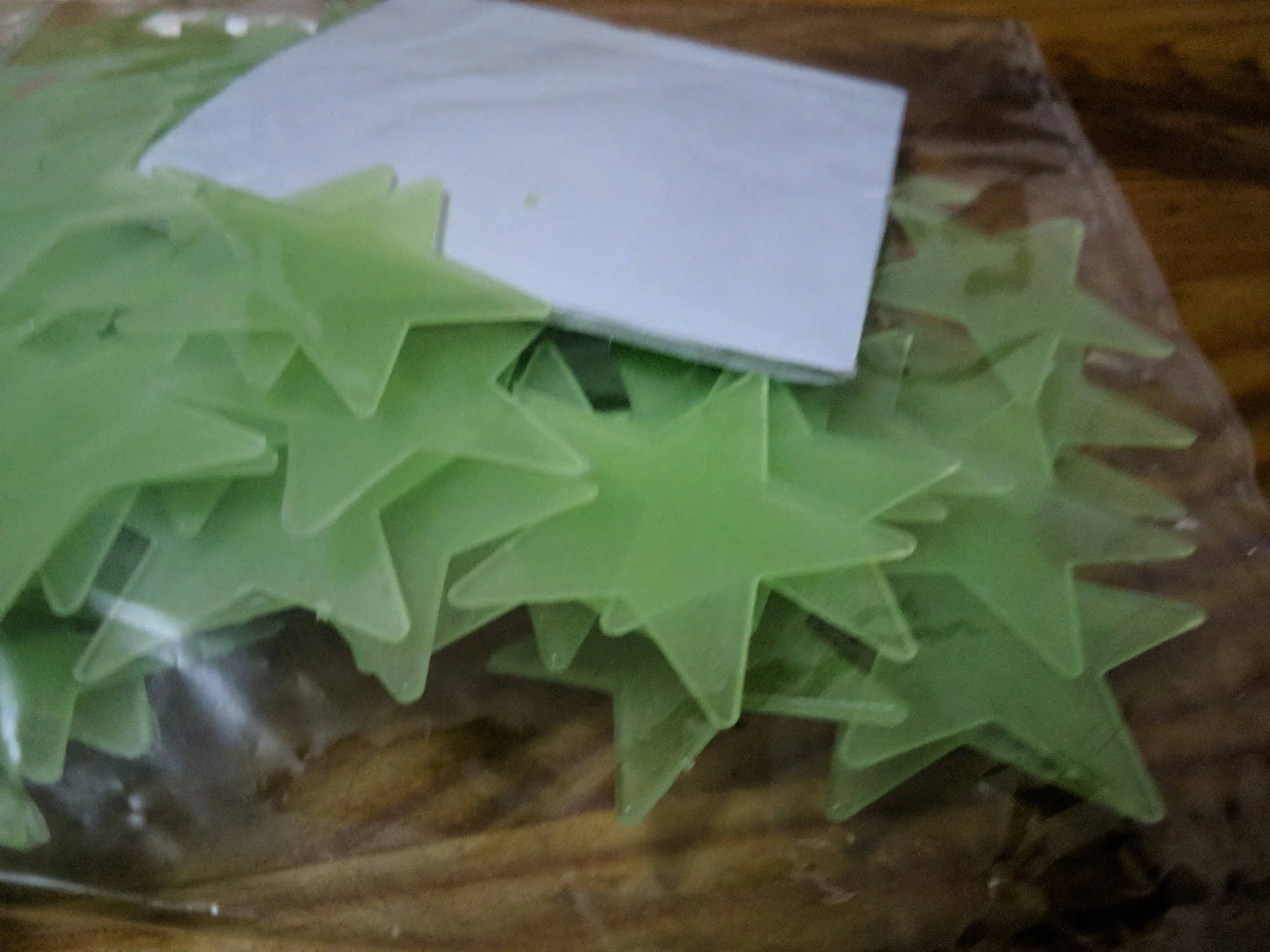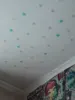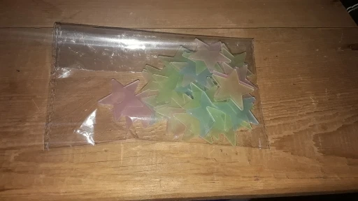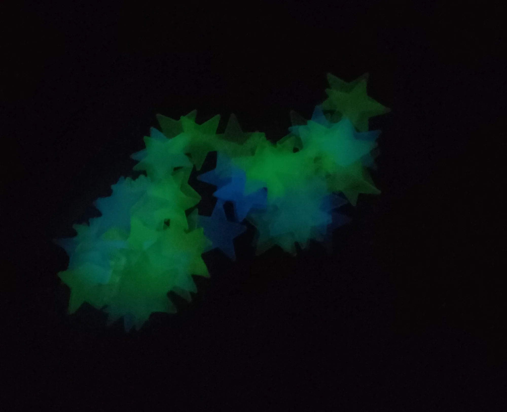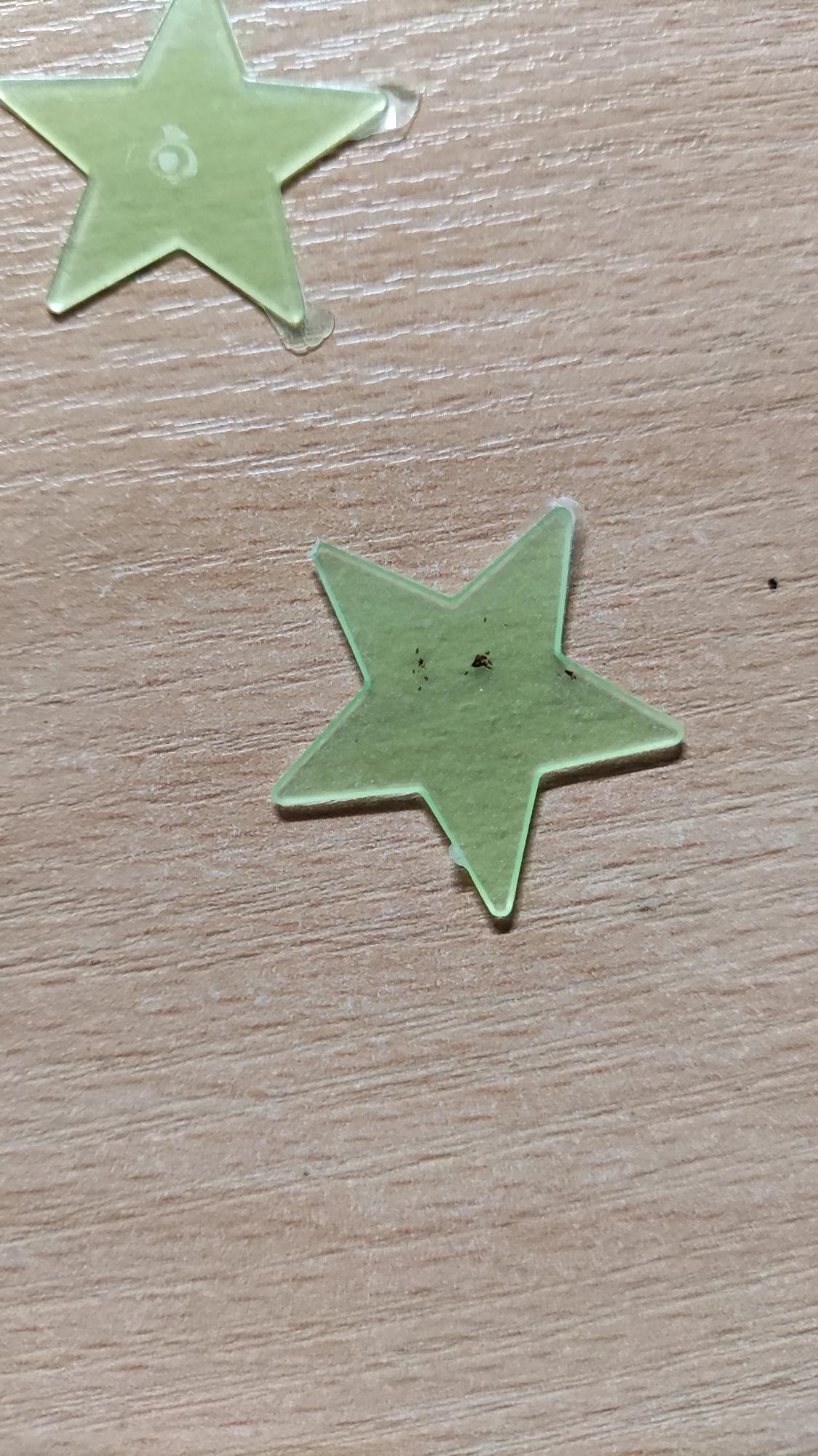 Цікавеньки зірочки. Іграшка. Відразу після засвічення лампою, світяться добре, тому наклеїли на плафон. Ще на пульт від тв. Навіть до ранку світяться, хоч дуже дуже слабенько. Очікування значно більші за реальність, в реальності тілька перші хвилини вау ефект, а далі майже не видно. Якщо є сенсорні лампи реагуючі на рух, то зірочки будуть краще відновлювати свічення, періодично поновлюватись. у комплекті є готова нарізана квадратиками двостороння клейка стрічка, зручно. на стелю ще не клеїли. Сині зірочки майже не світяться, купляти такі не варто.