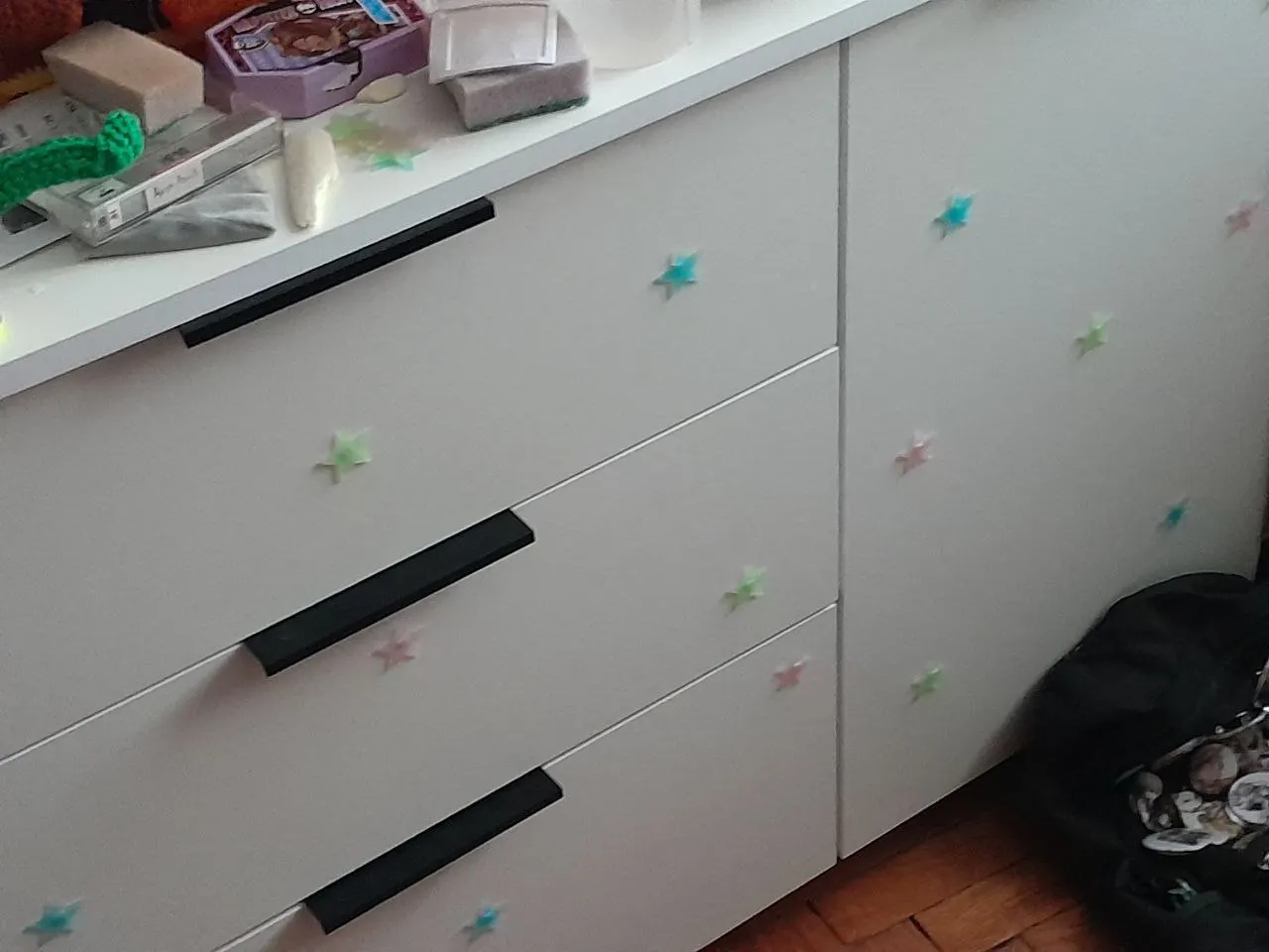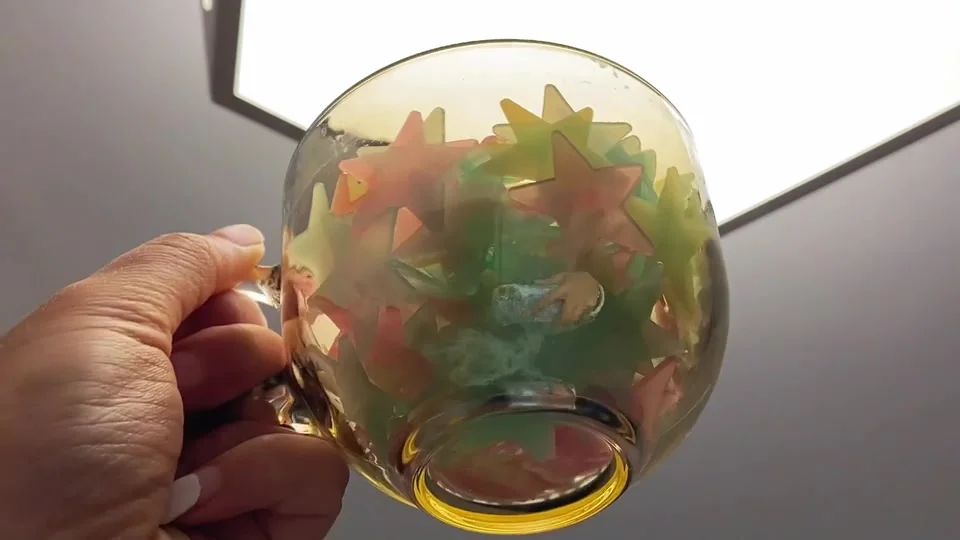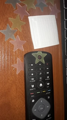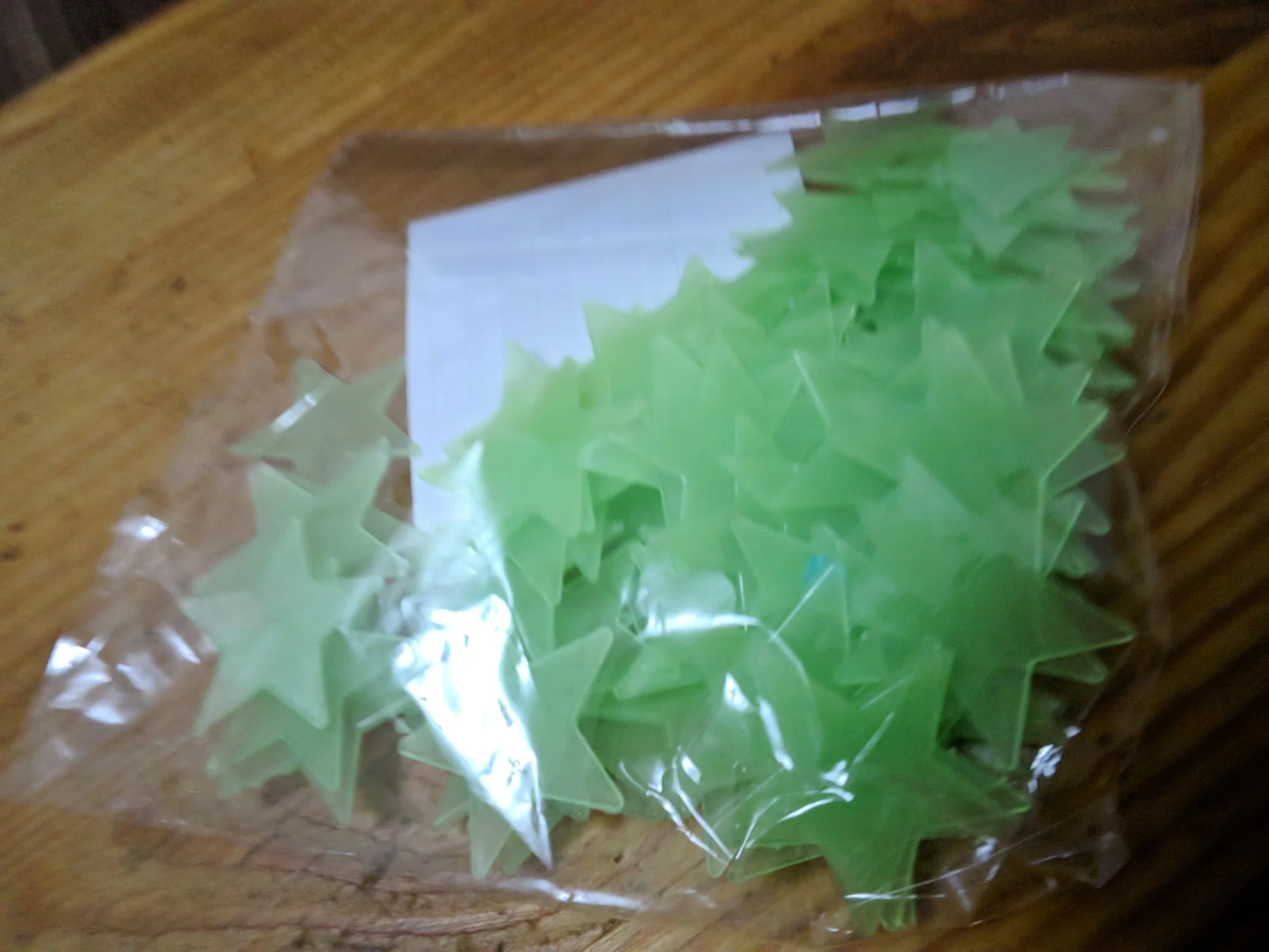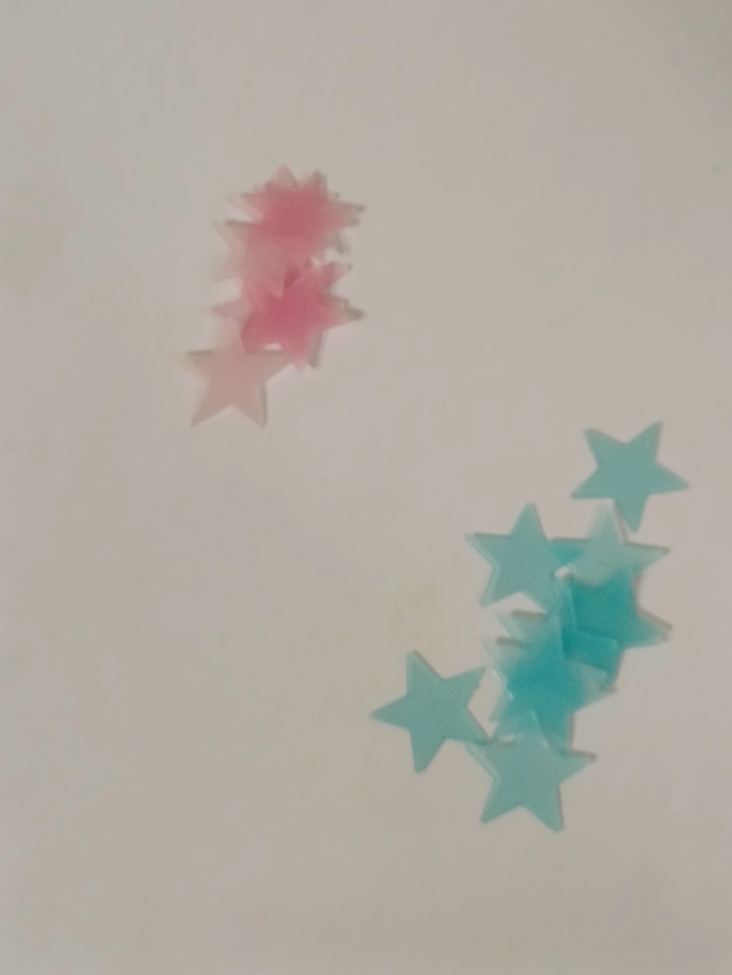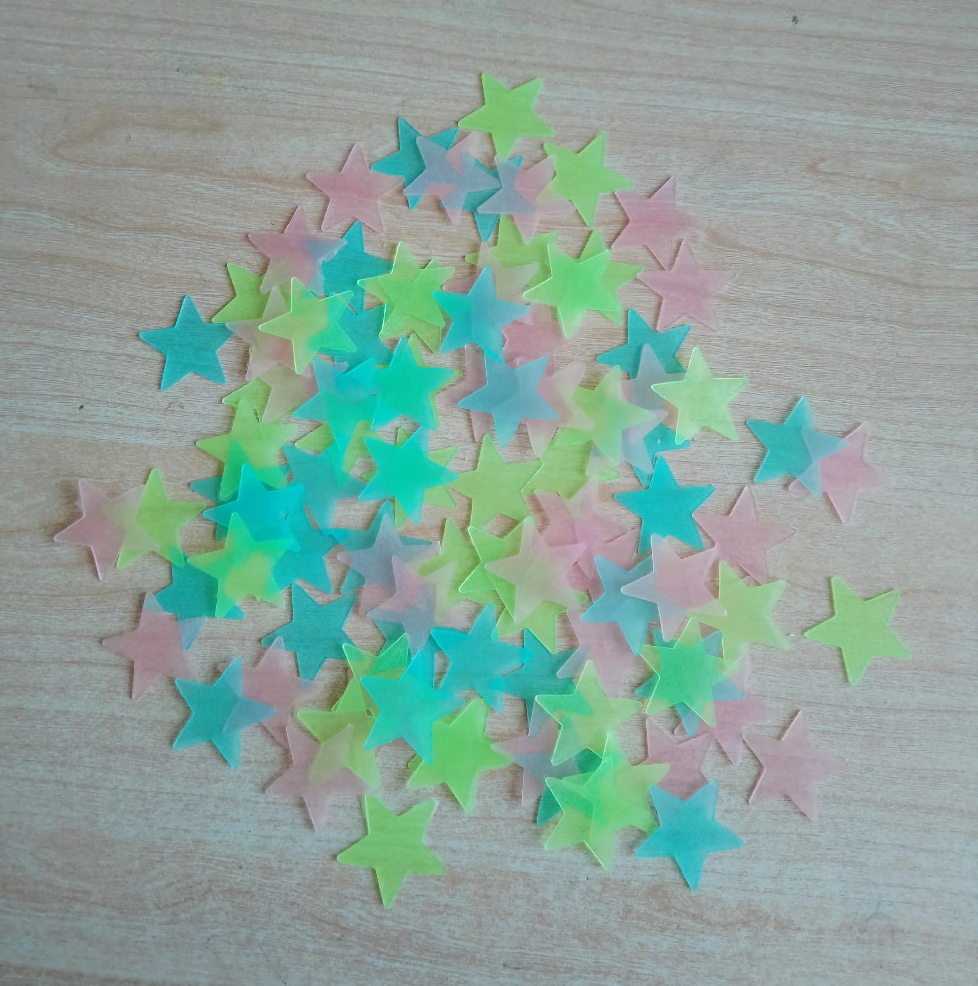 Цікавеньки зірочки. Іграшка. Відразу після засвічення лампою, світяться добре, тому наклеїли на плафон. Ще на пульт від тв. Навіть до ранку світяться, хоч дуже дуже слабенько. Очікування значно більші за реальність, в реальності тілька перші хвилини вау ефект, а далі майже не видно. Якщо є сенсорні лампи реагуючі на рух, то зірочки будуть краще відновлювати свічення, періодично поновлюватись. у комплекті є готова нарізана квадратиками двостороння клейка стрічка, зручно. на стелю ще не клеїли. Сині зірочки майже не світяться, купляти такі не варто.