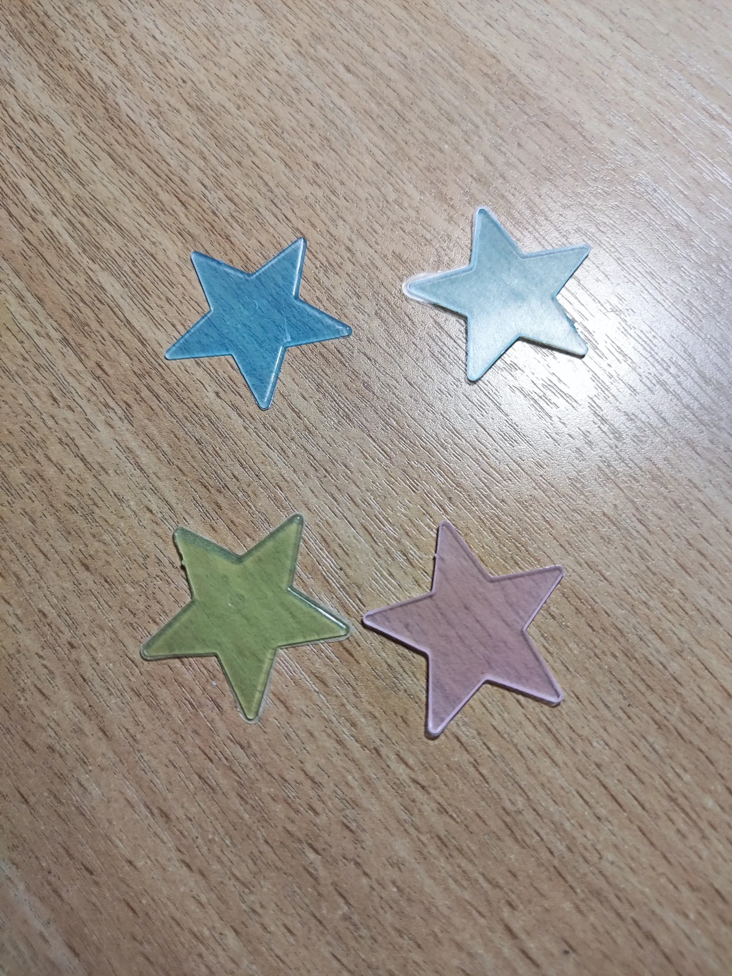 Звёздочки тонкие, пластиковые. Очень хорошо светятся когда они лежат все в куче, по одной светятся плохо. Положили 97 штук вместо 100 , а может это просто я где то потерял по распаковке 3шт, в целом не критично.
