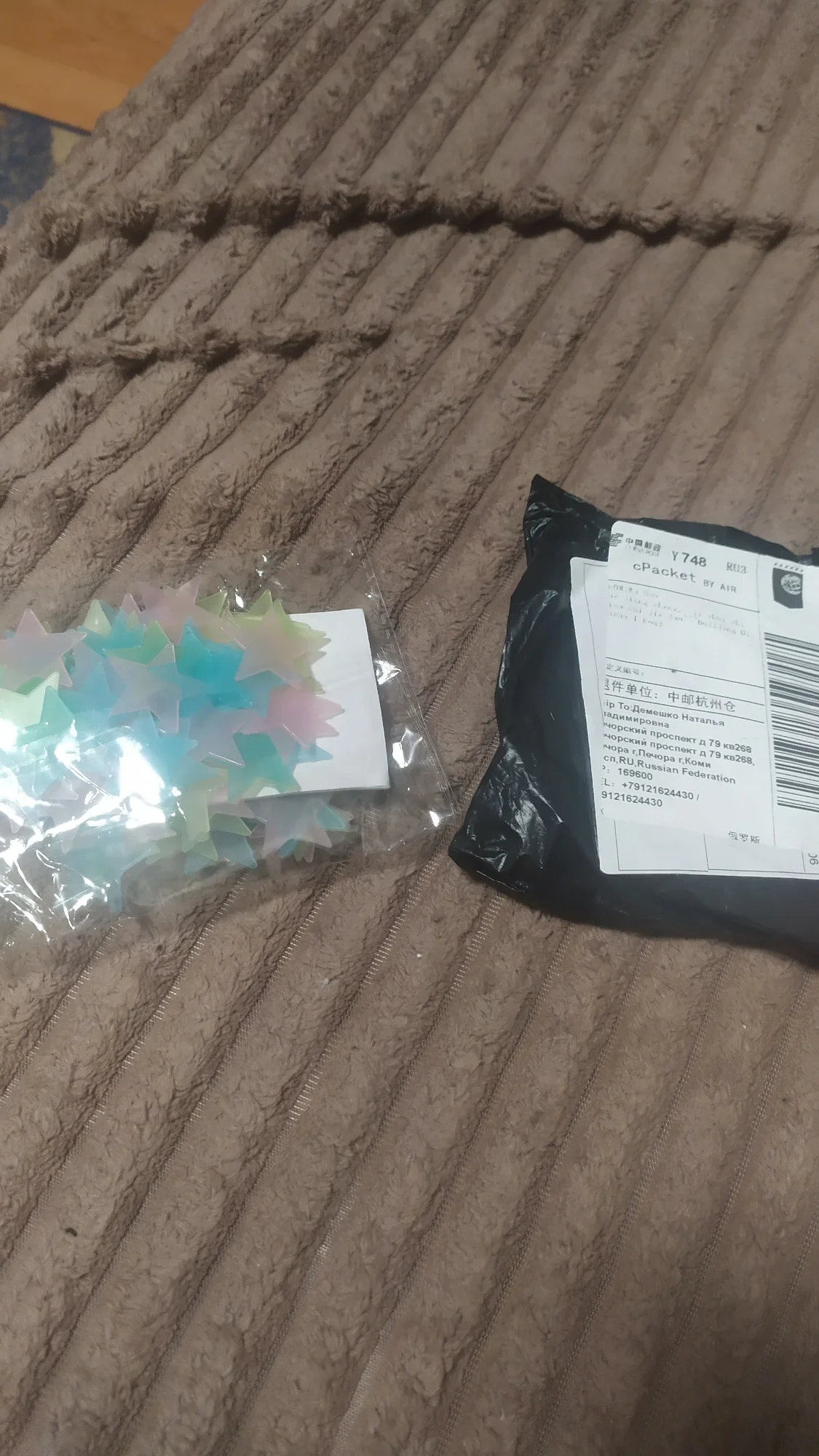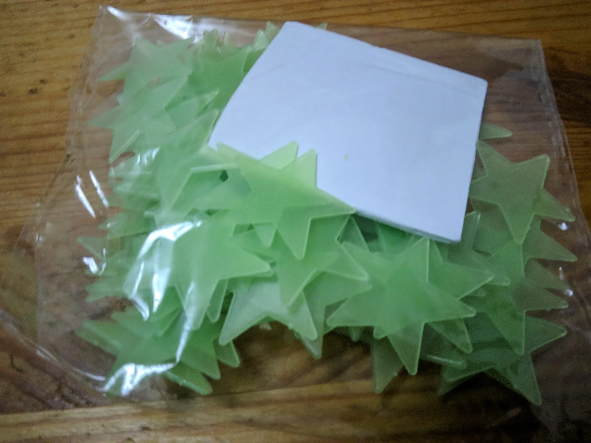 Хорошие звёздочки, в комплекте идут кусочки двухстороннего скотча и инструкция. Синие звёздочки светят похуже, чем зелёные и розовые. Но если синие подержать на свету подольше, то их тоже хорошо видно.
