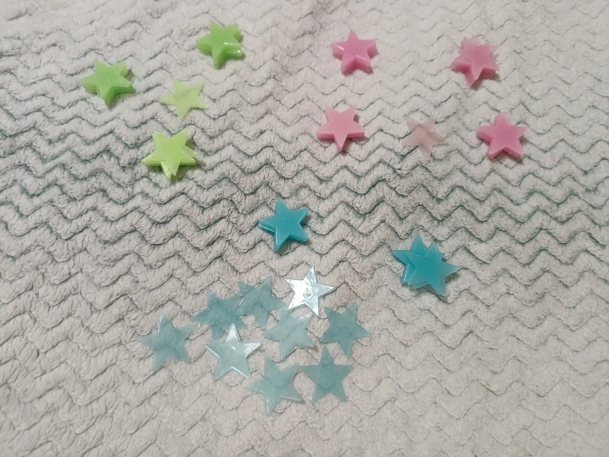 пересчитала все звёзды по цветам, может их и не ровное количество, но приличное все же. Зелёных 31 штука, розовых 41 и голубых 29, я удивилась и пошла в калькулятор и правда, 101 штуку прислали, что очень круто. На вид очень тонкие и кажется, что свет не держат, но это вовсе не так, если их зарядить, то они очень даже яркие, ярче предыдущего моего заказа звёзд, что плотнее, наверное только они быстрее разрядится и не будут светиться, но думаю часа два точно продержатся, чего хватит перед сном, чтобы полюбоваться. Из прикольного, думала синие тоже будут зелёным святиться, но нет, только розовые не своим цветом, а значит синим отдаю предпочтение.