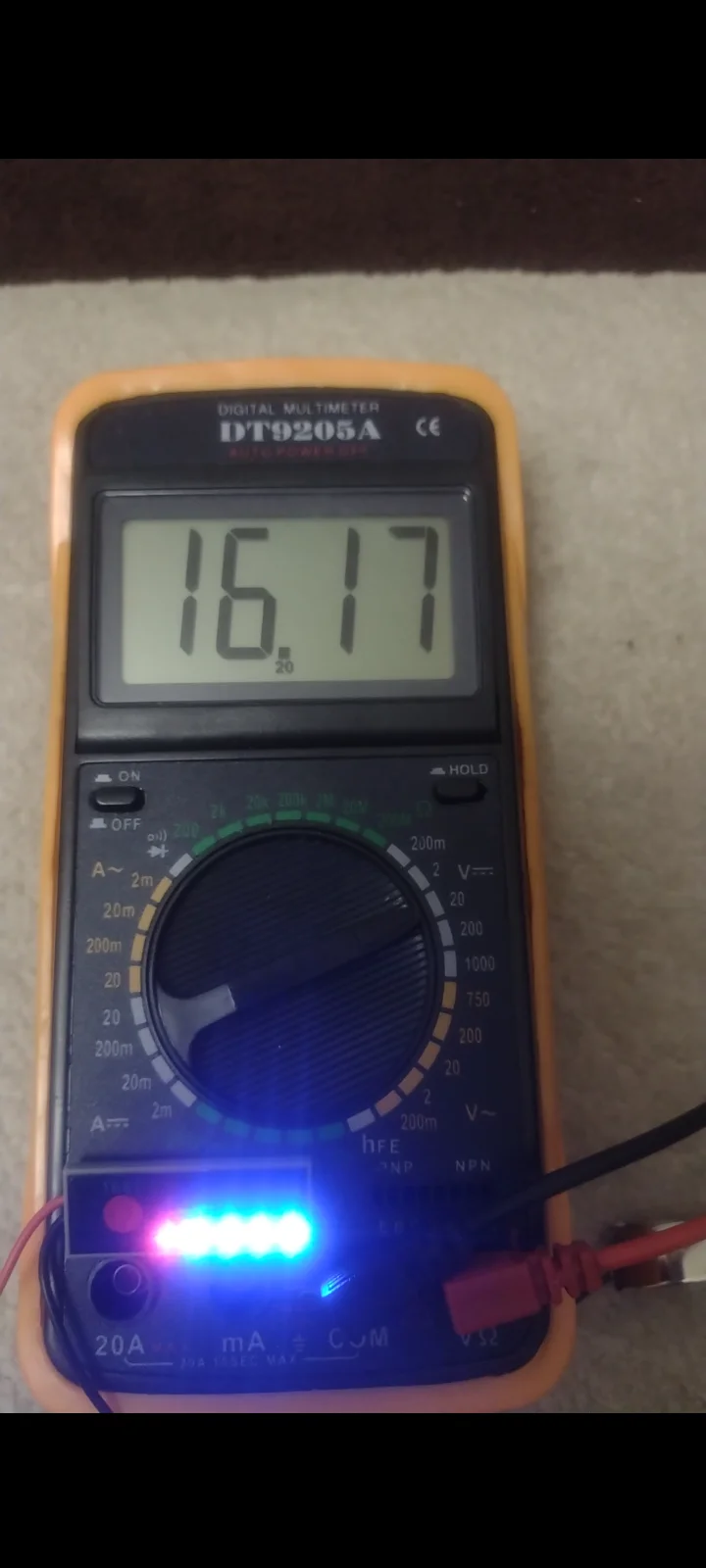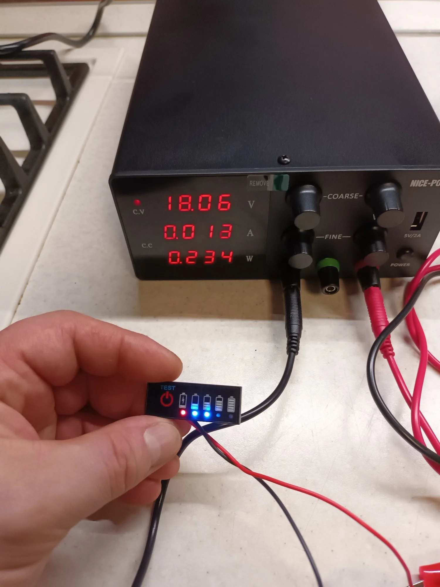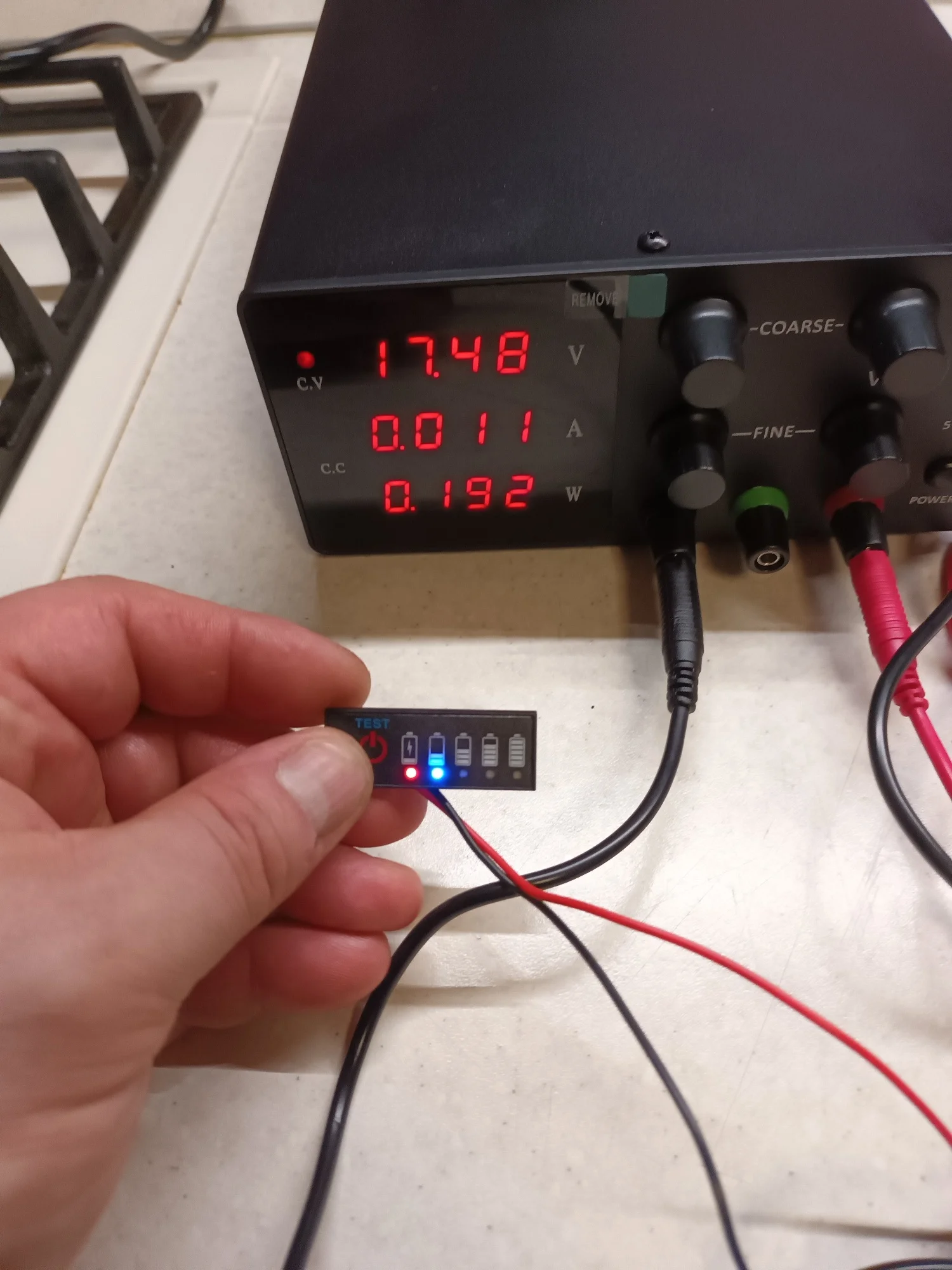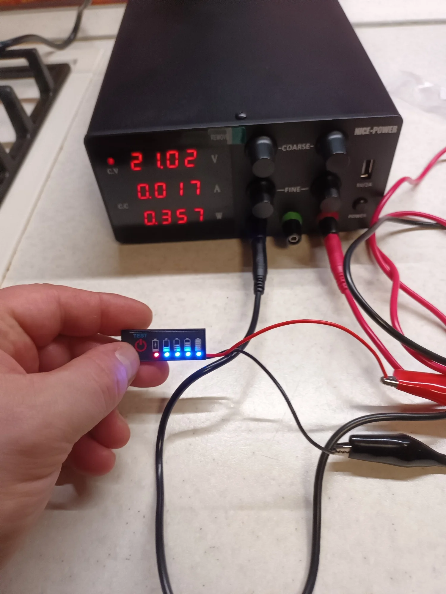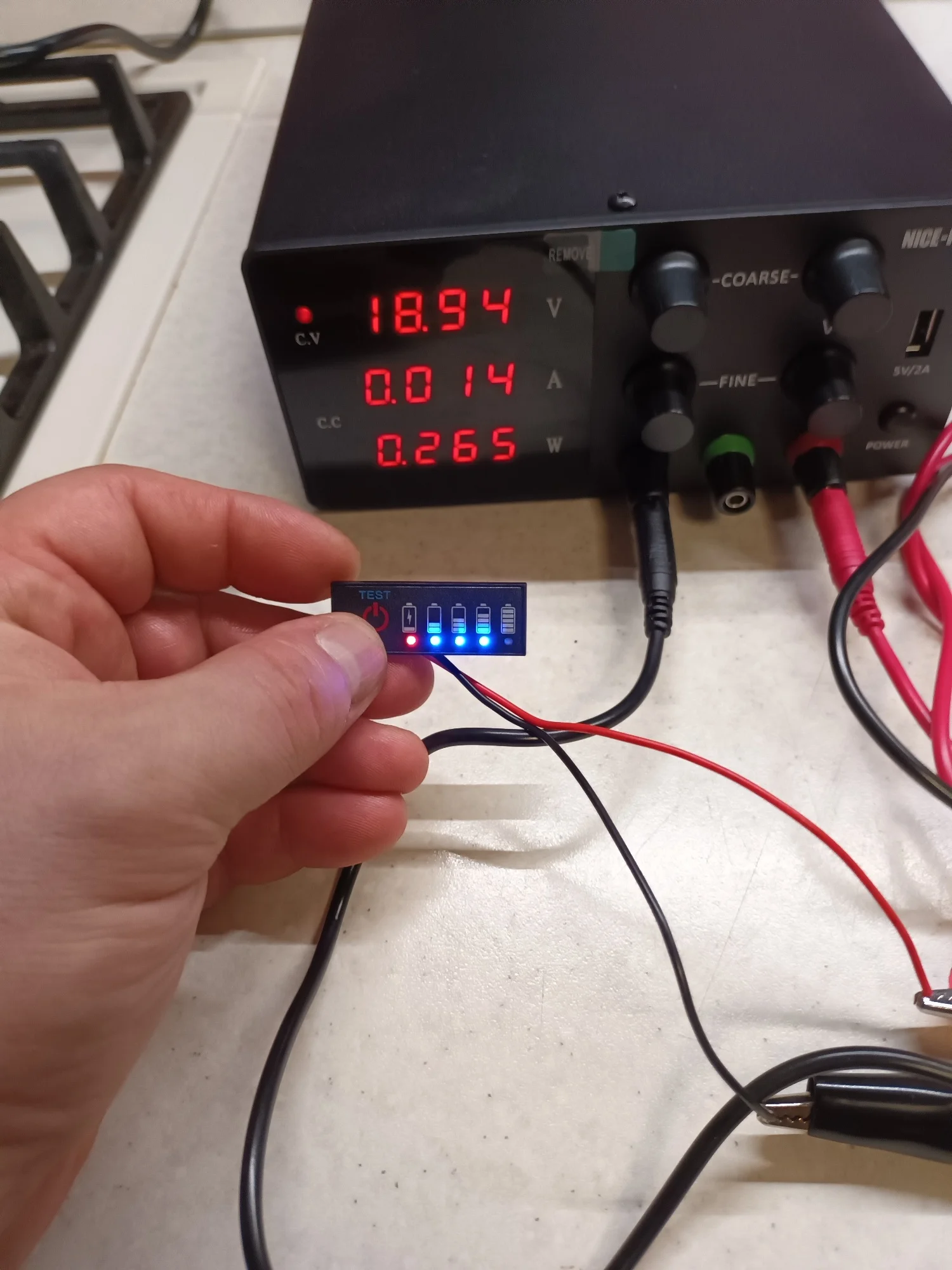 Когда напряжение аккумулятора превышает N×3,3 В, загорается второй синий индикатор.