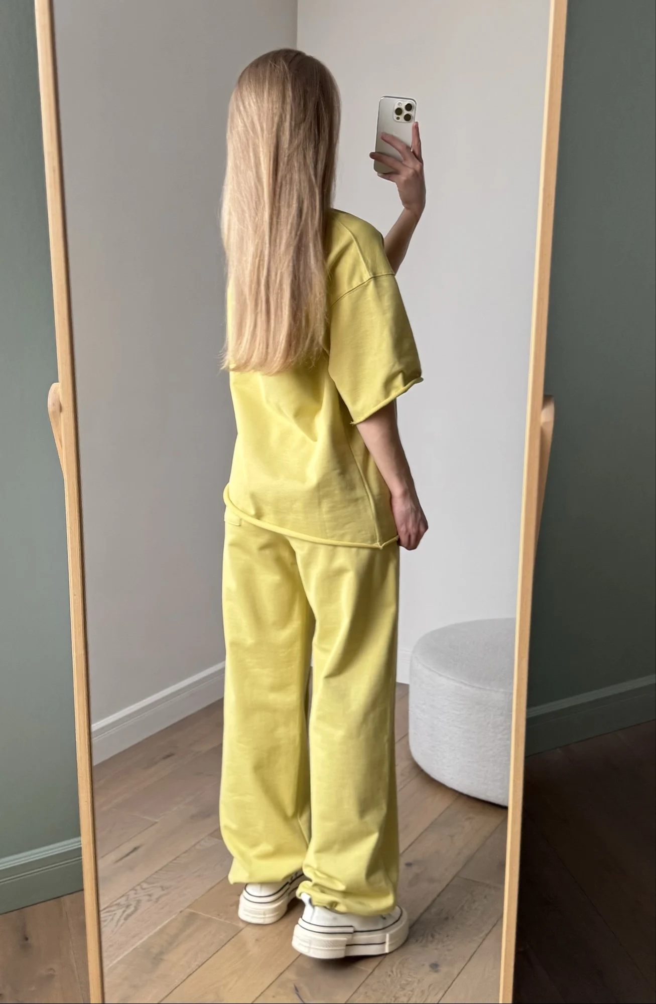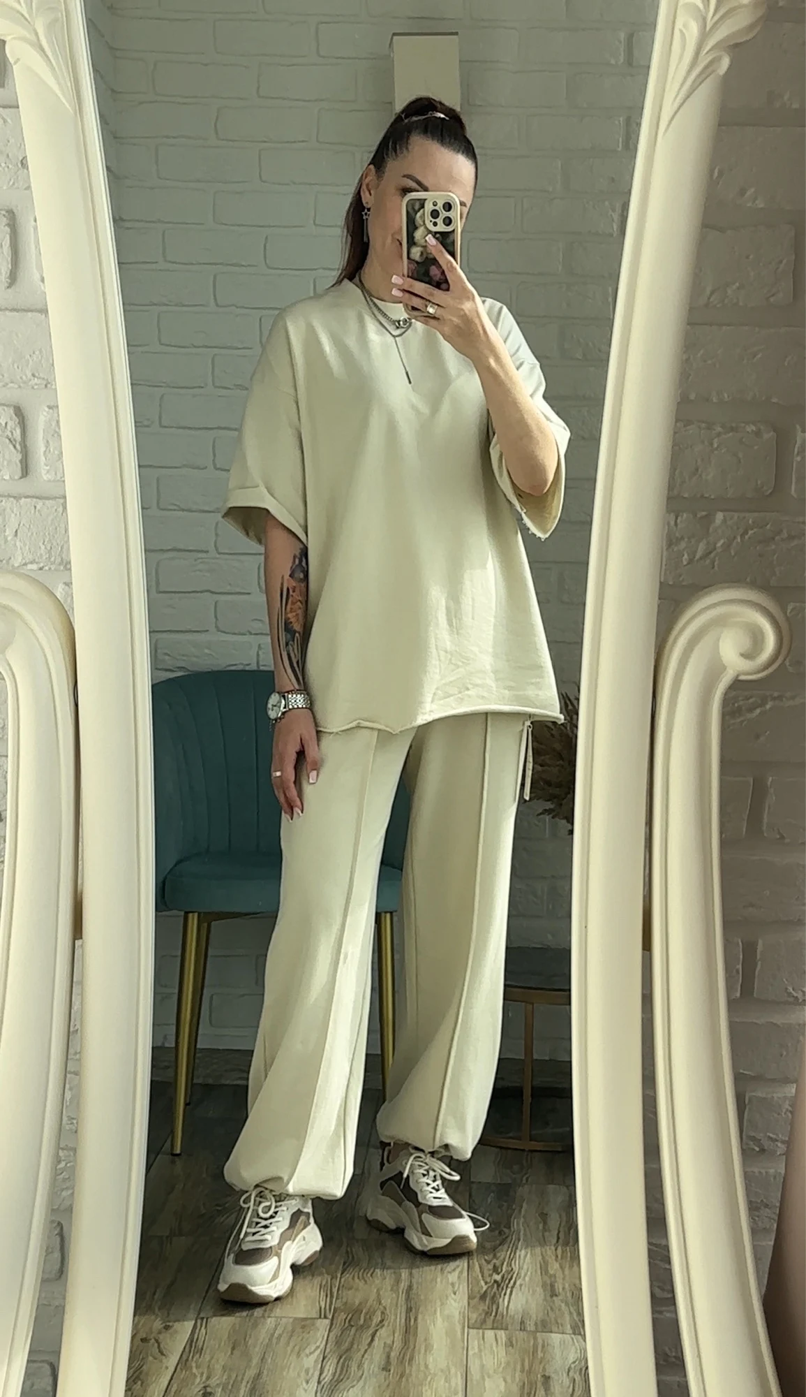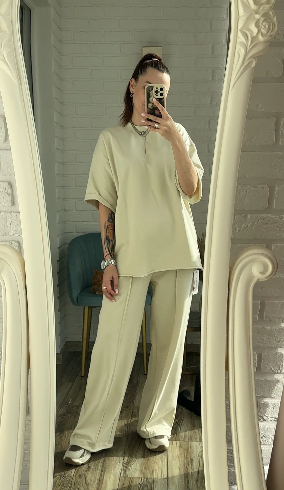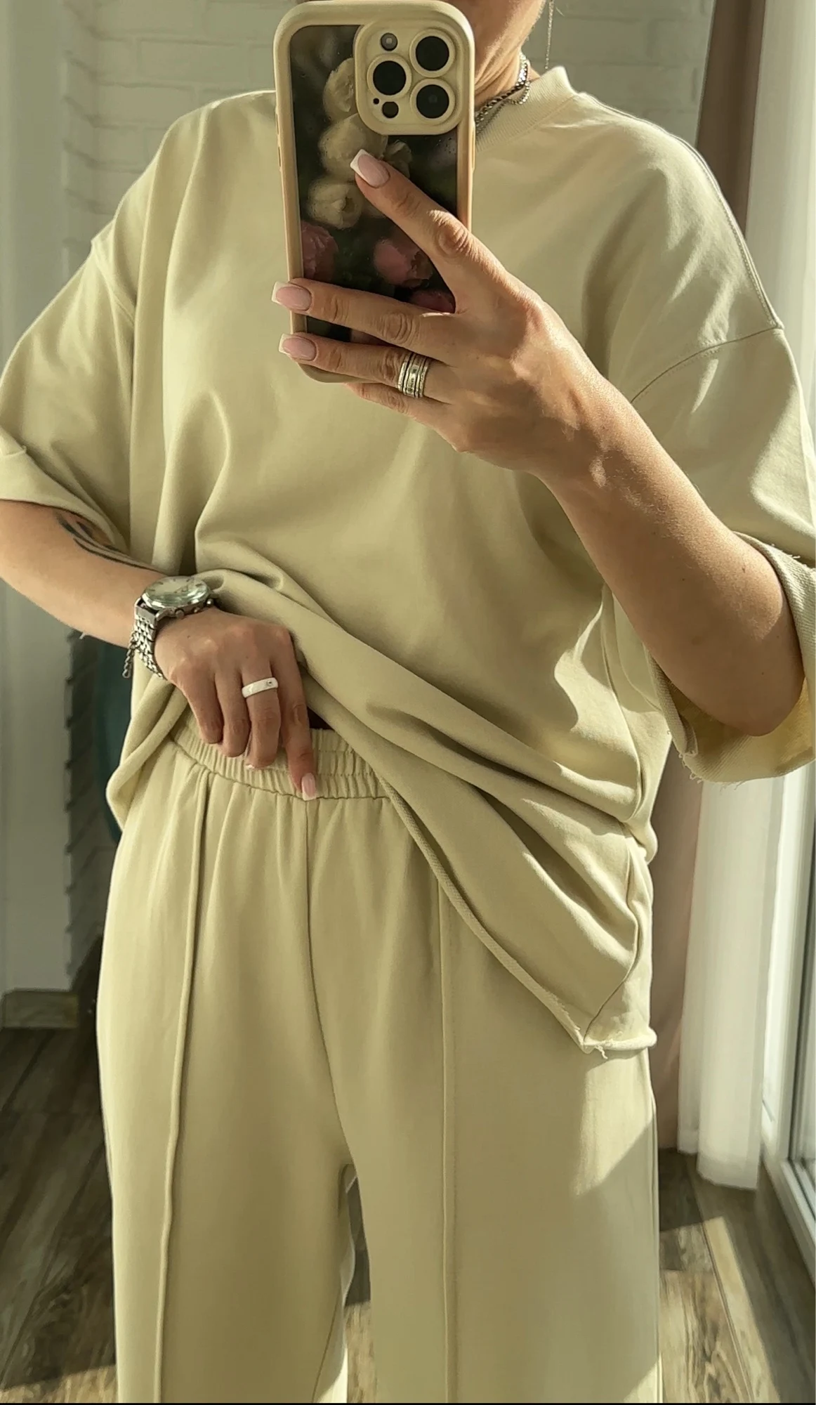 Отличный хлопковый костюм на теплую весну и лето)) На мои параметры 80/62/93 размер S сел свободно. У брюк снизу кулиски, которые при желании можно затянуть и получатся джоггеры. Если не затягивать, то на мой рост 165 см брюки длинные, лучше подойдут на рост от 170 см. Качество отличное. В составе 100% хлопок. Материал достаточно плотненький.