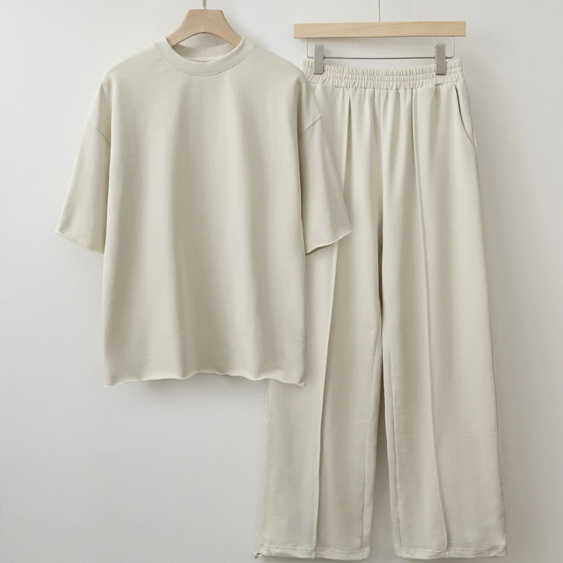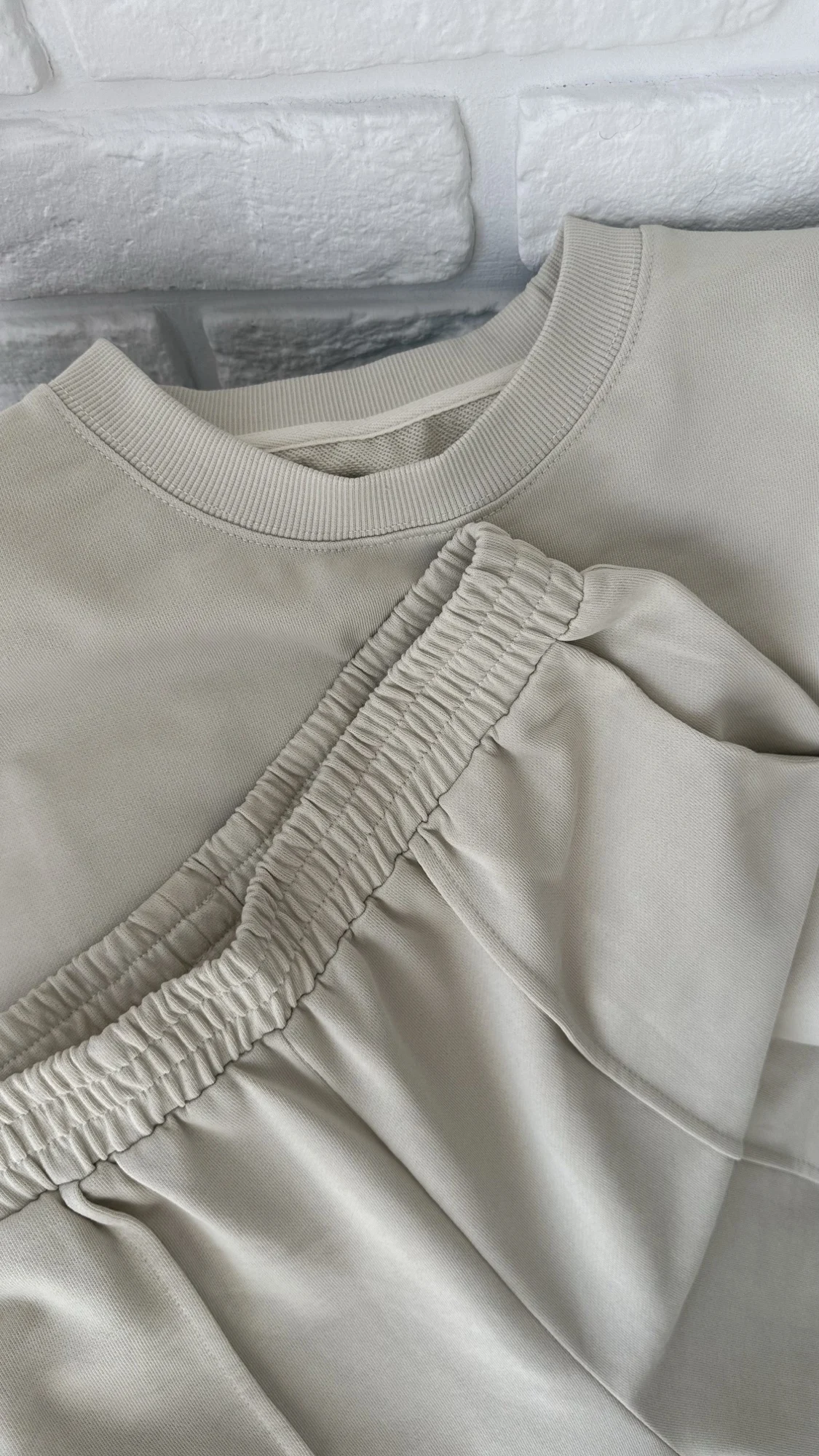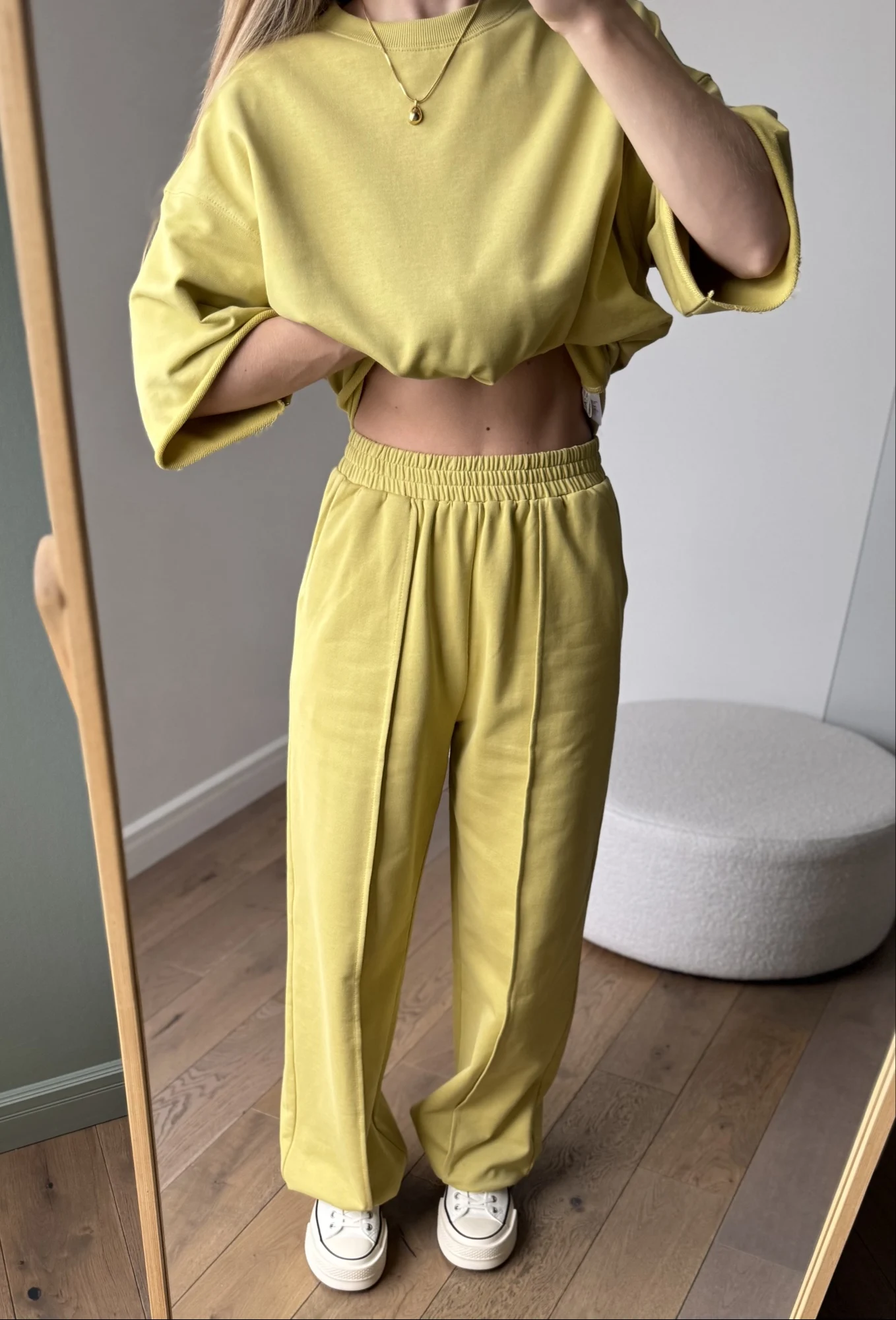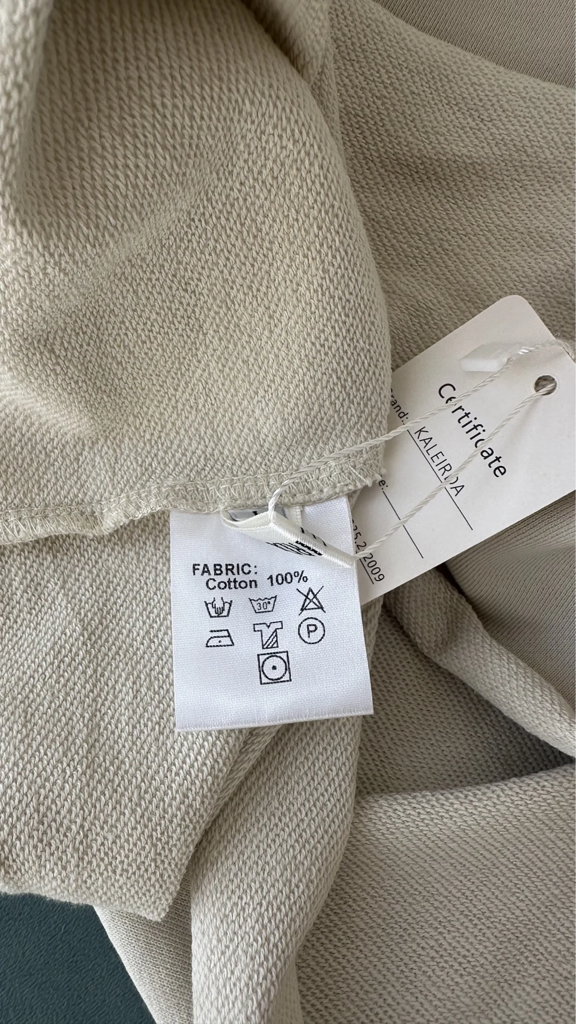 Отличный хлопковый костюм на теплую весну и лето)) На мои параметры 80/62/93 размер S сел свободно. У брюк снизу кулиски, которые при желании можно затянуть и получатся джоггеры. Если не затягивать, то на мой рост 165 см брюки длинные, лучше подойдут на рост от 170 см. Качество отличное. В составе 100% хлопок. Материал достаточно плотненький.