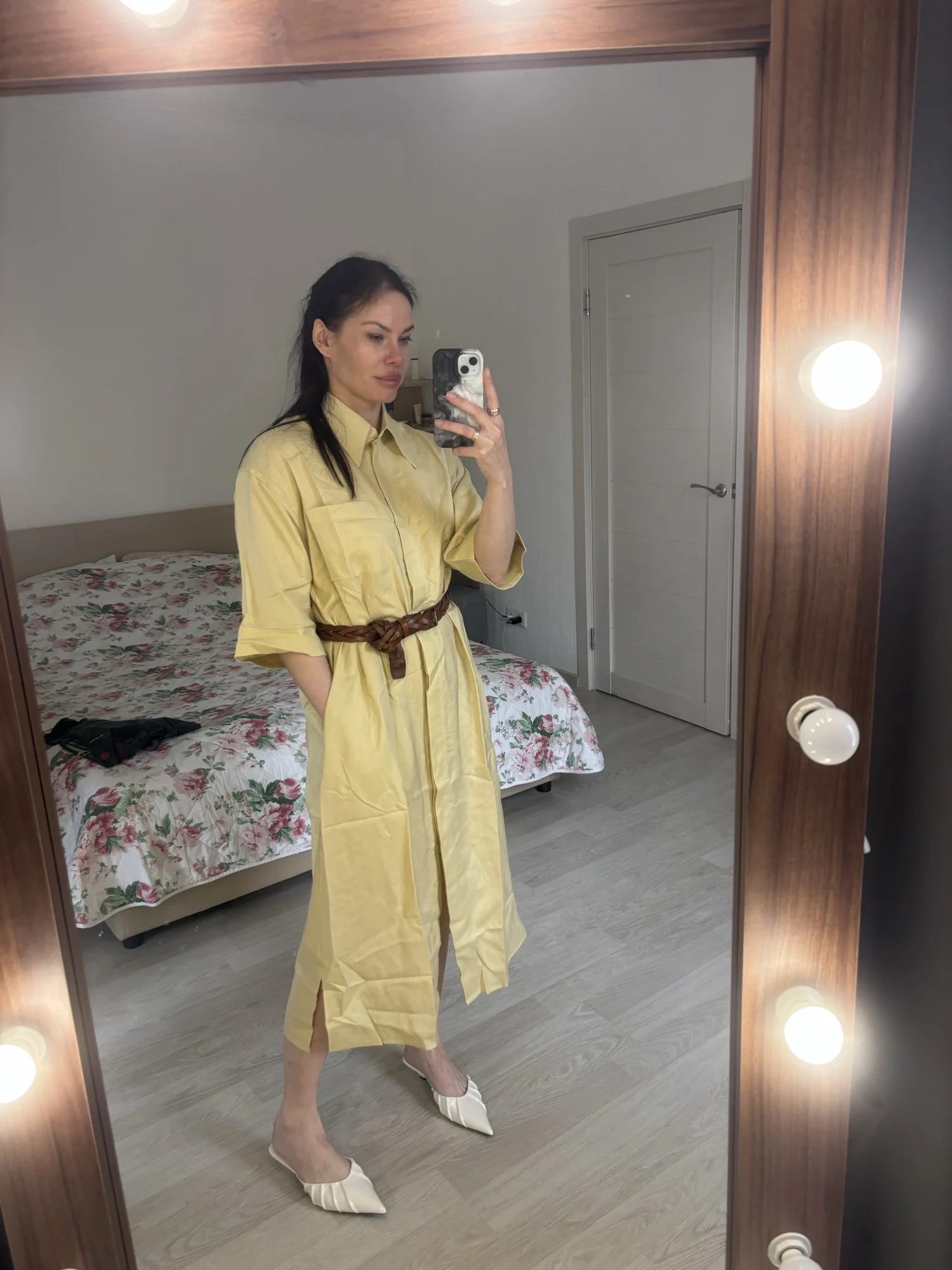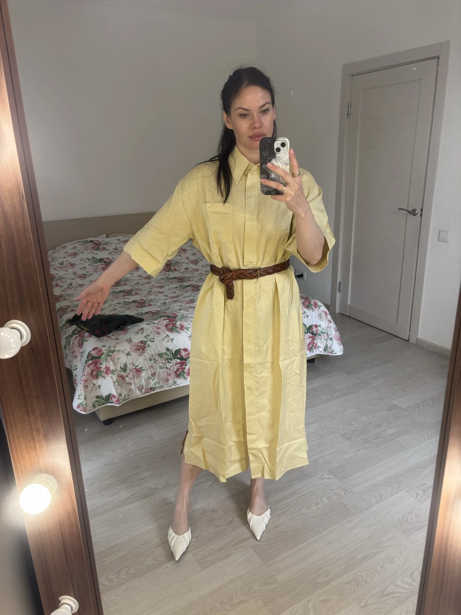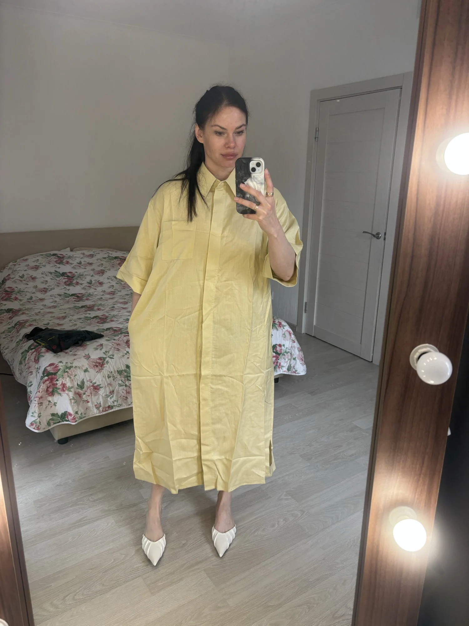 Больше обзоров и находок на моём канале Шикарное платье, на мой взгляд! Люблю прямой рубашечный крой, ибо с поясом смотрятся отлично и всегда можно "подстроить" под свою фигуру) На свои параметры 86-57-86 см и рост 165 см я взяла платье в размере S На выбор три расцветки Жёлтых оттенков ещё будет очень много в грядущих обзорах, поэтому я взяла Болотный На деле оттенок более яркий, насыщенный и по-настоящему летний Приходит платье с бирками магазина Составник подтверждает наличие льна, его здесь 30% Честно, я рада, что не все 100%: гладить проще, мнётся слабее На мой рост длина миди-макси, поэтому на девочек выше отлично подойдёт Материал за счёт льна немного грубоват, но тактильно - ок Не просвечивает👌🏻 Крой абсолютно прямой, а размер - огромный овер, что позволяет носить его как под пояс, так и без оного Мне, разумеется, с поясом нравится больше Застёгивается платья на пуговки, которые скрыты и не бросаются в глаза Длина на мой рост с запасом, рукав - 1/2 Линия плеча спущена Манжеты подвёрнуты, воротничок держит форму Что меня порадовало: наличие карманов! Нагрудный, конечно больше для декора, а вот боковые - моя любовь) Снизу есть небольшие разрезики Платье комфортное, посадка удобная Цвет - любовь Пошив фабричный, но с изнанки было несколько торчащих ниток, не критично Само платье понравилось и могу советовать к покупке! С поясом смотрится довольно стильно, плюс такой фасон никогда не выйдет из моды)