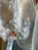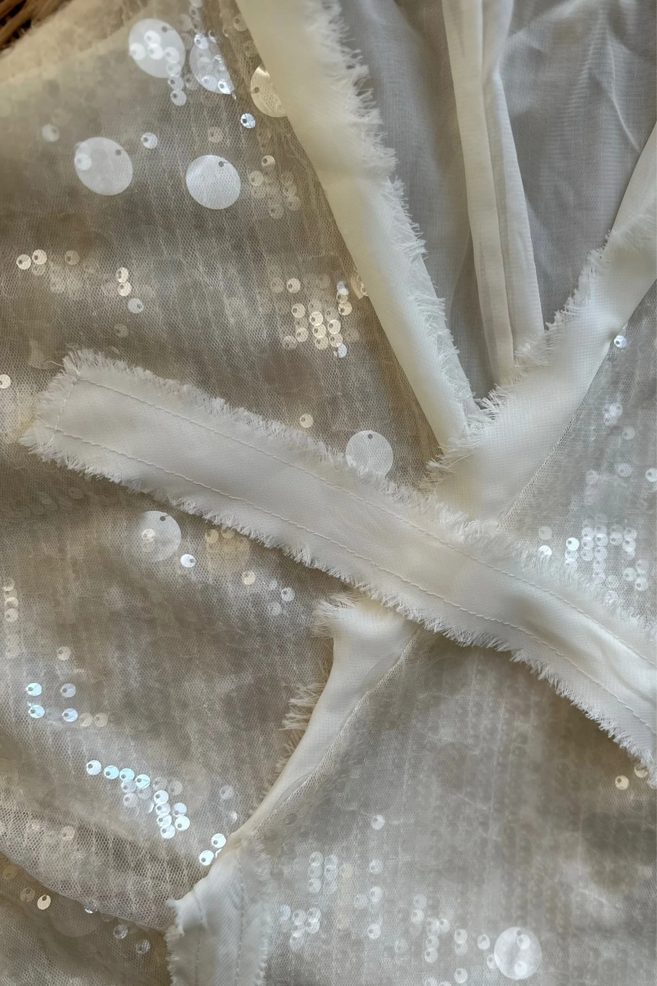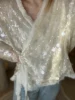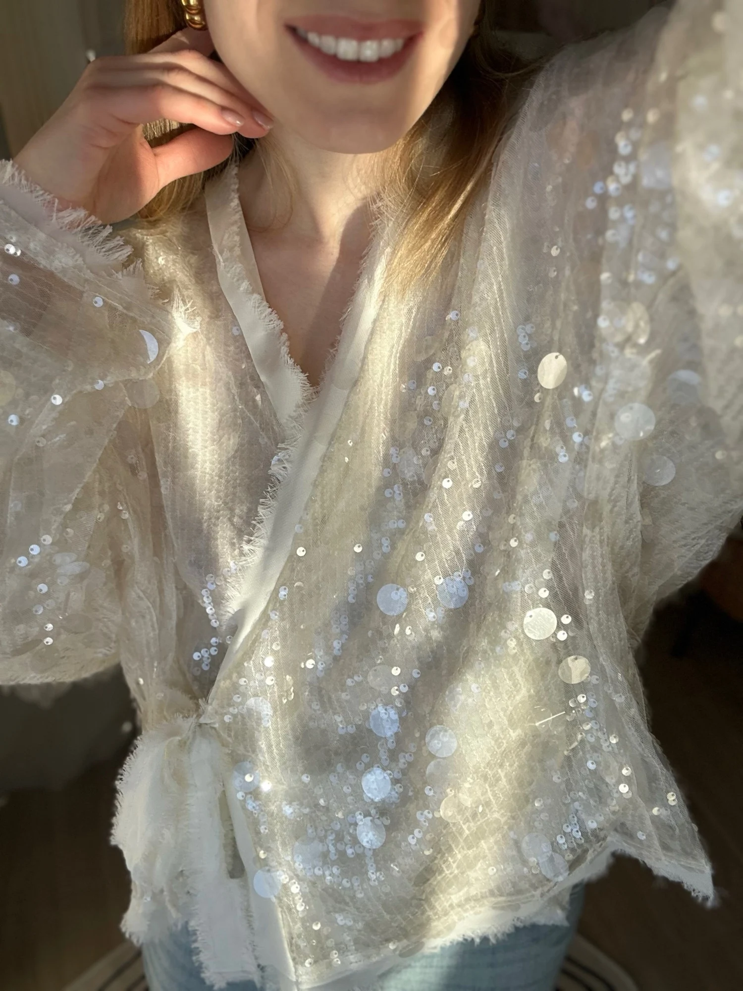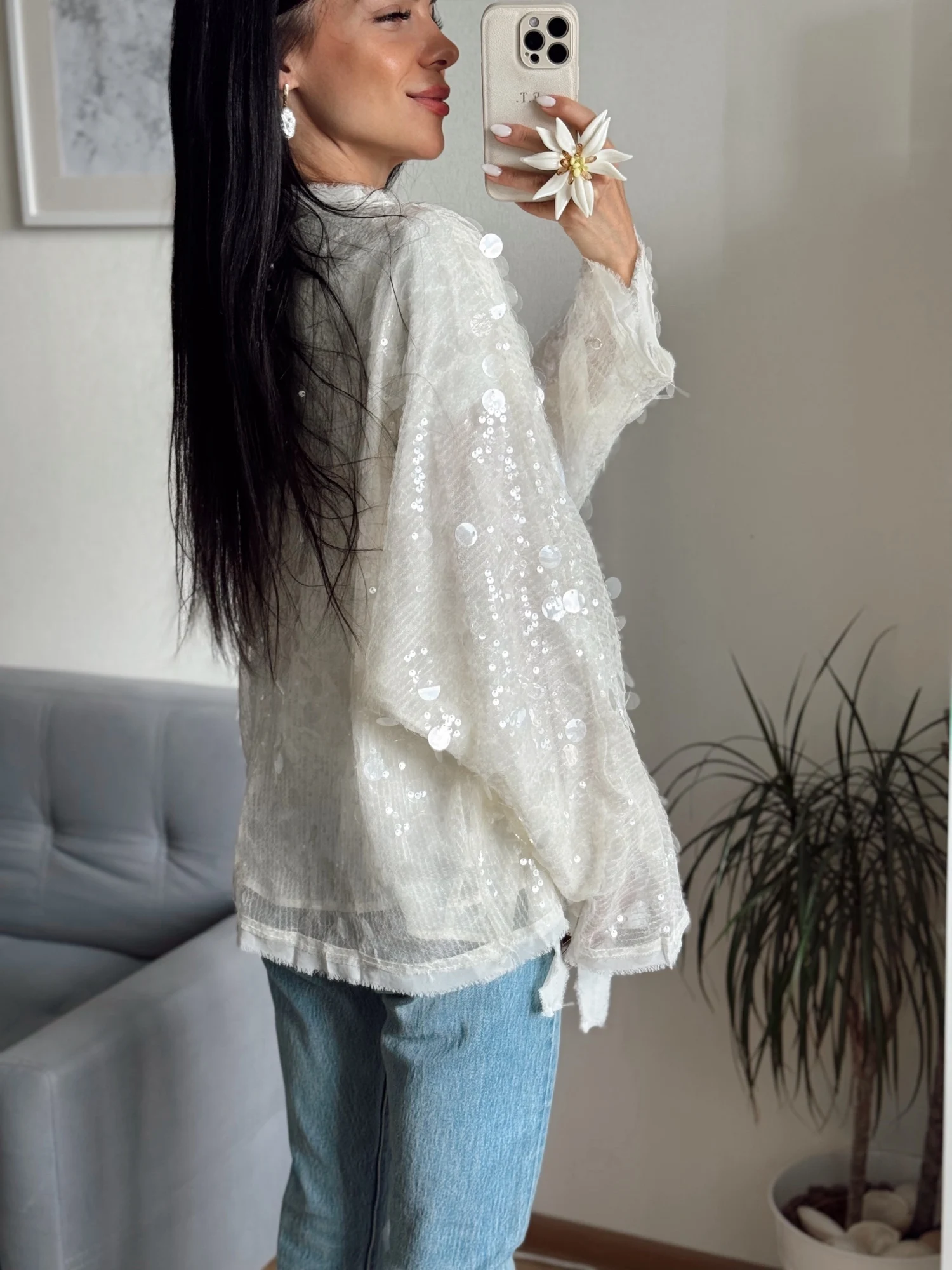 Просто нереальная кимоношка из пайеток! Рассказываю все как есть: Красивая- слов нет. Все пайетки и большие, и маленькие пришиты, за время получасовой фотосессии ни одна пайетка не слетела, из пакета доставала- тоже ничего. Все прикреплено надежно. За счет больших пайеток, которые выполнены из мягкого пластика, есть эффект кольчуги словно, накидка имеет вес, но дискомфорта нет) Рукав летучая мышь, очень красиво. Накидка состоит из двух слоев - внутри это подклад из шифона, сверху наслаивается еще слой из сетки, на который и пришиты все пайетки, так что блуза немного просвечивает. Две пары завязок, внутри и снаружи, благодаря этому можно завязывать как душе угодно, либо носить вообще нараспашку) Очень симпатичный необработанный край на вороте, на рукавах и на завязках. Качество на 4+, внутри есть небольшие торчащие нитки, но этого не видно. Надеюсь необработанный шифон не расползется. Для меня не колется совершенно, маленькие пайетки пришиты намертво, большие мягкие, слой шифона защищает тело, на фото у меня ничего не поддето, все комфортно! Во всем остальном она просто роскошная! на мне размер XS, очень объемная, мои параметры 159, 84-72-93.