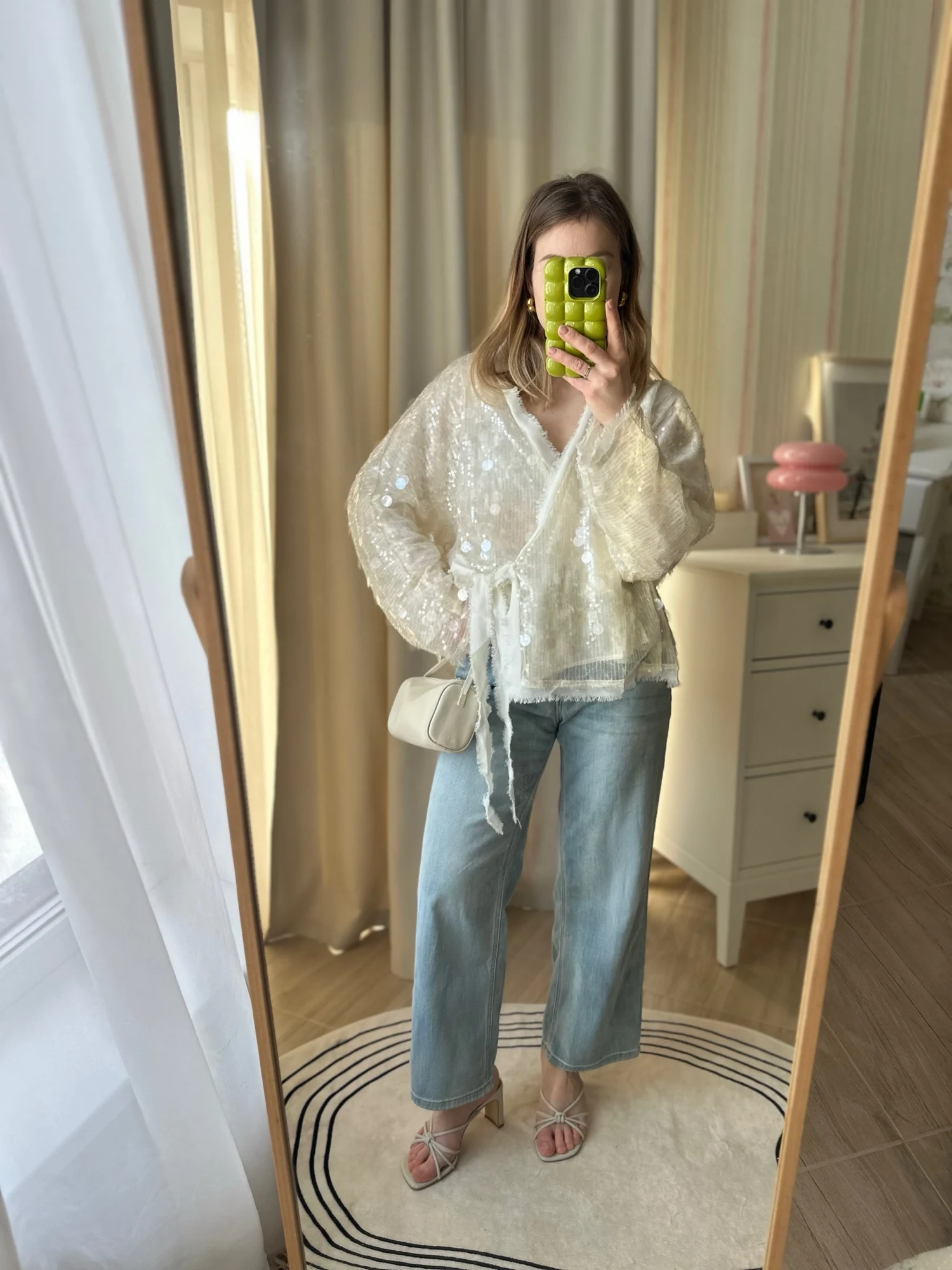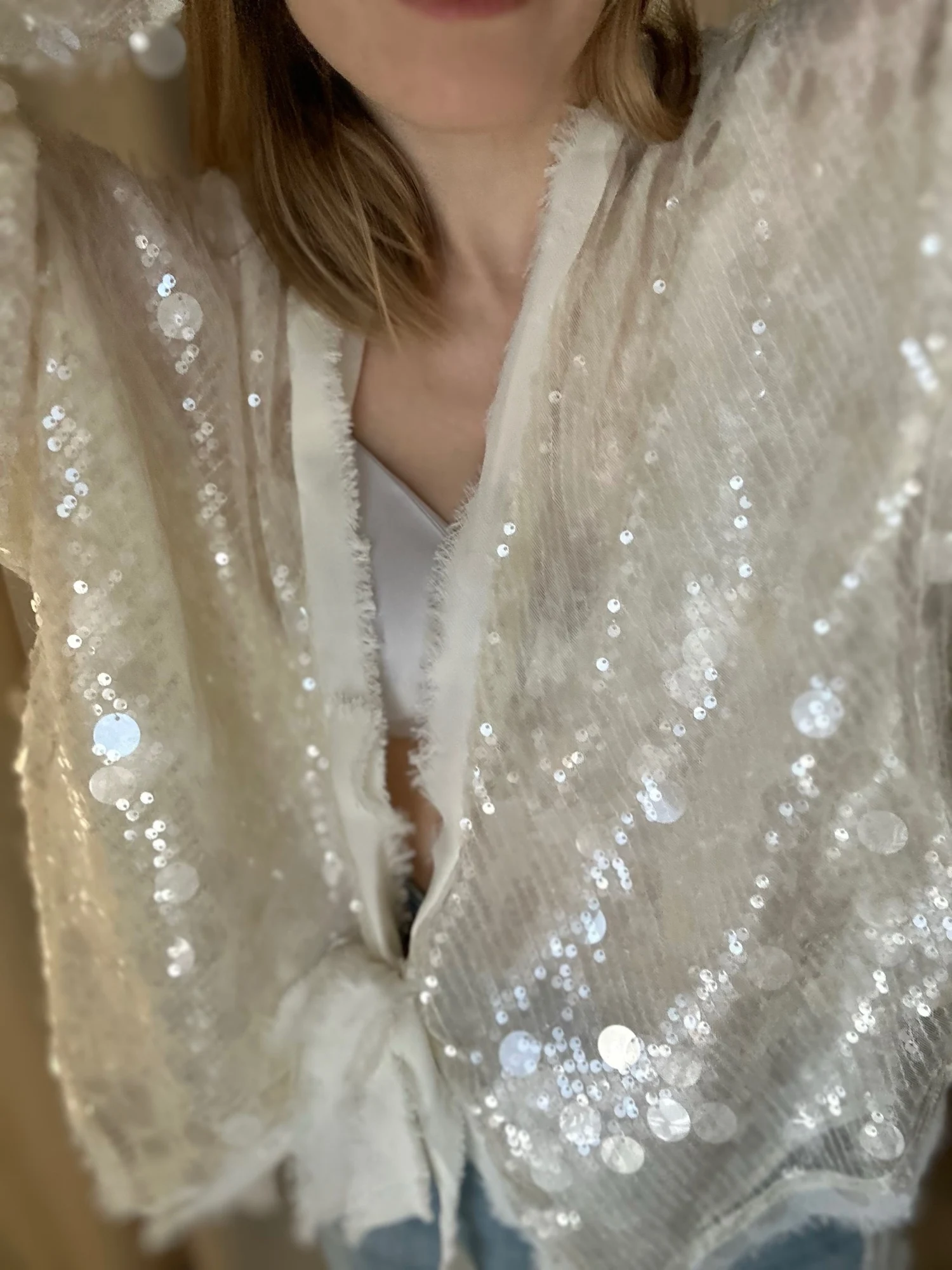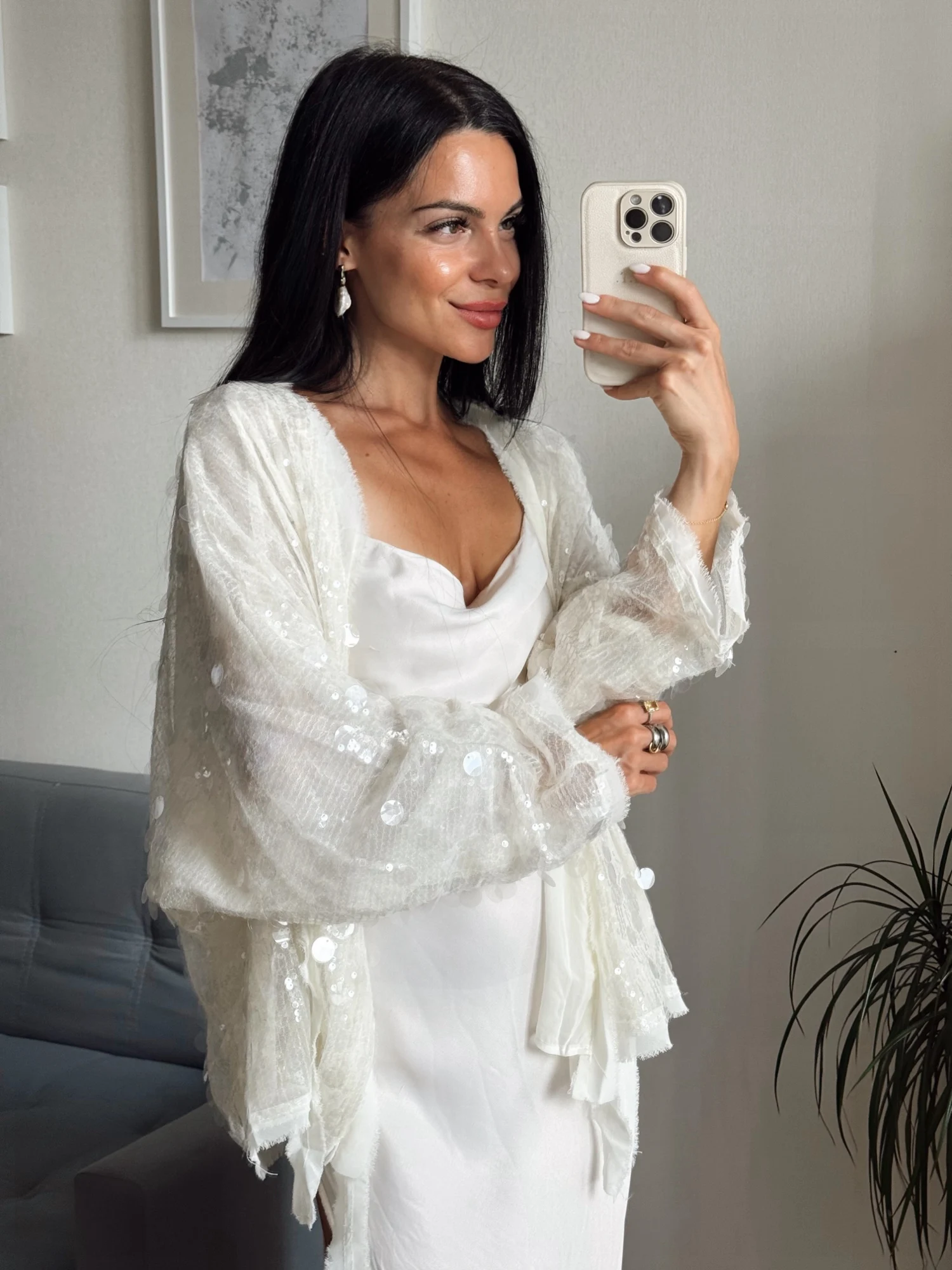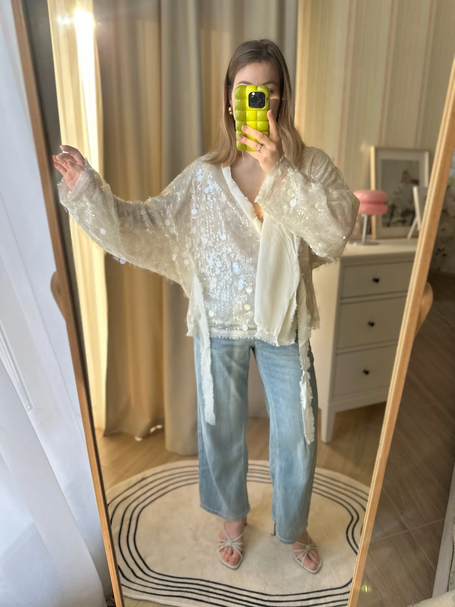 Шикарный Кардиган -Кимоно ! Больше Стильных находок и Обзоров Вы найдете на моем Kaнале ! ⚪️Оправдал все мои ожидания : аккуратный , увесистый , фасон очень интересный и необычный ⚪️На мне размер M ( хотела хороший оверсайз , чтобы носить как накидку - жакет ) ⚪️Пайетки неброские , прозрачные , что делает его максимально аккуратным и элегантным ! ⚪️Стилизуется со всем : от Джинсов и базовой футболки - до вечерних нарядов ! Так же в образах засветились : Этот кардиган — тот самый редкий случай, когда блеск не обязывает, а расслабляет.!))