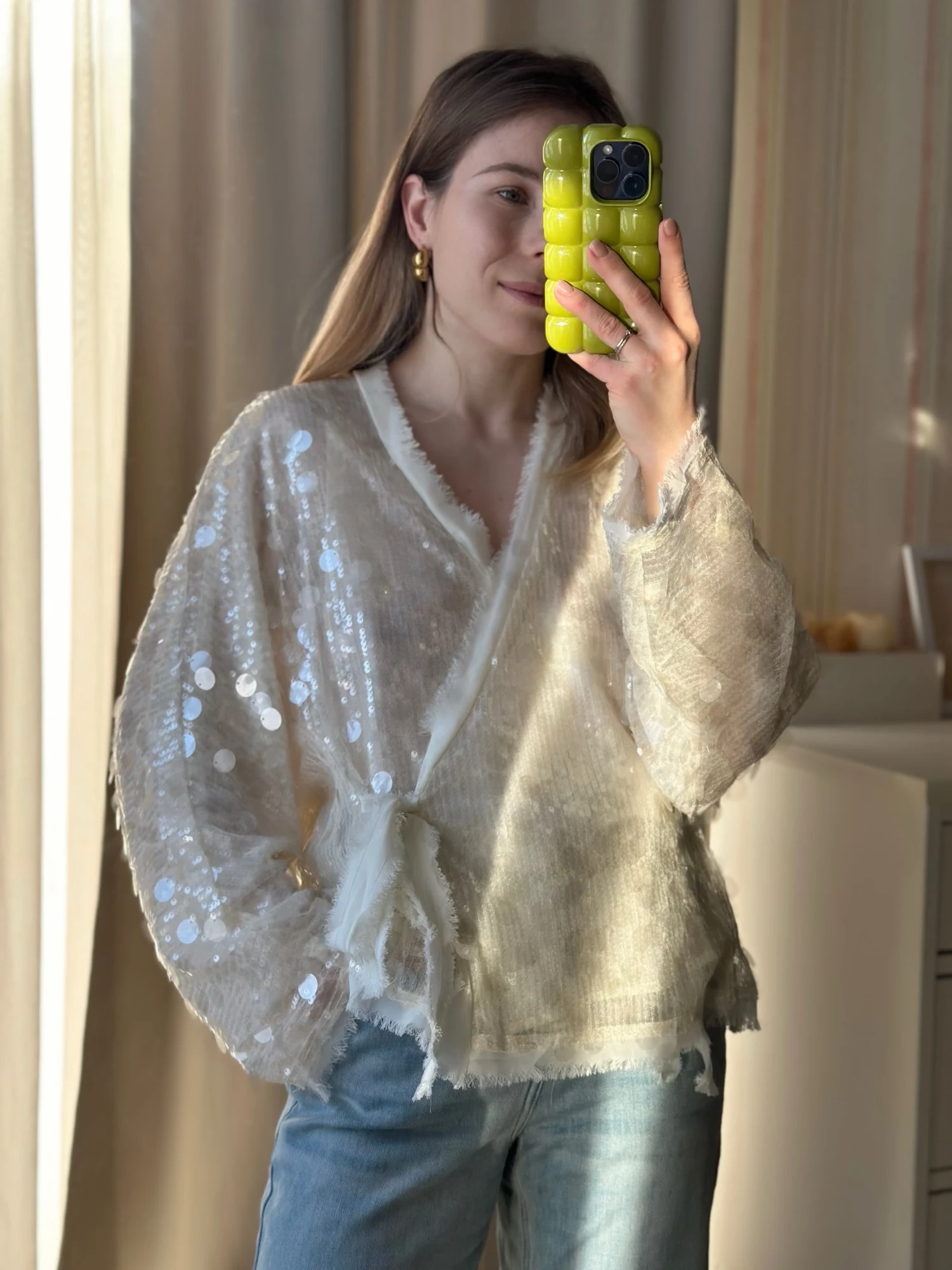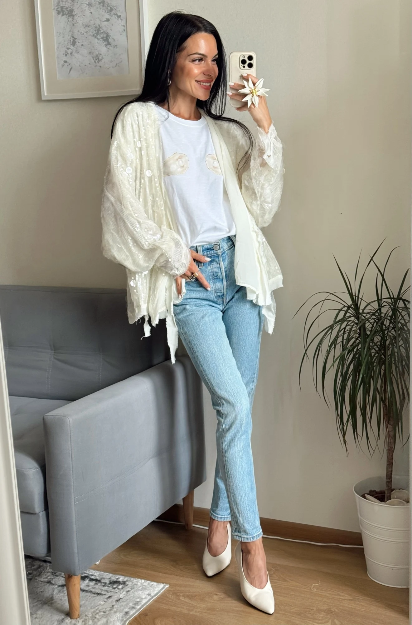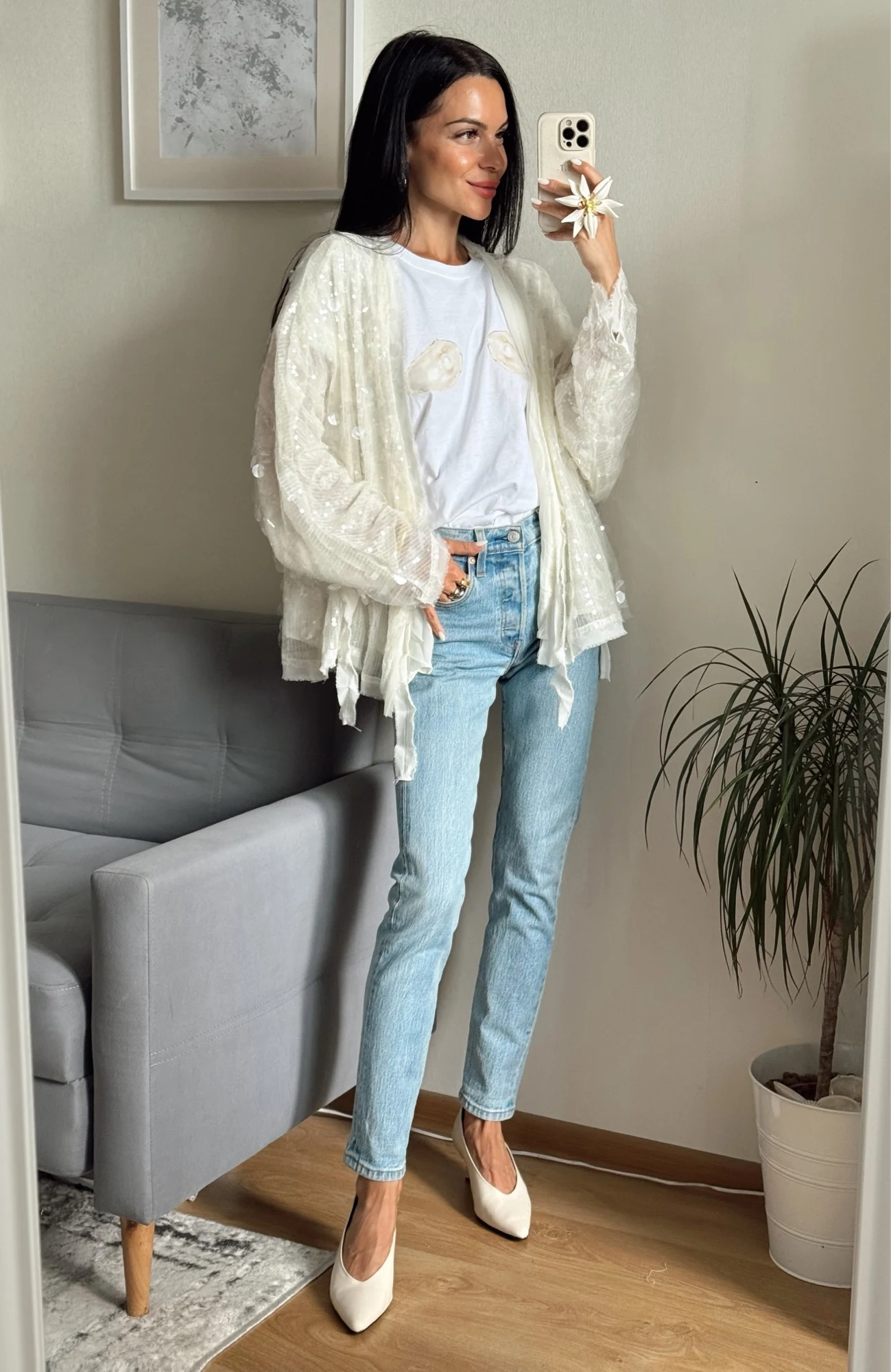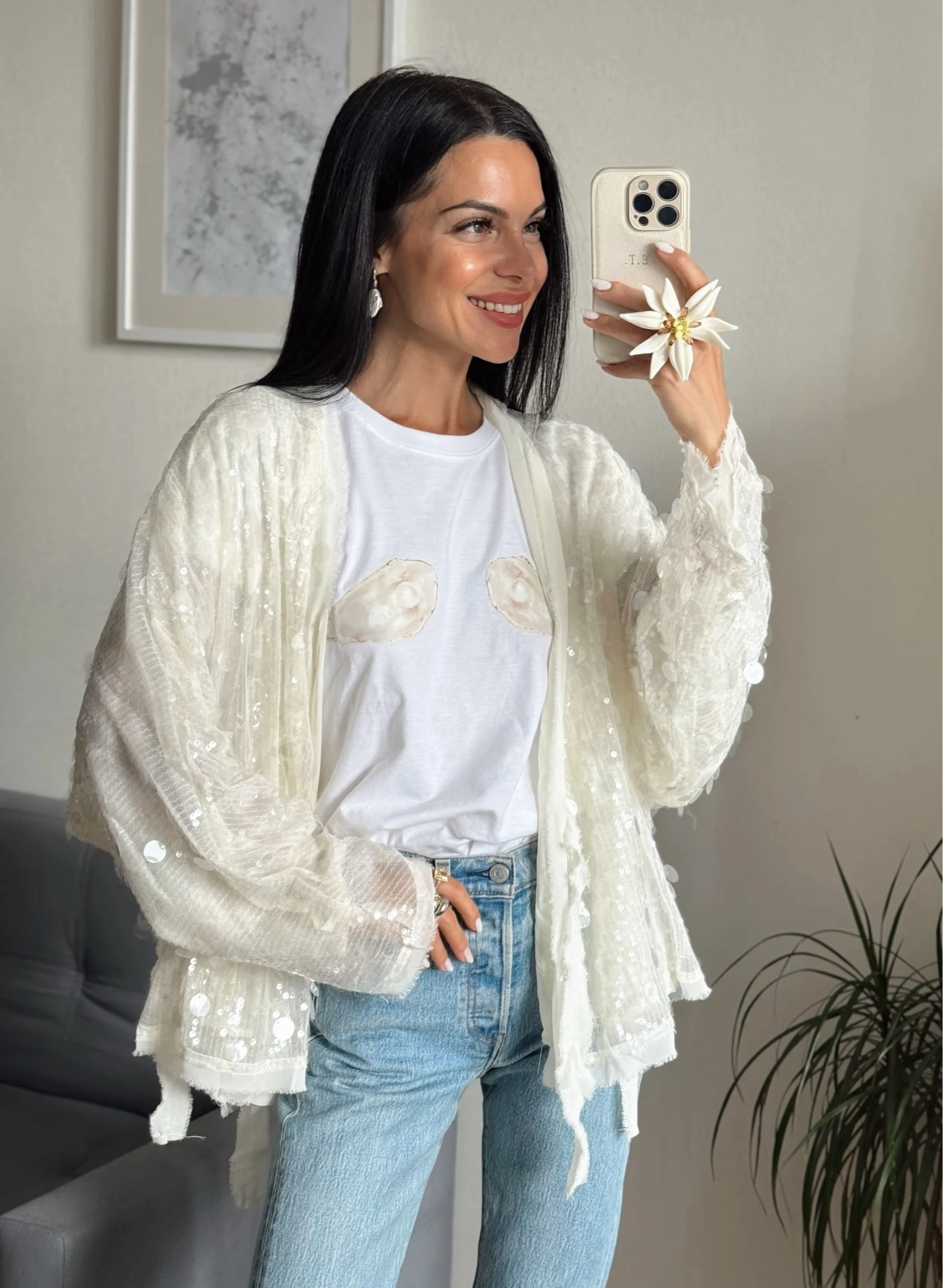 Шикарный Кардиган -Кимоно ! Больше Стильных находок и Обзоров Вы найдете на моем Kaнале ! ⚪️Оправдал все мои ожидания : аккуратный , увесистый , фасон очень интересный и необычный ⚪️На мне размер M ( хотела хороший оверсайз , чтобы носить как накидку - жакет ) ⚪️Пайетки неброские , прозрачные , что делает его максимально аккуратным и элегантным ! ⚪️Стилизуется со всем : от Джинсов и базовой футболки - до вечерних нарядов ! Так же в образах засветились : Этот кардиган — тот самый редкий случай, когда блеск не обязывает, а расслабляет.!))